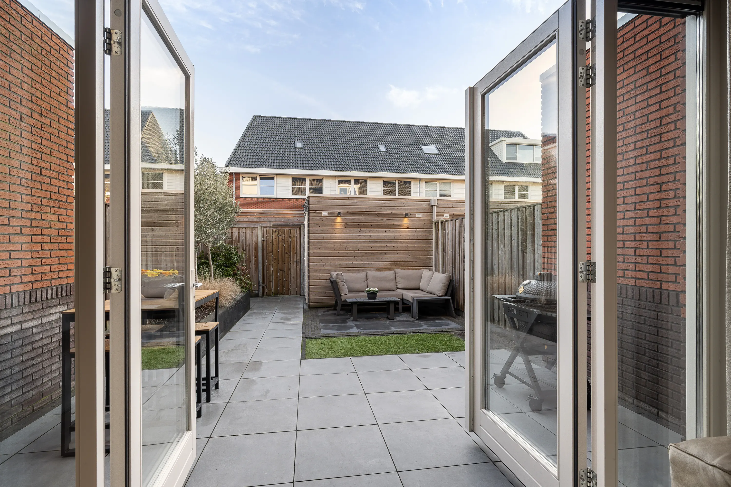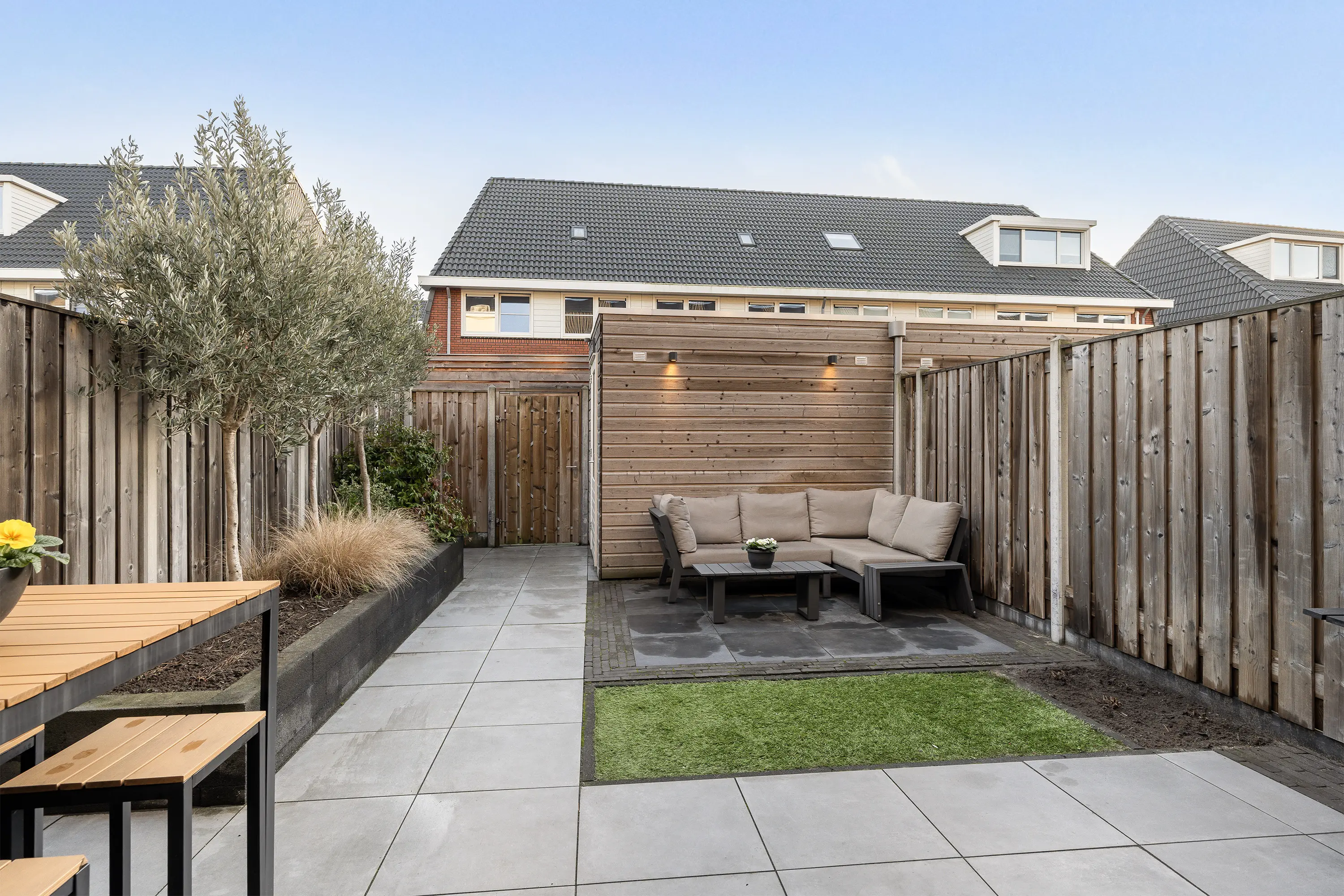 De zonnige achtertuin is gelegen op het zuiden en biedt volop mogelijkheden om meerdere zitplekken te creëren. In de tuin bevindt zich tevens een houten berging, ideaal voor het stallen van fietsen of een scooter. De berging is ook bereikbaar via de praktische achterom.