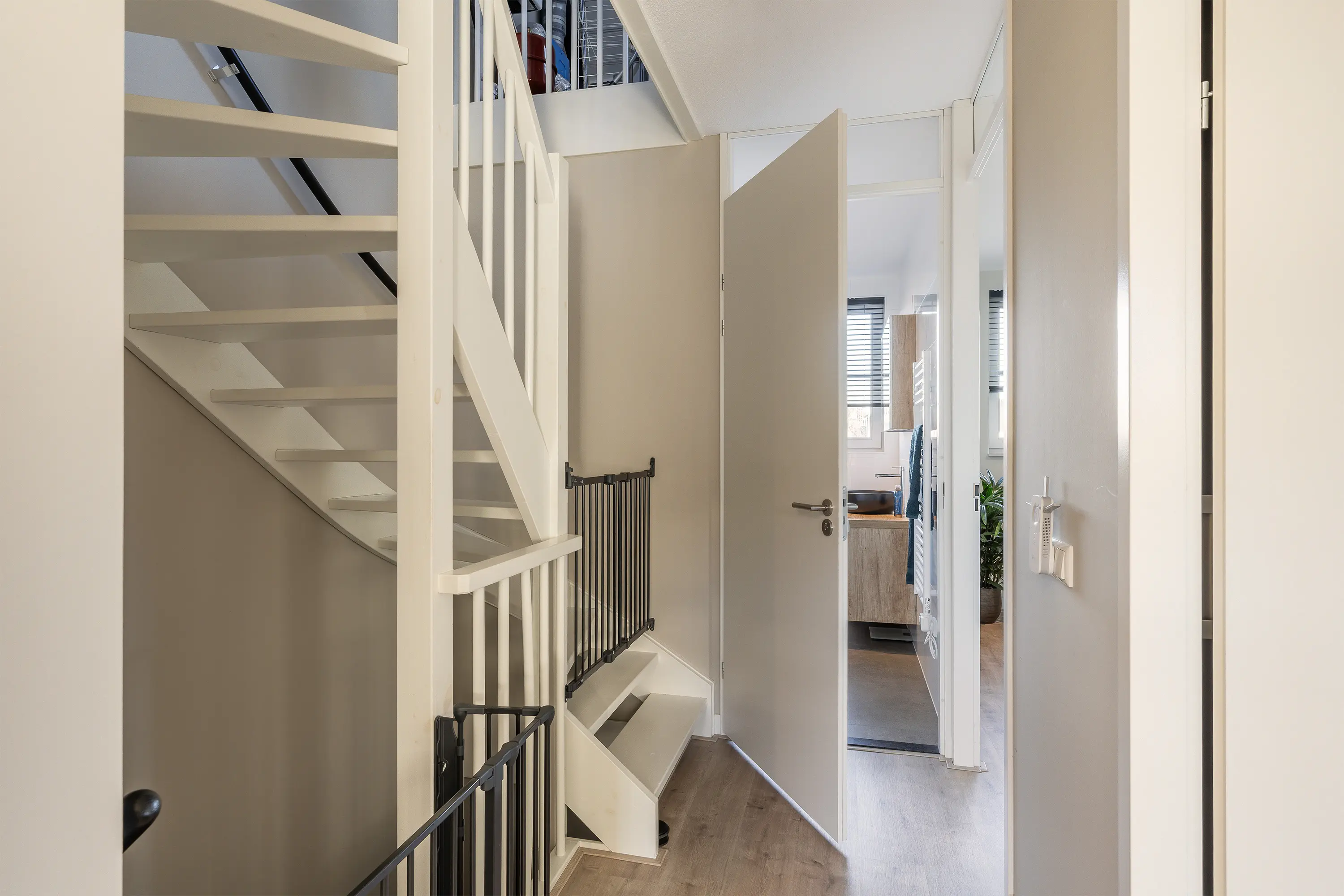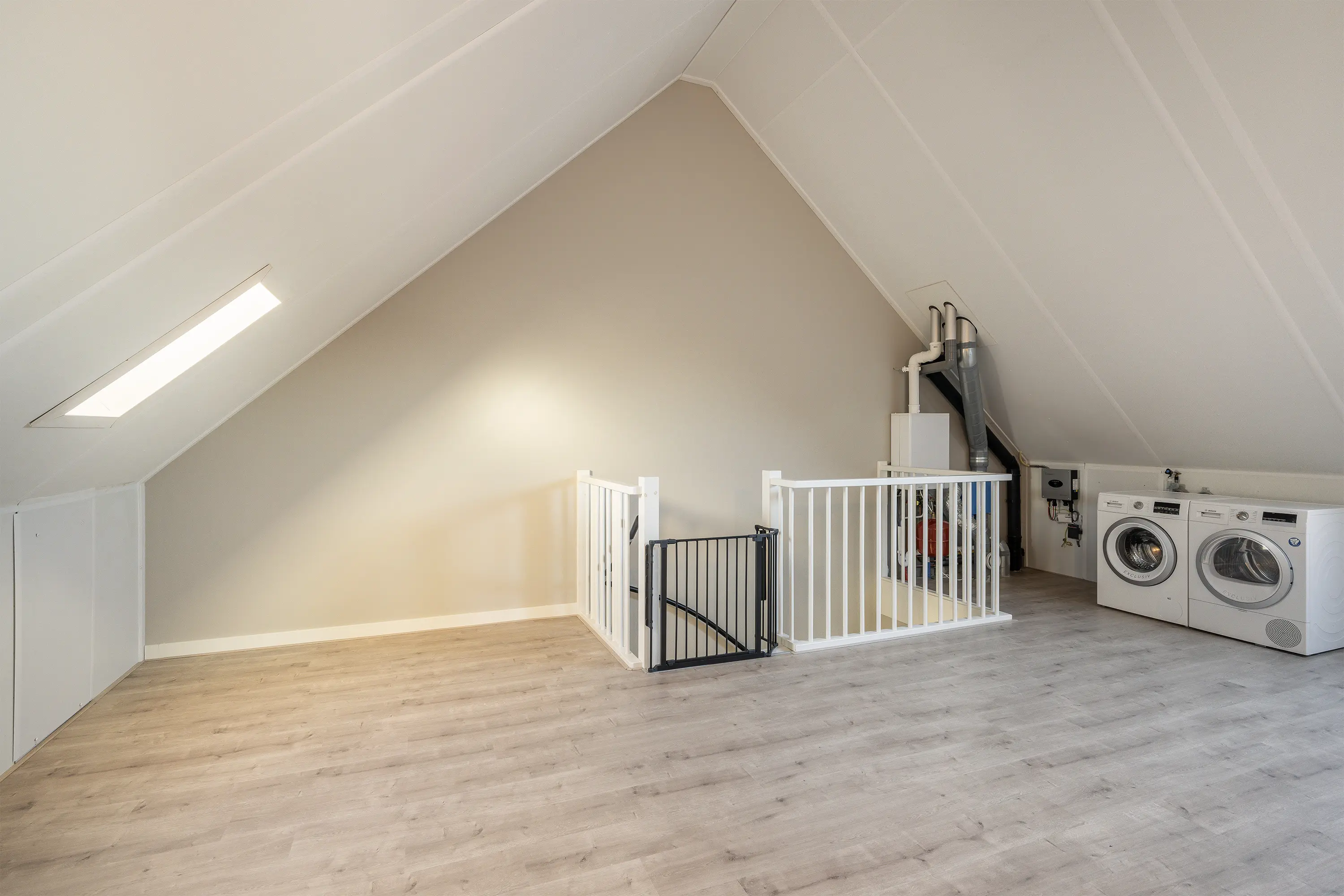 Daarnaast bevinden zich op deze verdieping de aansluitingen voor de wasmachine en droger, evenals de cv-installatie.