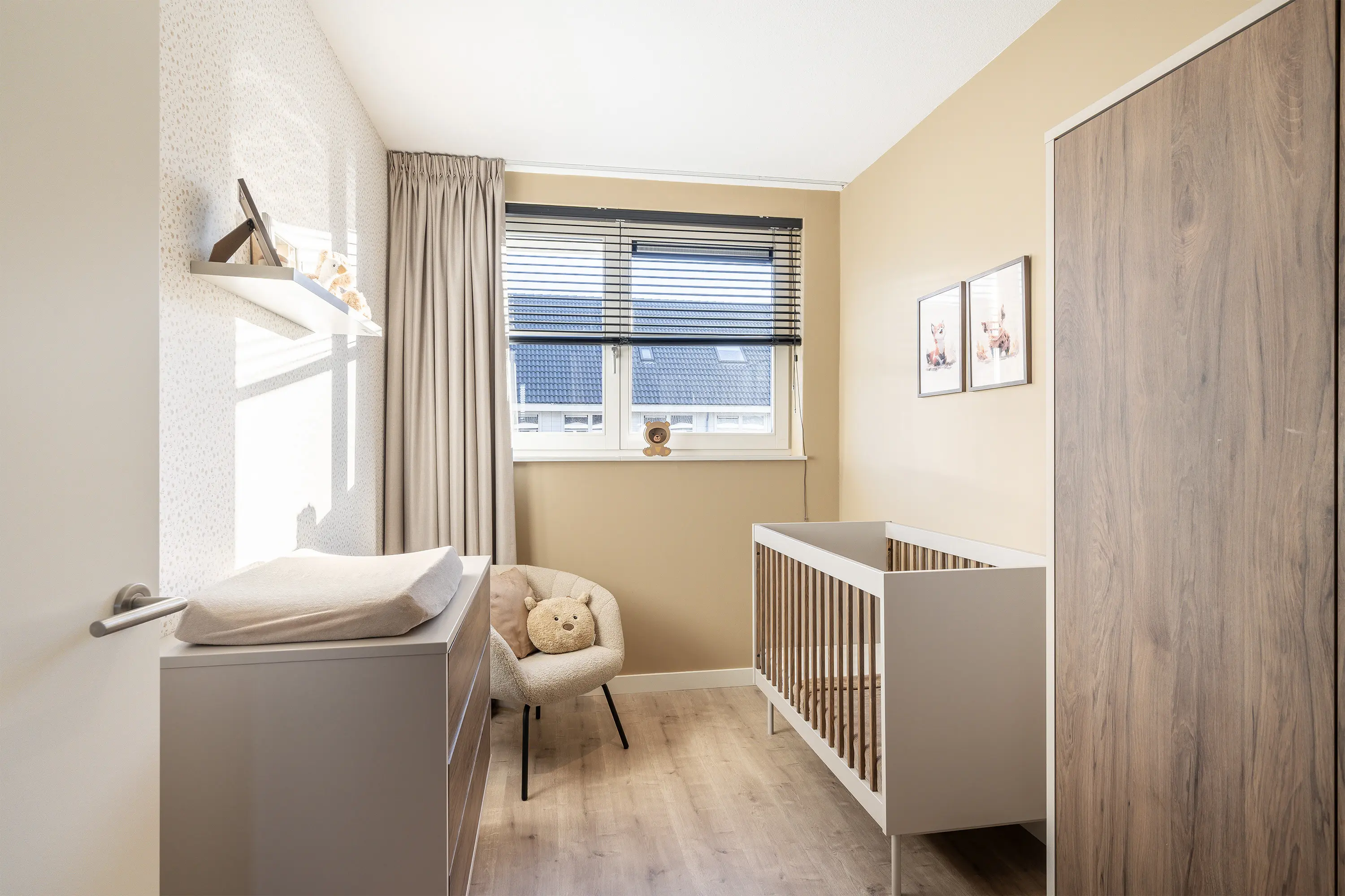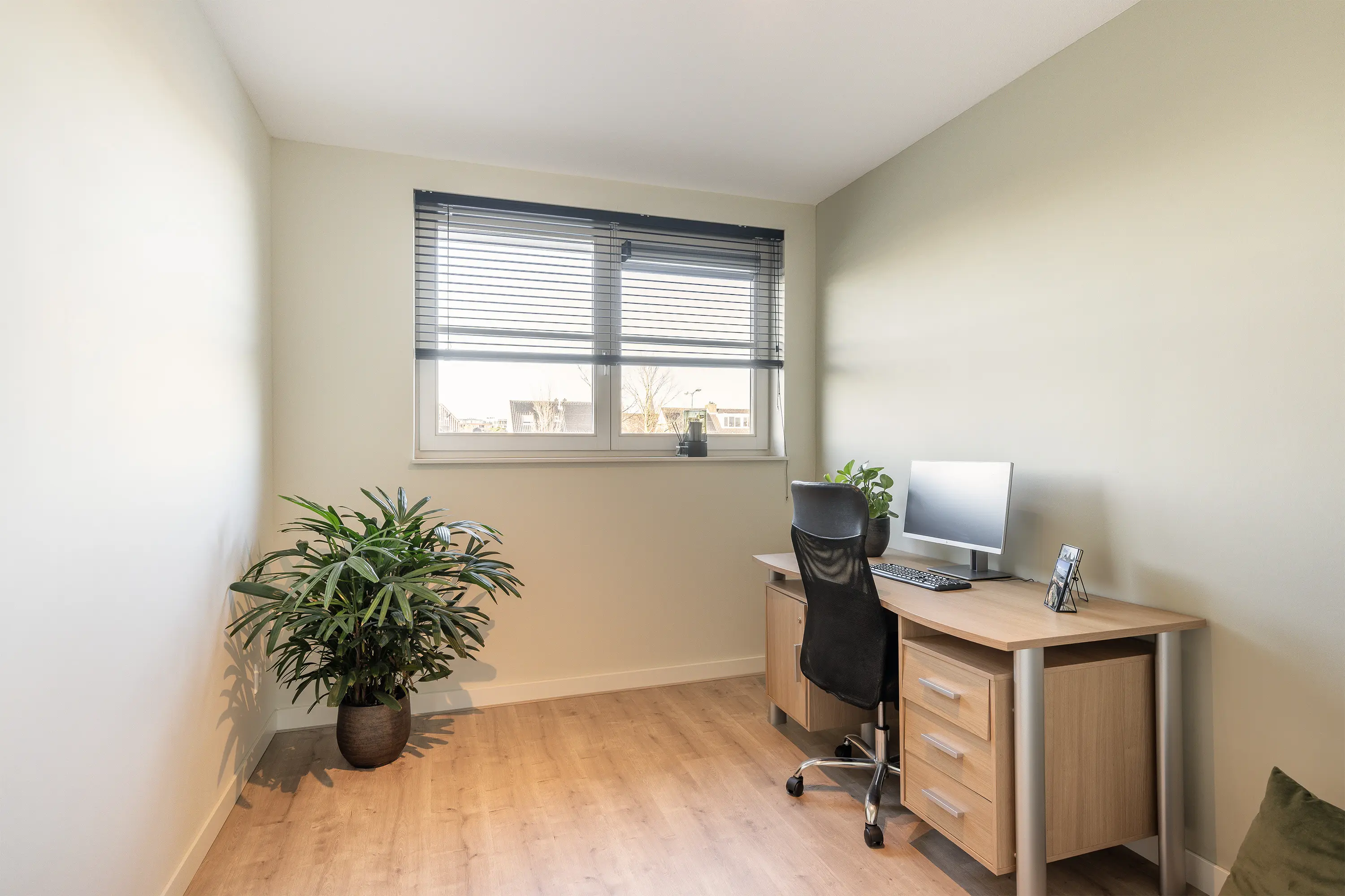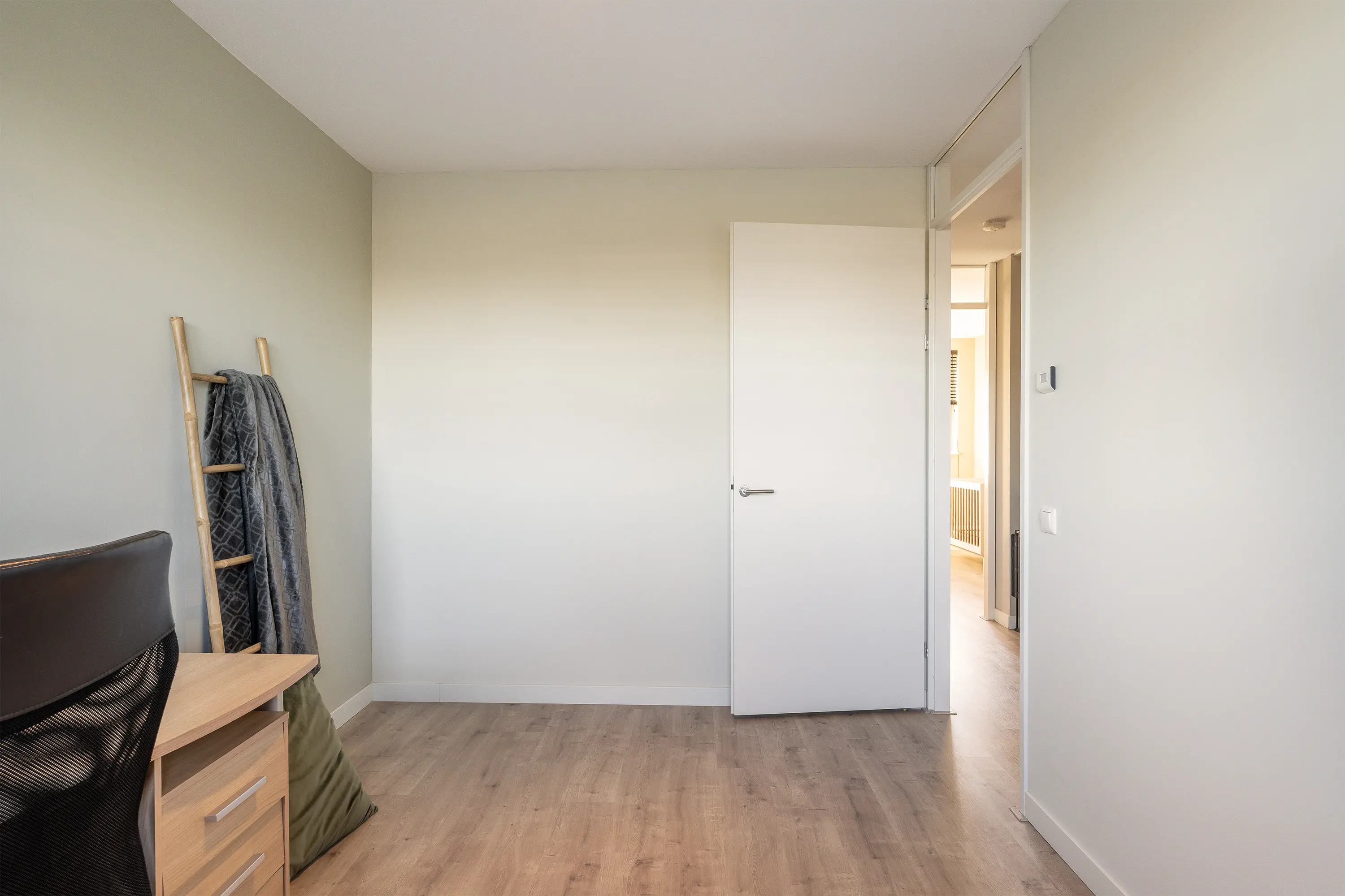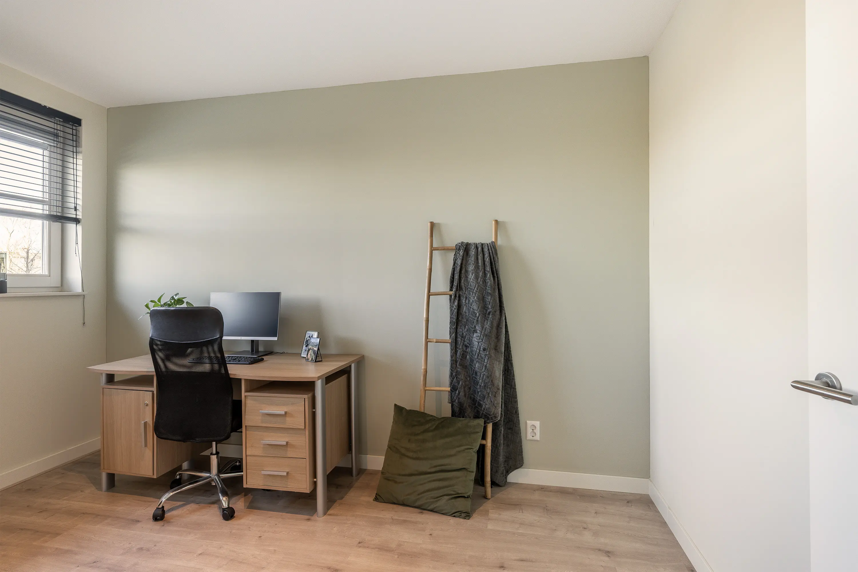 De derde (slaap)kamer is gelegen aan de voorzijde van de woning en wordt momenteel gebruikt als werkplek/kantoor. Dankzij het ruime formaat en de goede lichtinval is deze kamer ook uitstekend geschikt als volwaardige slaapkamer.