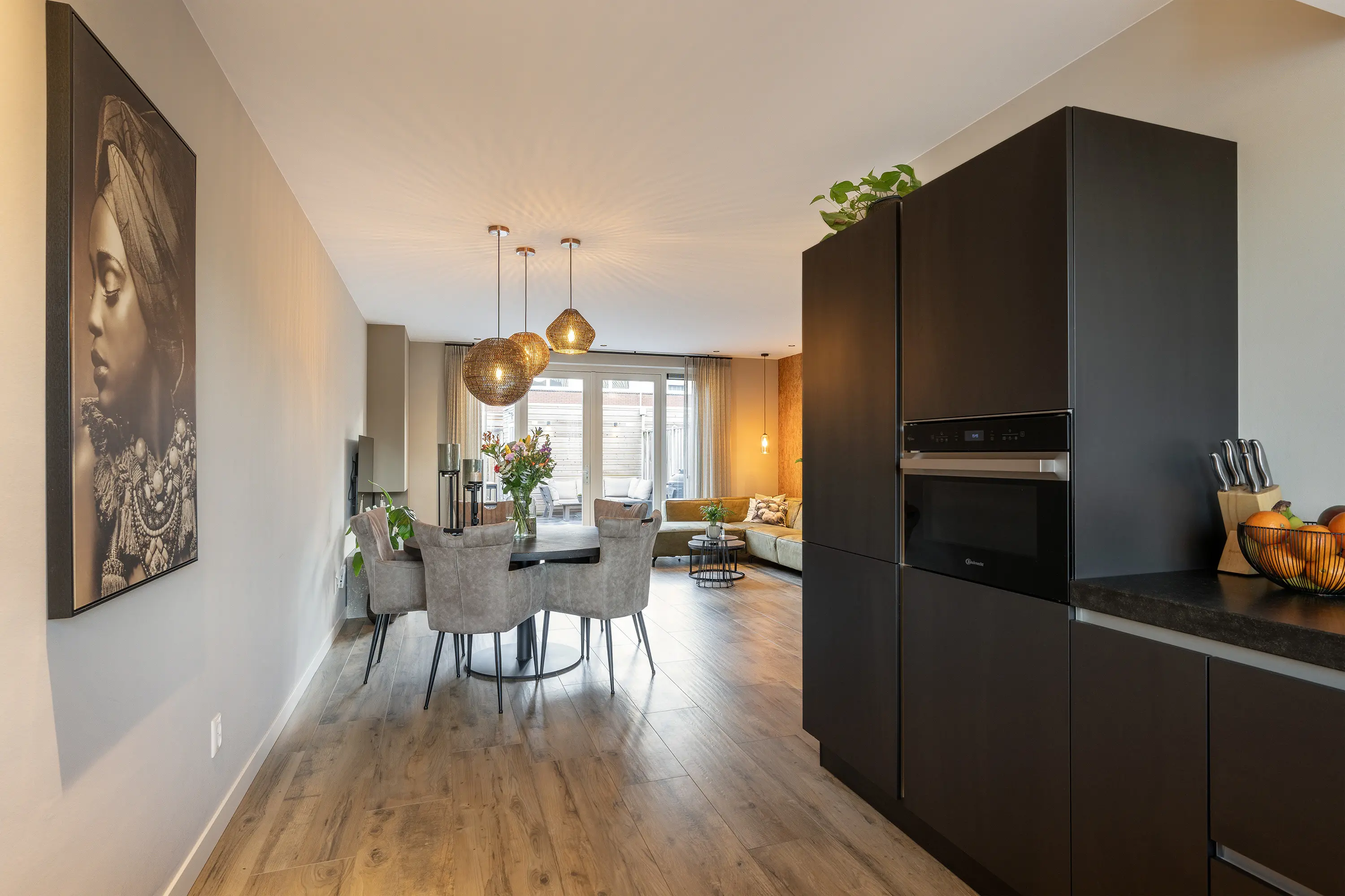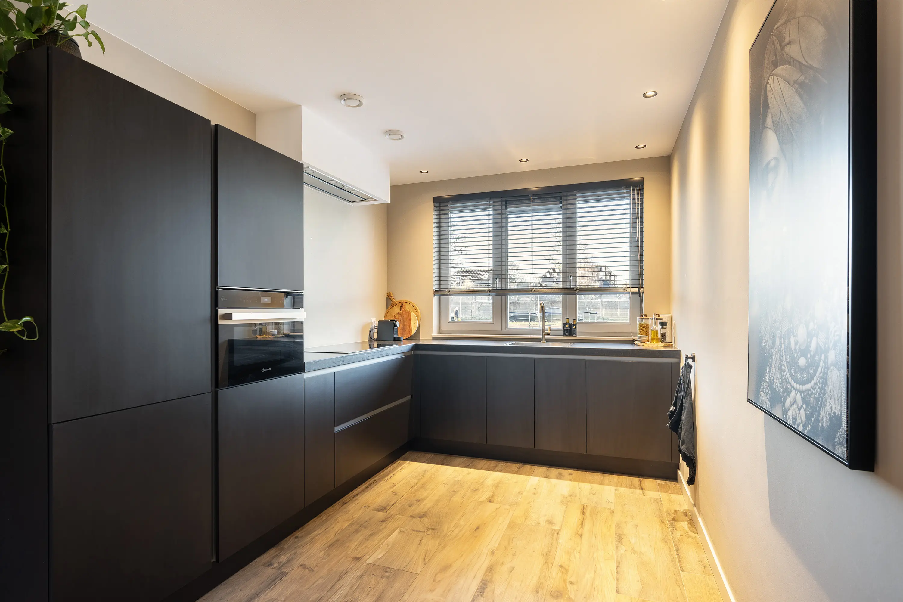 Aan de voorzijde van de woning bevindt zich de eethoek, die in open verbinding staat met de keuken. De moderne open keuken is uitgevoerd in mat zwart en voorzien van een zwart stenen werkblad. Daarnaast beschikt de keuken over diverse inbouwapparatuur, waaronder een inductiekookplaat, afzuiginstallatie, combi-oven, koelkast, vriezer en vaatwasser.