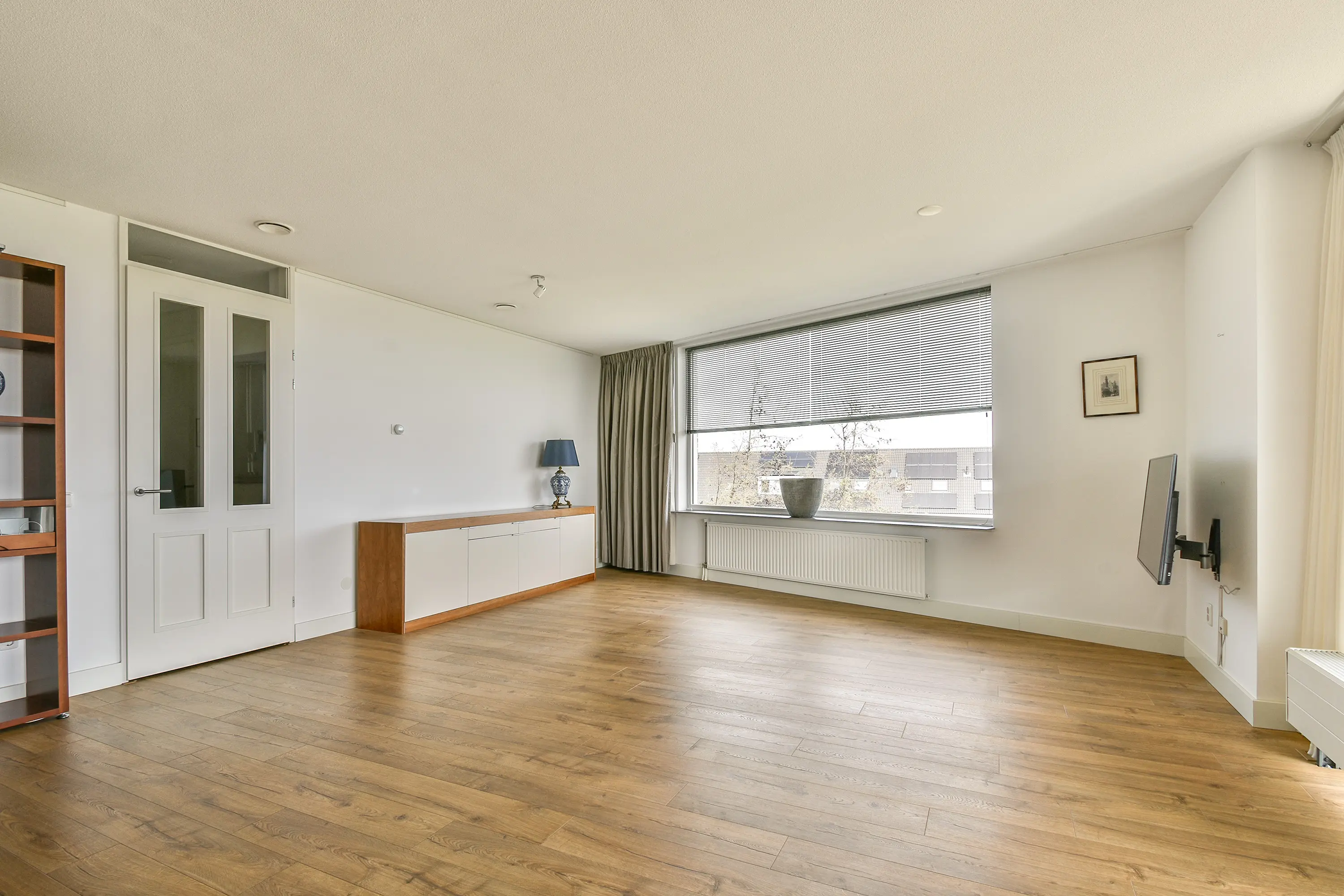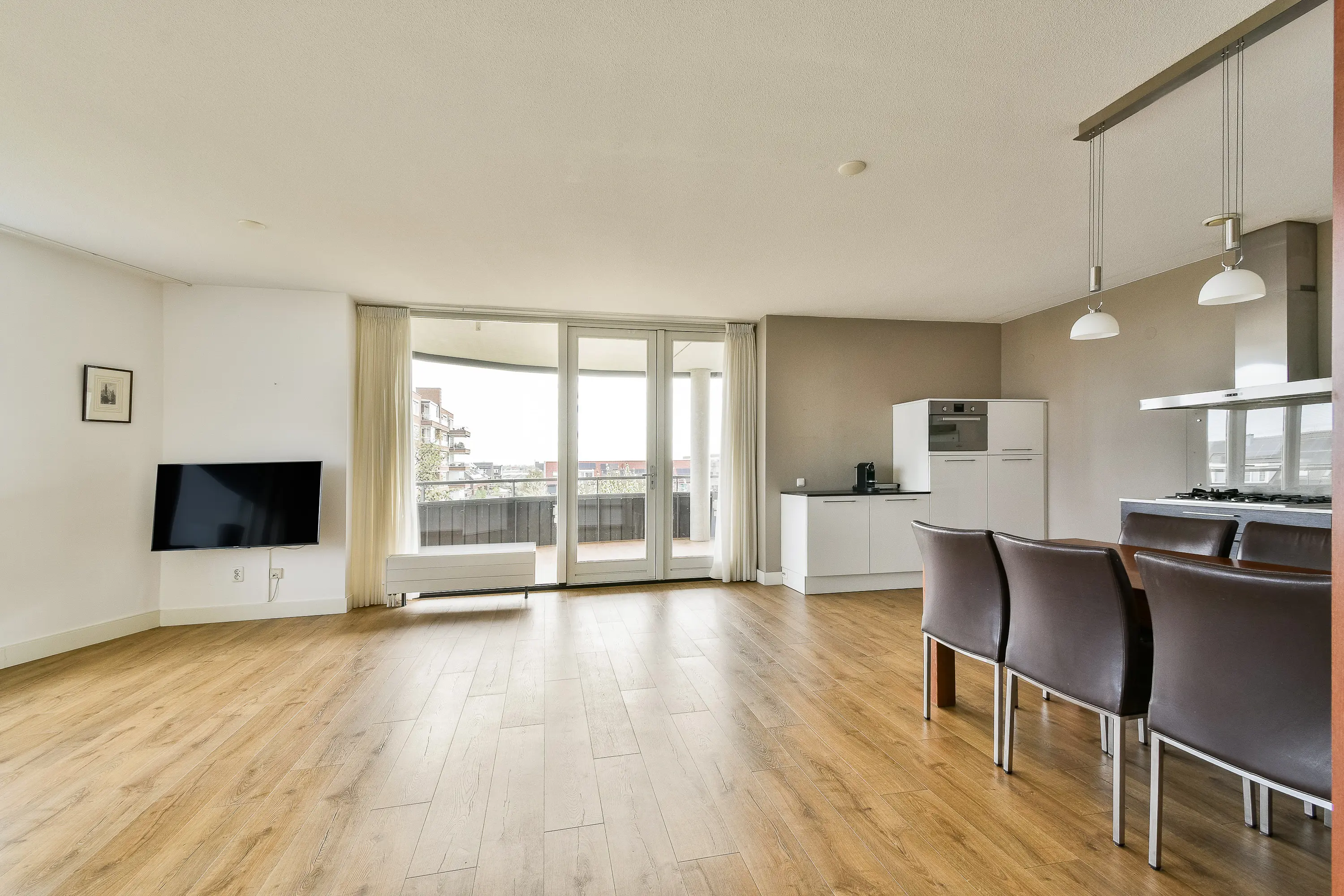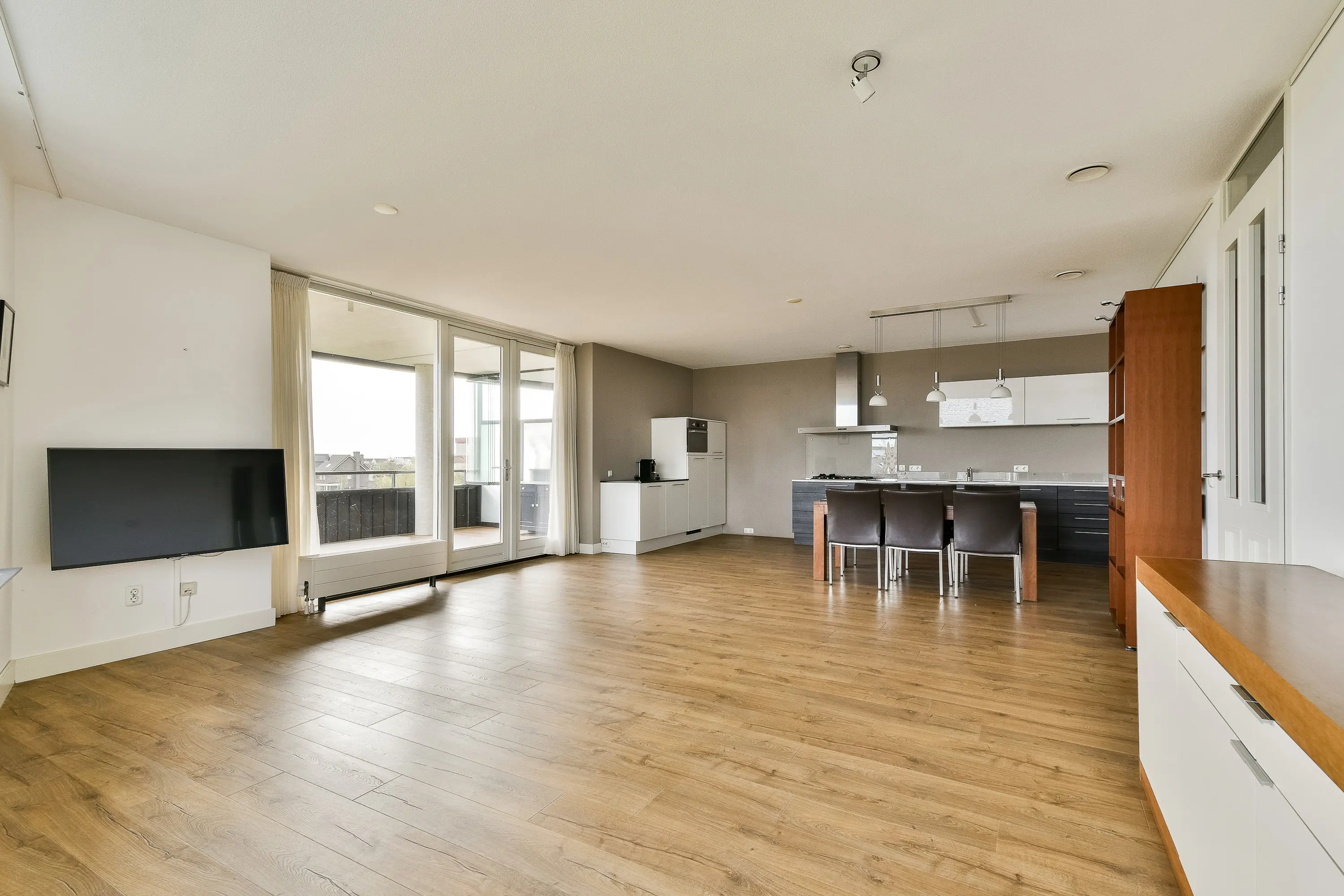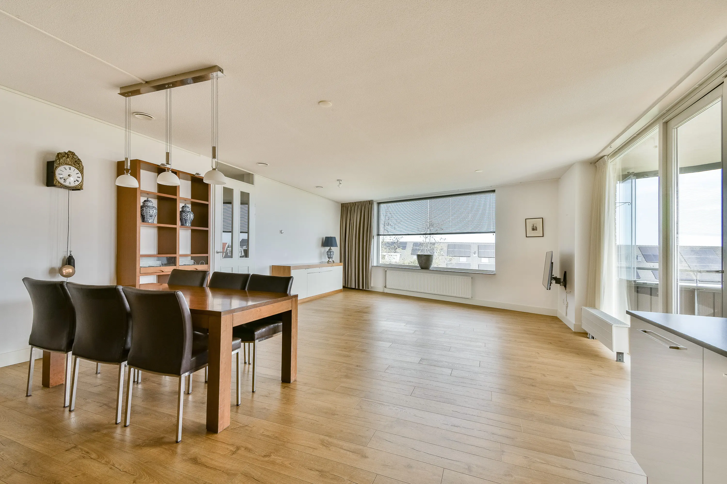 De royale en bijzonder lichte woonkamer biedt een prachtig vrij uitzicht over de omgeving en vormt het hart van de woning. Dankzij de openslaande deuren heeft u direct toegang tot het ruime balkon (ca. 16 m²), dat is voorzien van balkonbeglazing. Hierdoor kunt u al vroeg in het jaar genieten van het buitenleven, beschut en uit de wind.