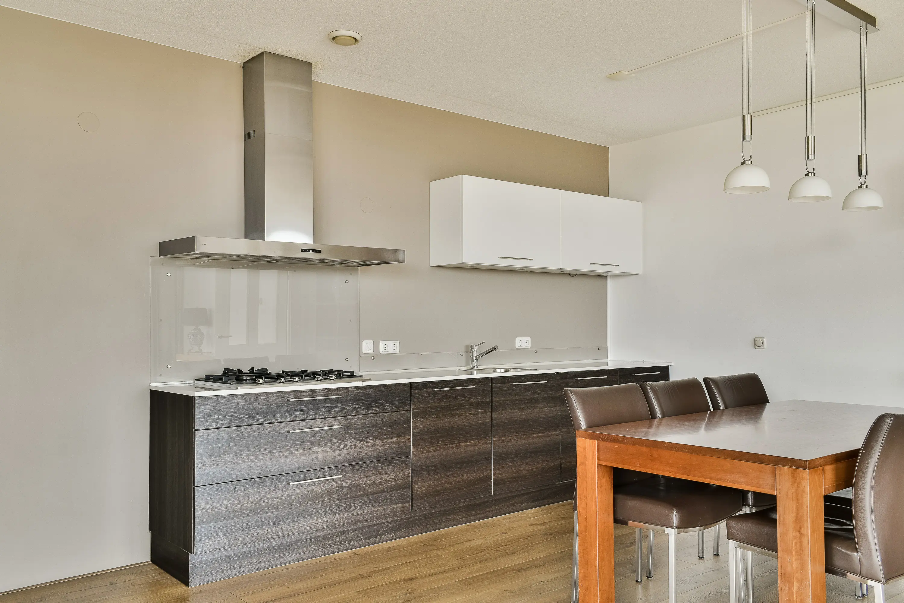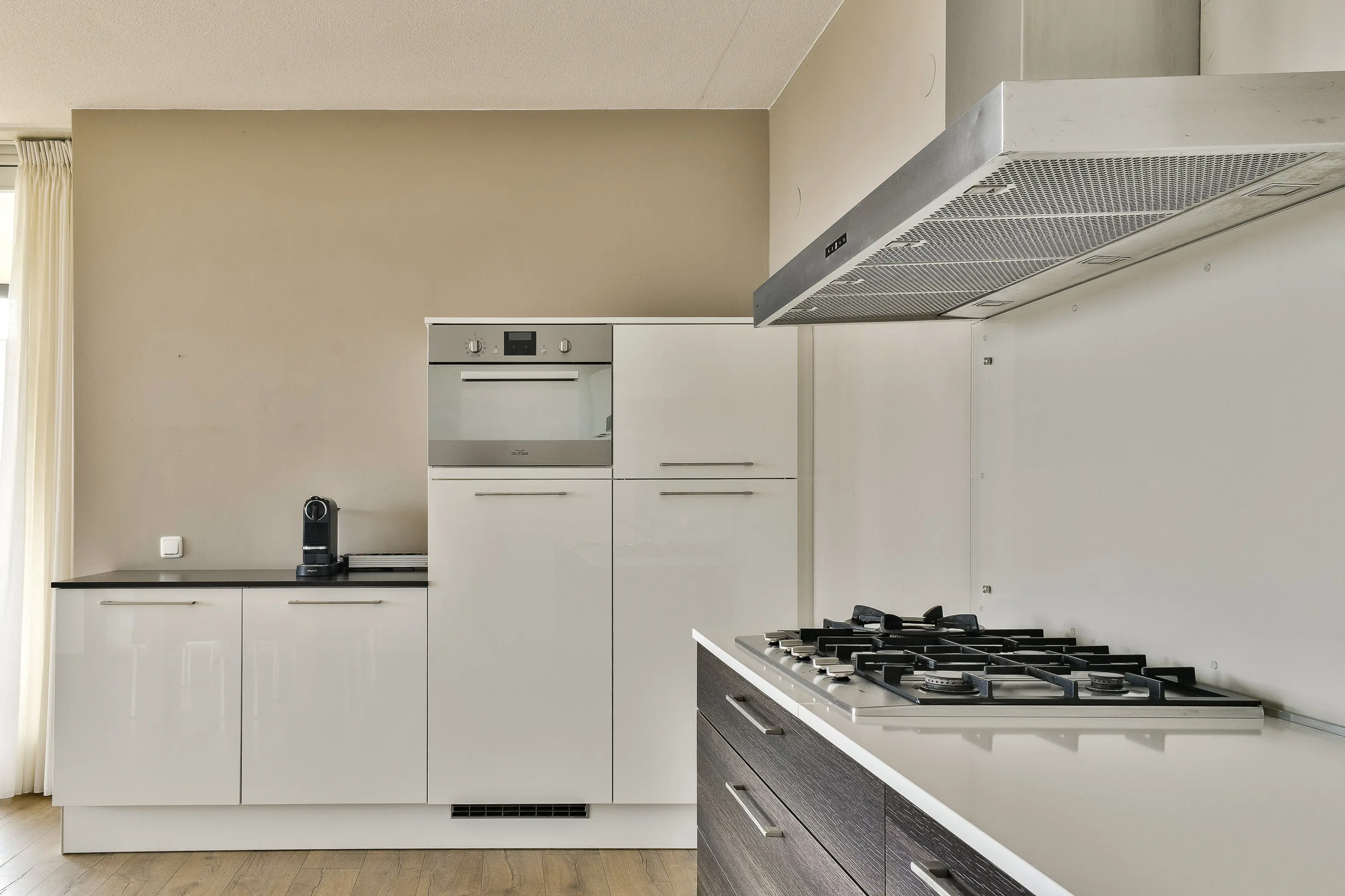 De open keuken van Bruynzeel is modern uitgevoerd en voorzien van diverse inbouwapparatuur, waaronder een 5-pits gasfornuis, afzuigkap, vaatwasser en spoelbak. In de woonkamer is er bovendien voldoende ruimte voor een royale zit- en eethoek.