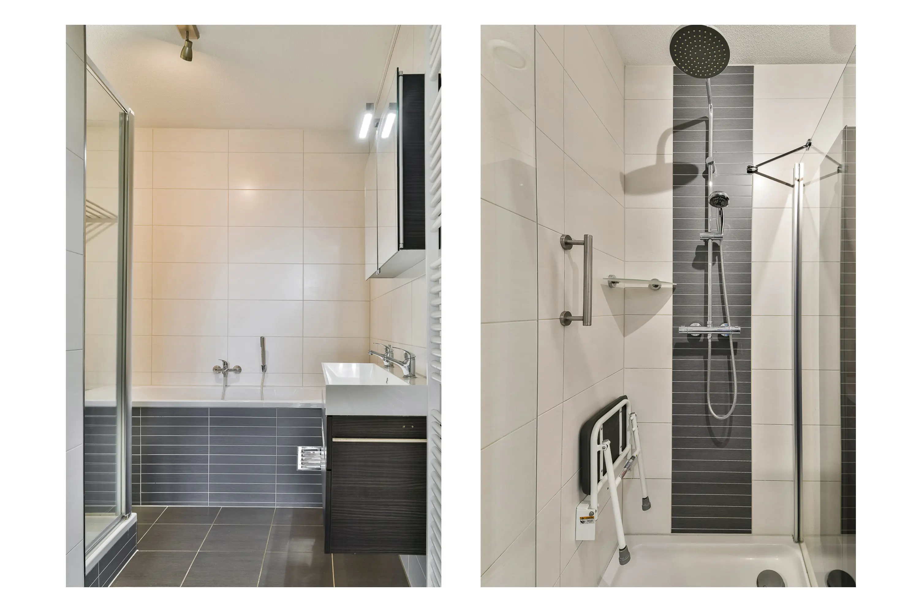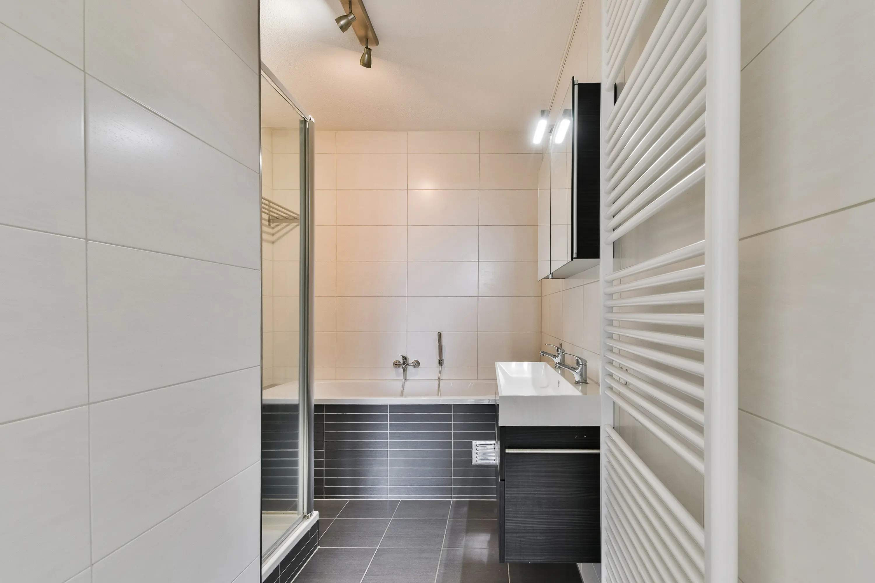 De luxe, volledig betegelde badkamer is ingericht met een bubbelbad, aparte douche met thermostaatkraan, een dubbele wastafel met meubel en een designradiator. Het toilet is modern en separaat uitgevoerd.