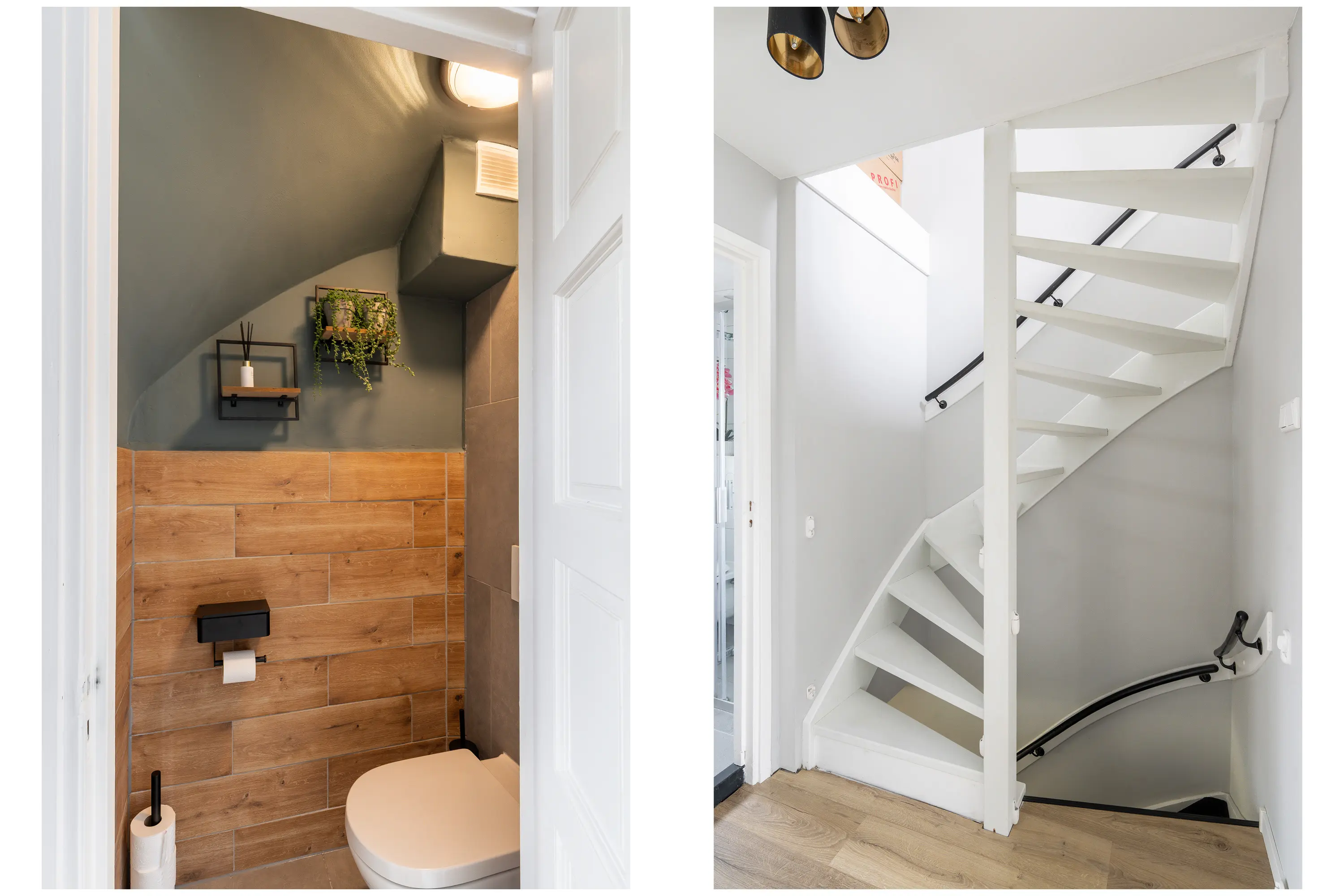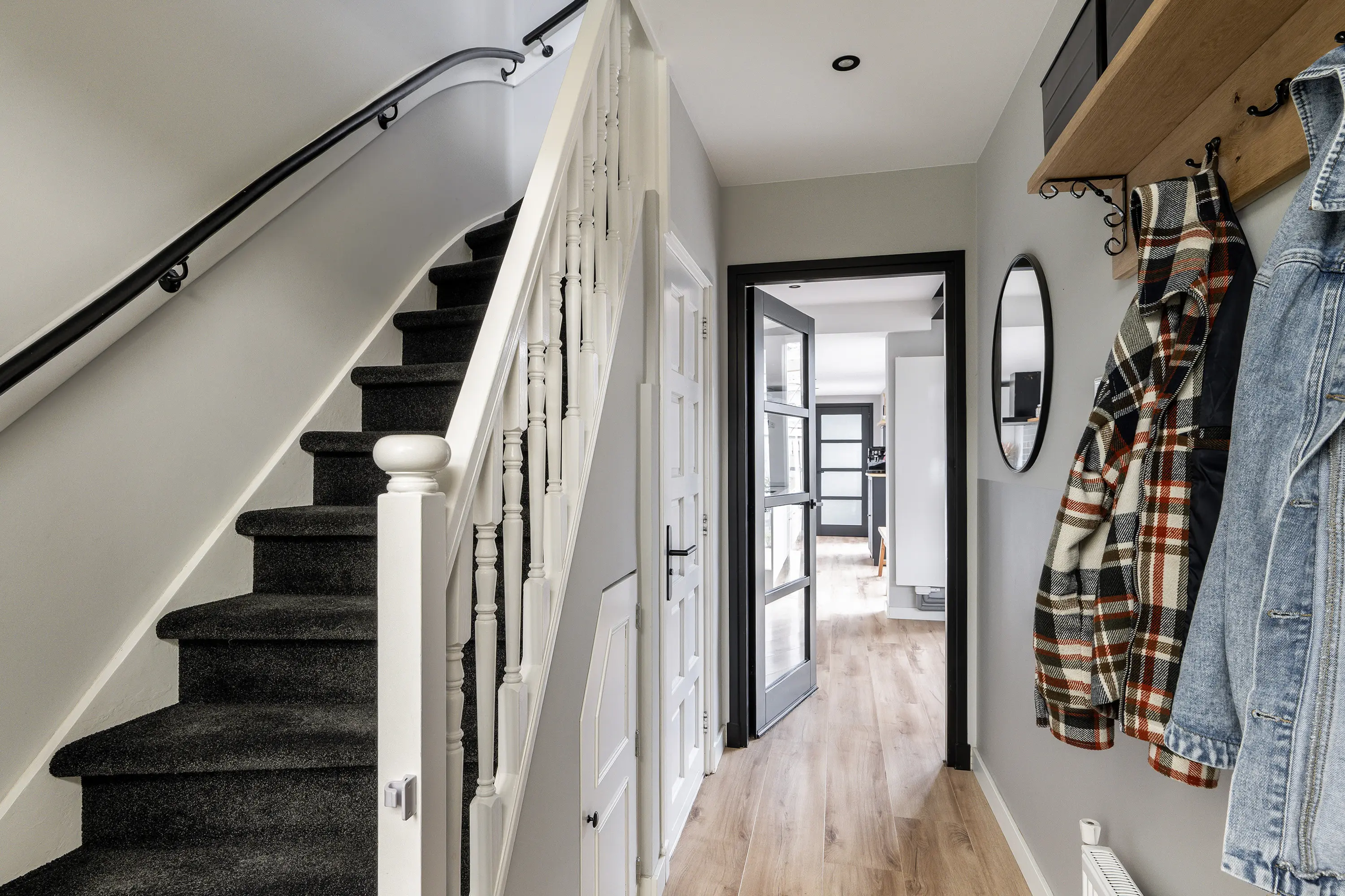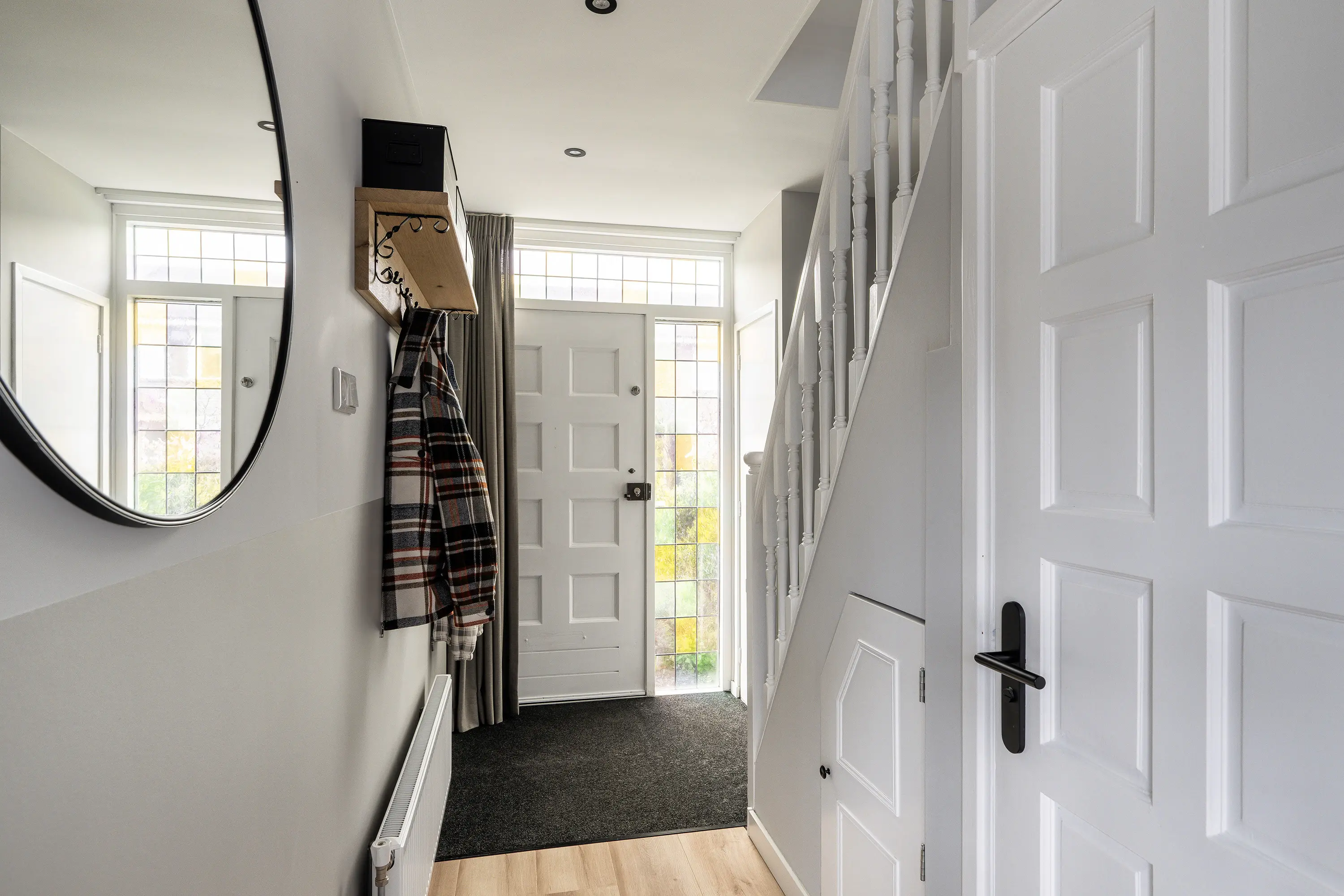 Via de entree komt u in de verzorgde hal met meterkast, trapopgang, praktische bergruimte en een modern toilet. Ook hier valt direct op dat de woning is gemoderniseerd (gestuukt plafond met lichtspots), met behoud van de details uit de jaren '70 (trapspijlen en paneeldeuren). De gehele begane grond (met uitzondering van de berging) is opgeknapt en gemoderniseerd in 2021.