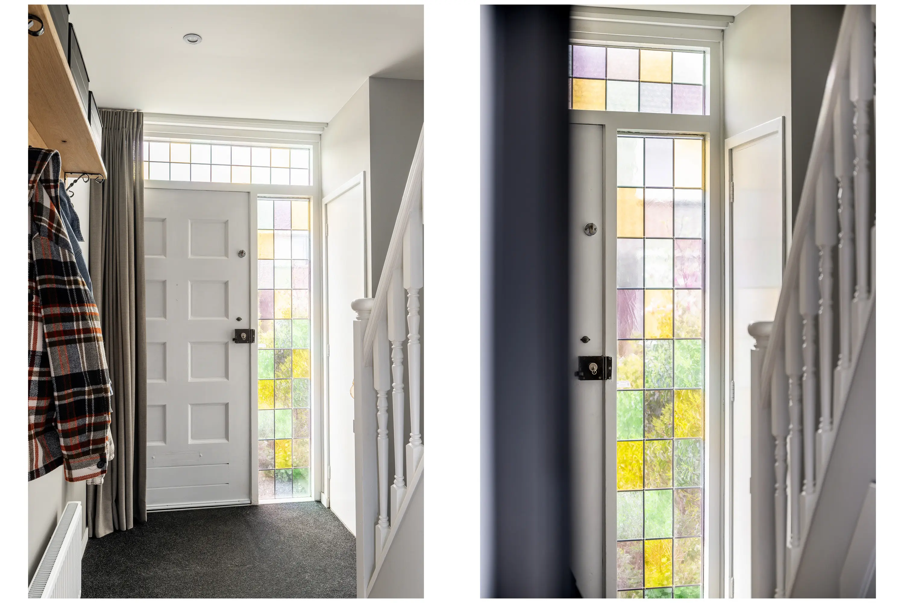 Eigen oprit naast de woning met de mogelijkheid voor het parkeren van één auto. Looppad naar de entree, waar direct de authentieke details opvallen zoals het glas-in-lood bij de voordeur en het zijraam.