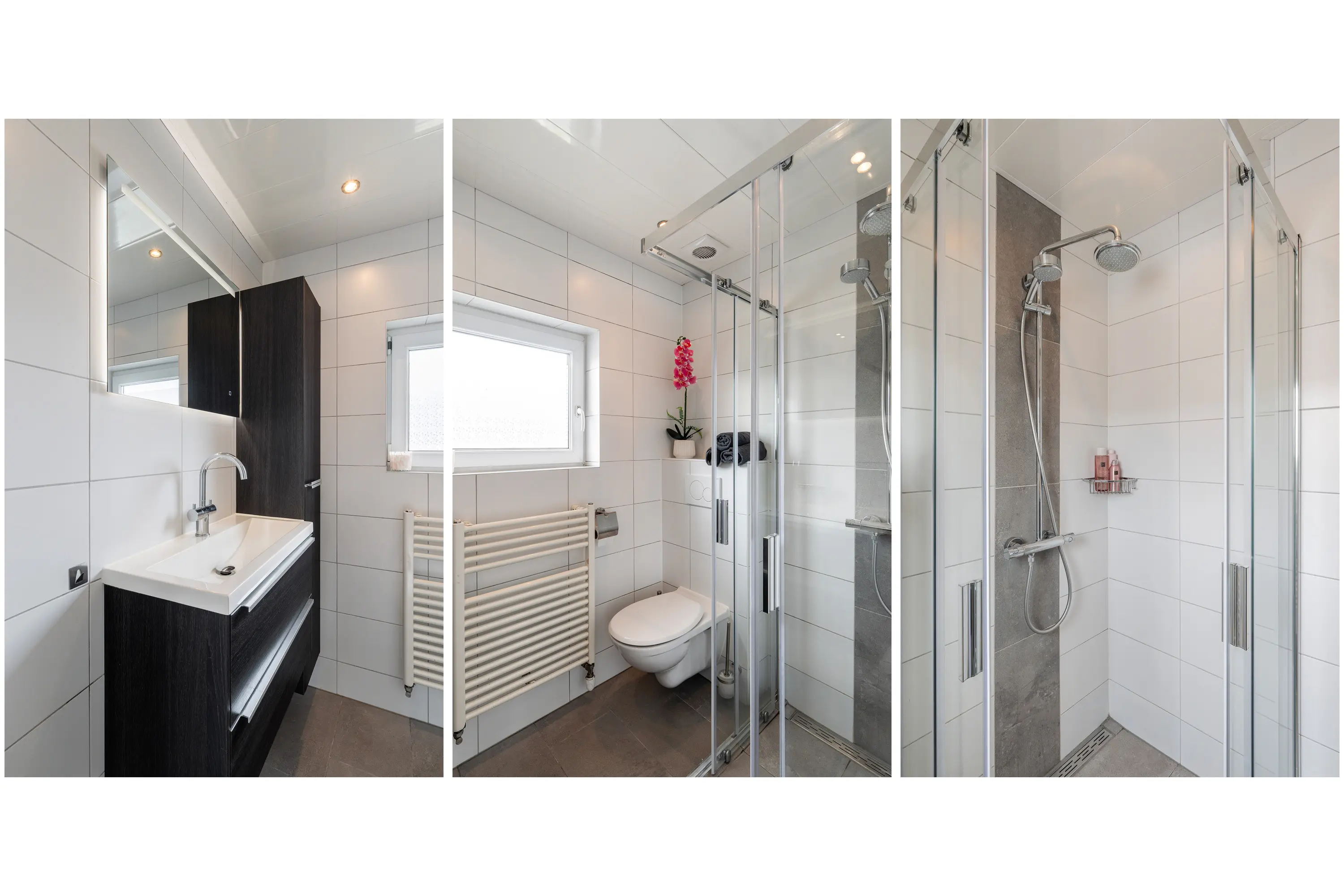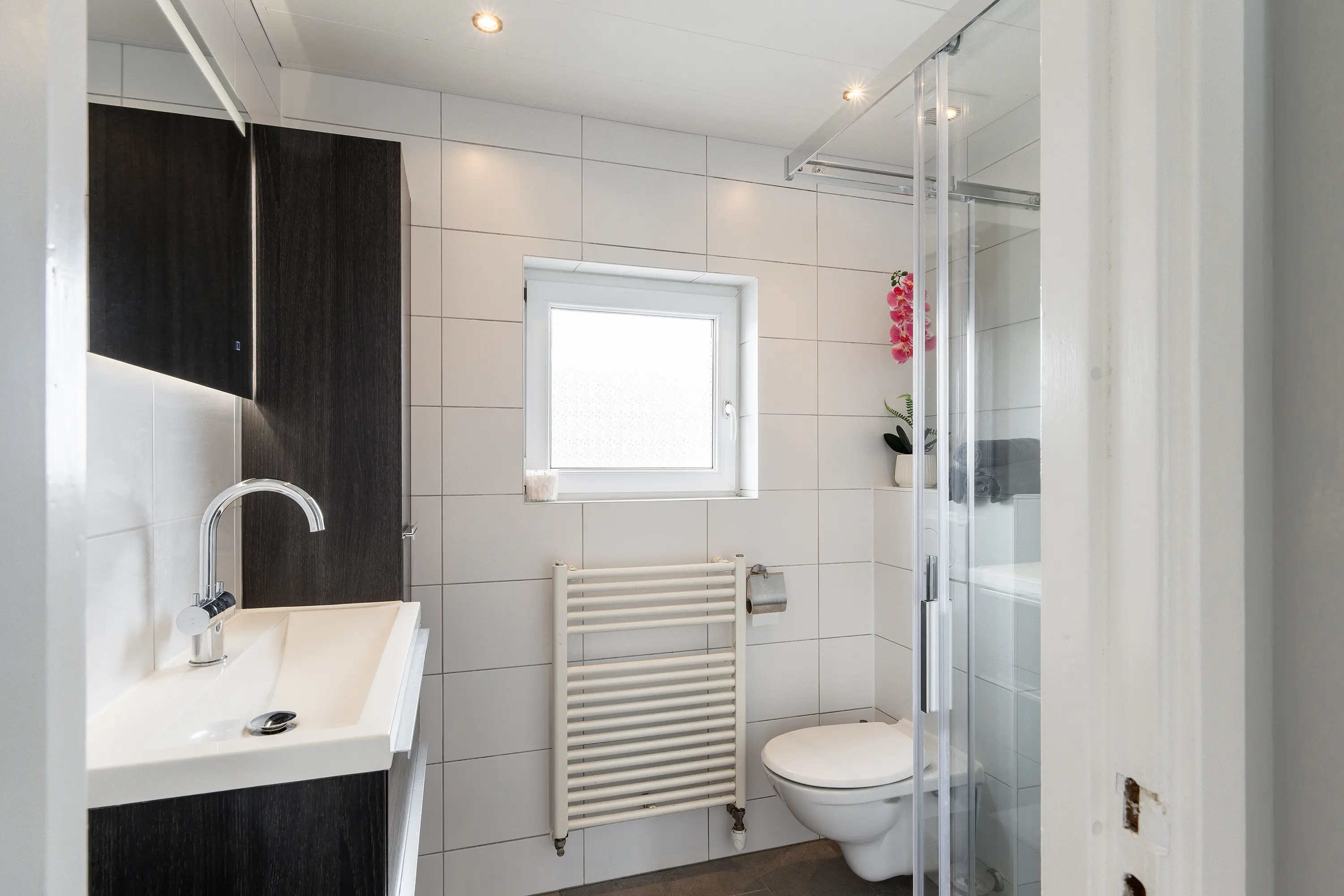 De moderne badkamer aan de voorzijde is strak afgewerkt en uitgerust met een douchecabine, wastafelmeubel, toilet, designradiator, mechanische ventilatie en te openen raam voor natuurlijke ventilatie.