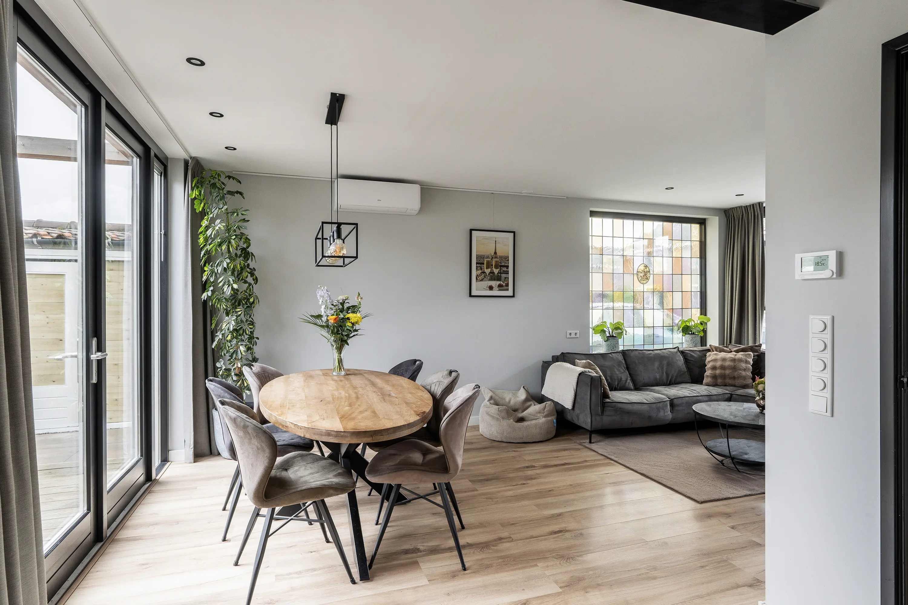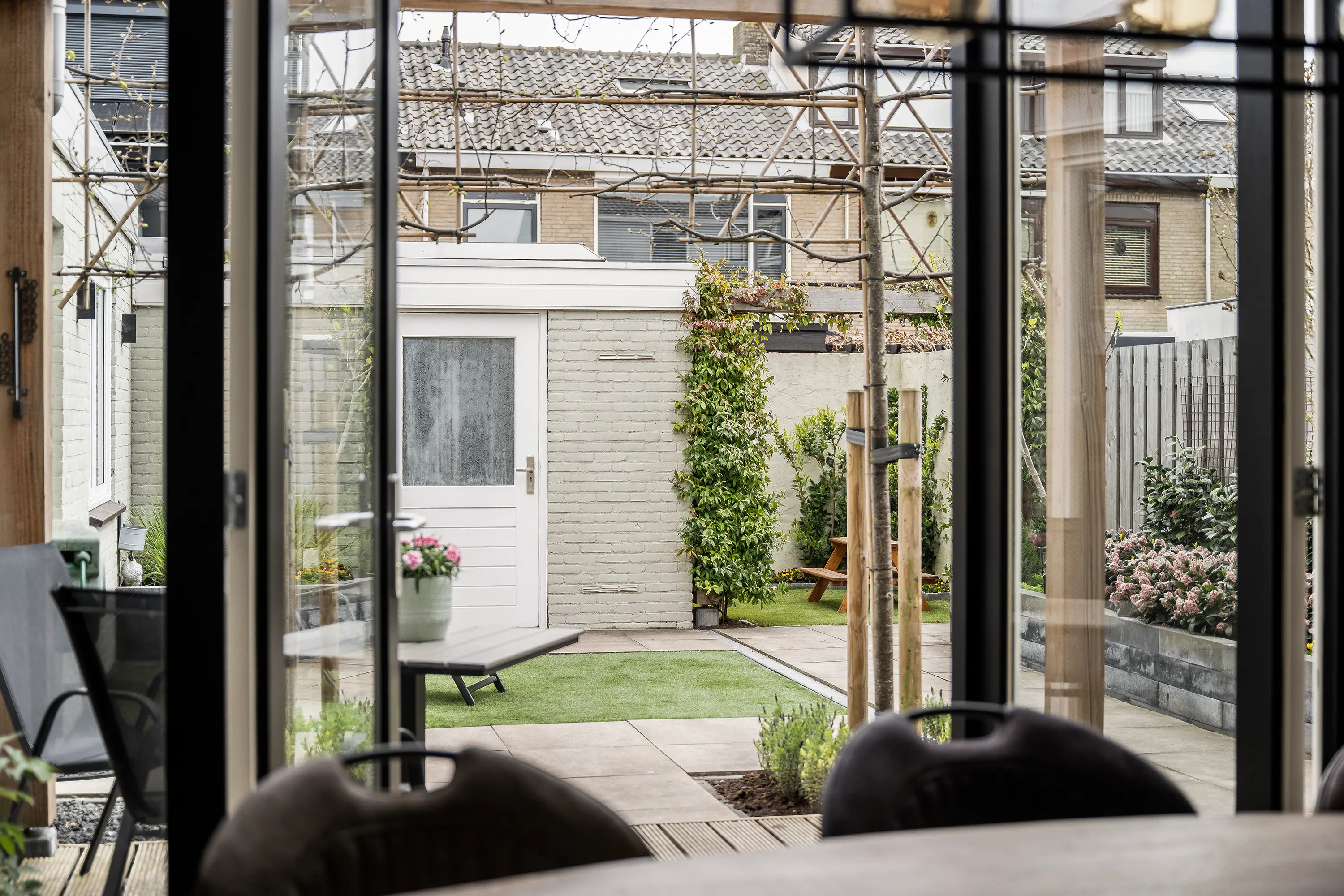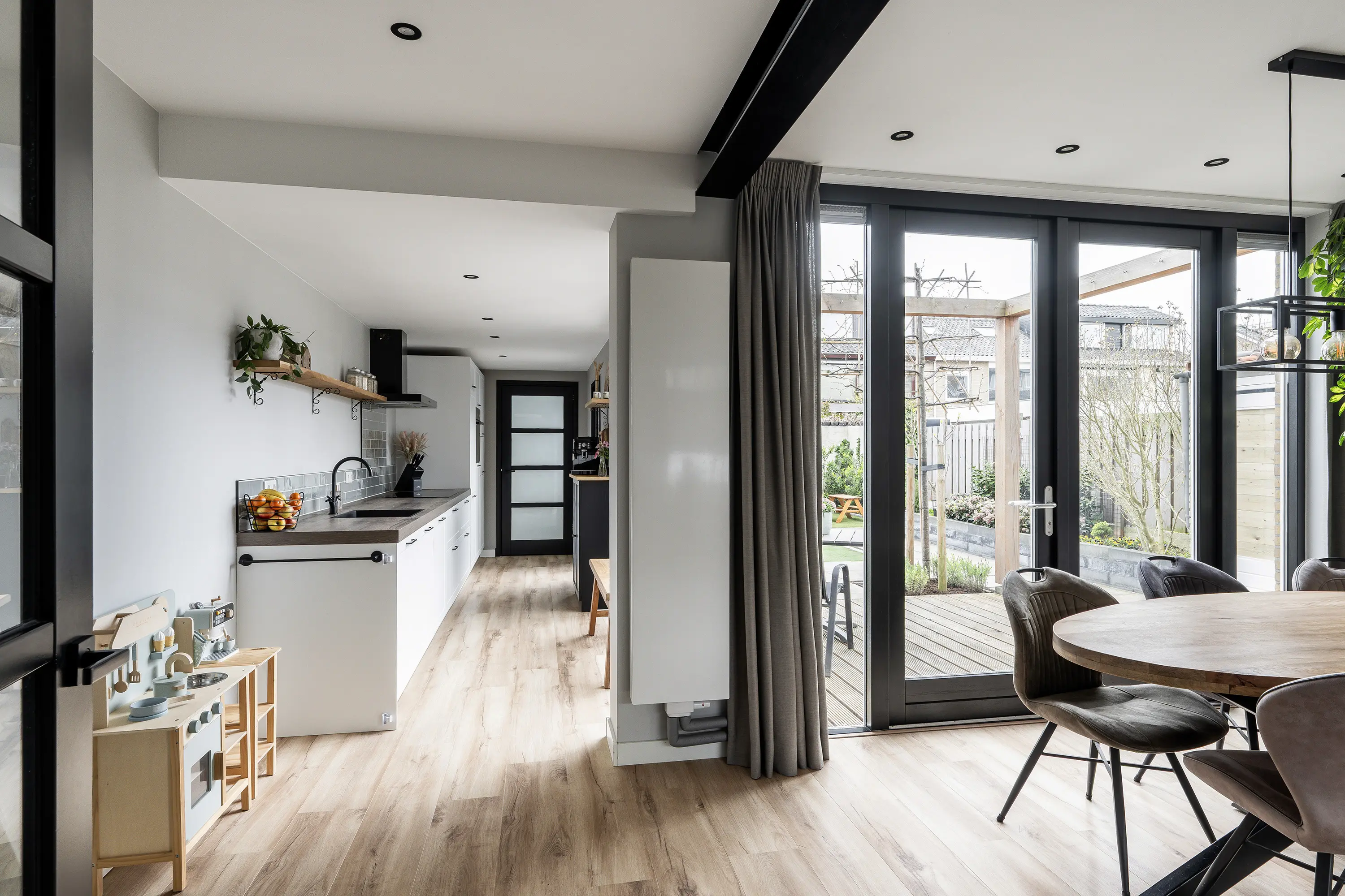 Openslaande deuren verbinden de eethoek met de achtertuin, waardoor binnen en buiten naadloos in elkaar overlopen.