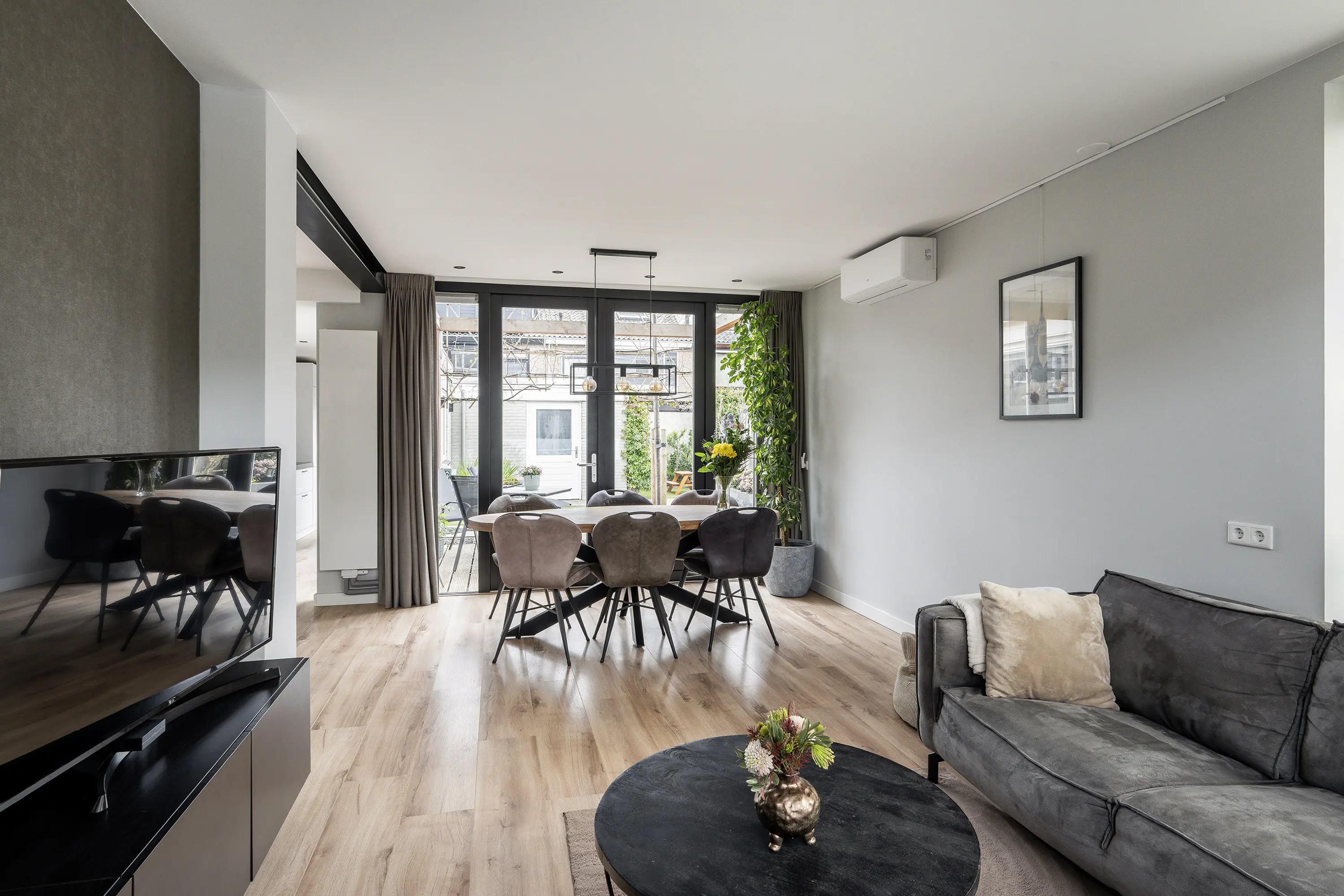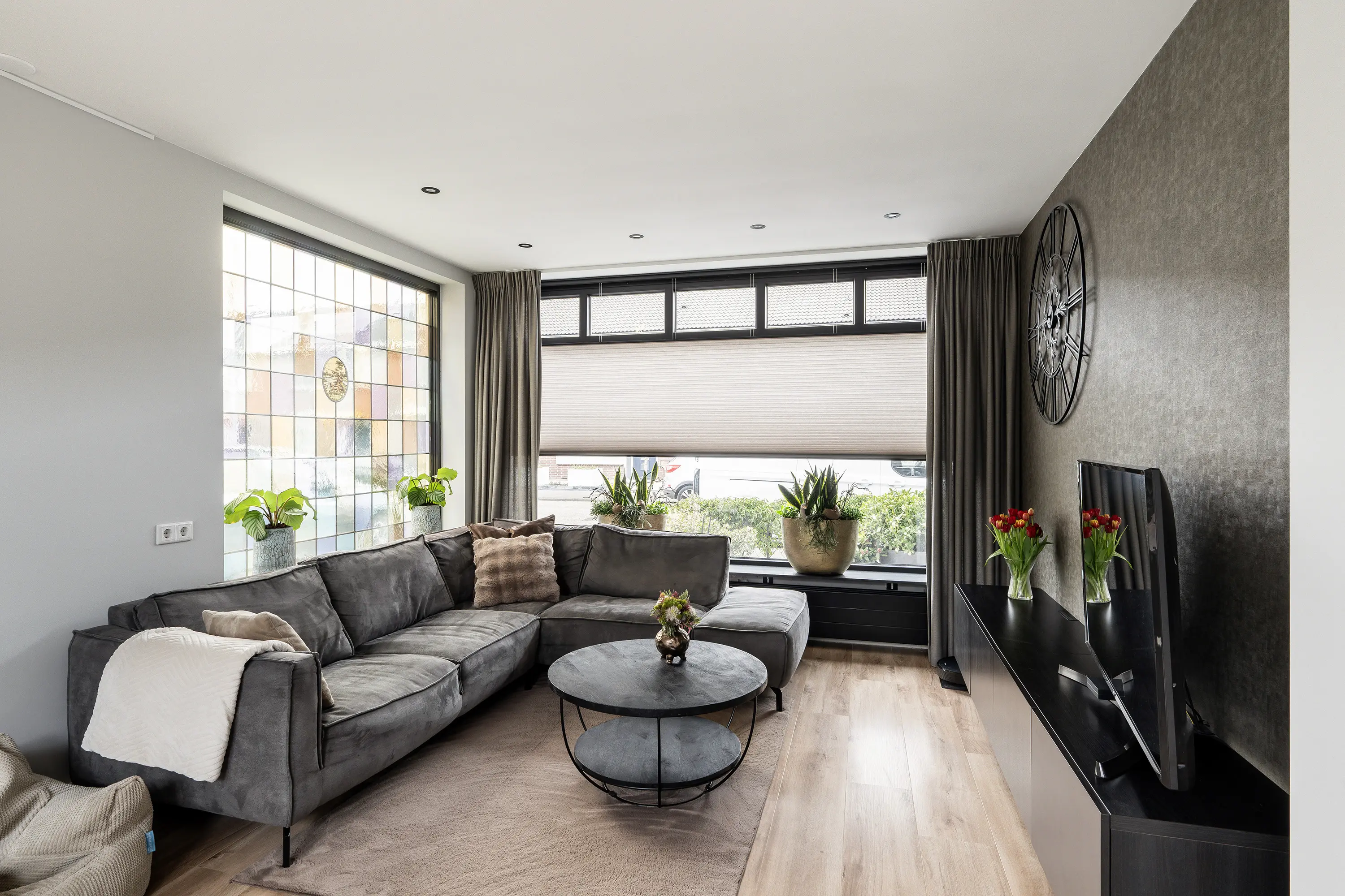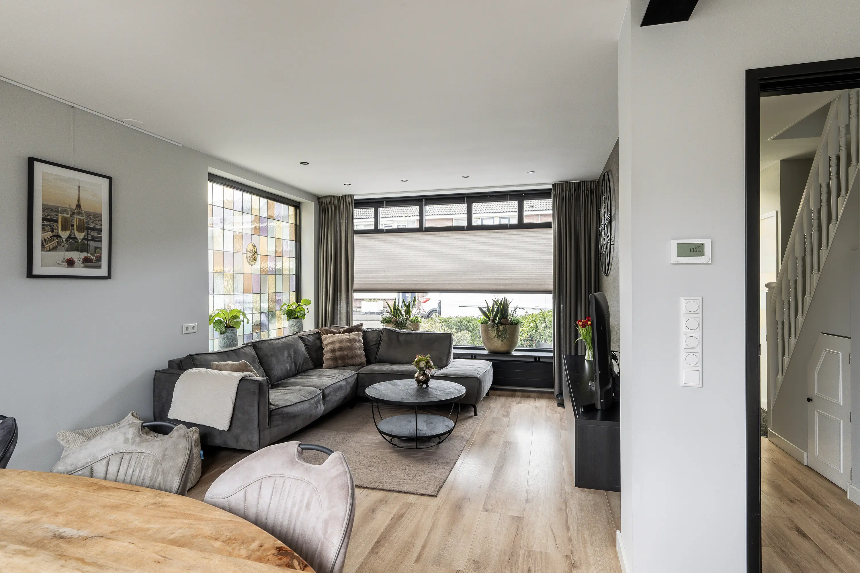 De woonkamer is ruim opgezet en heerlijk licht dankzij de grote raampartijen aan de voor- en zijzijde. De zithoek is gesitueerd aan de voorzijde en biedt een prettig uitzicht op de voortuin.