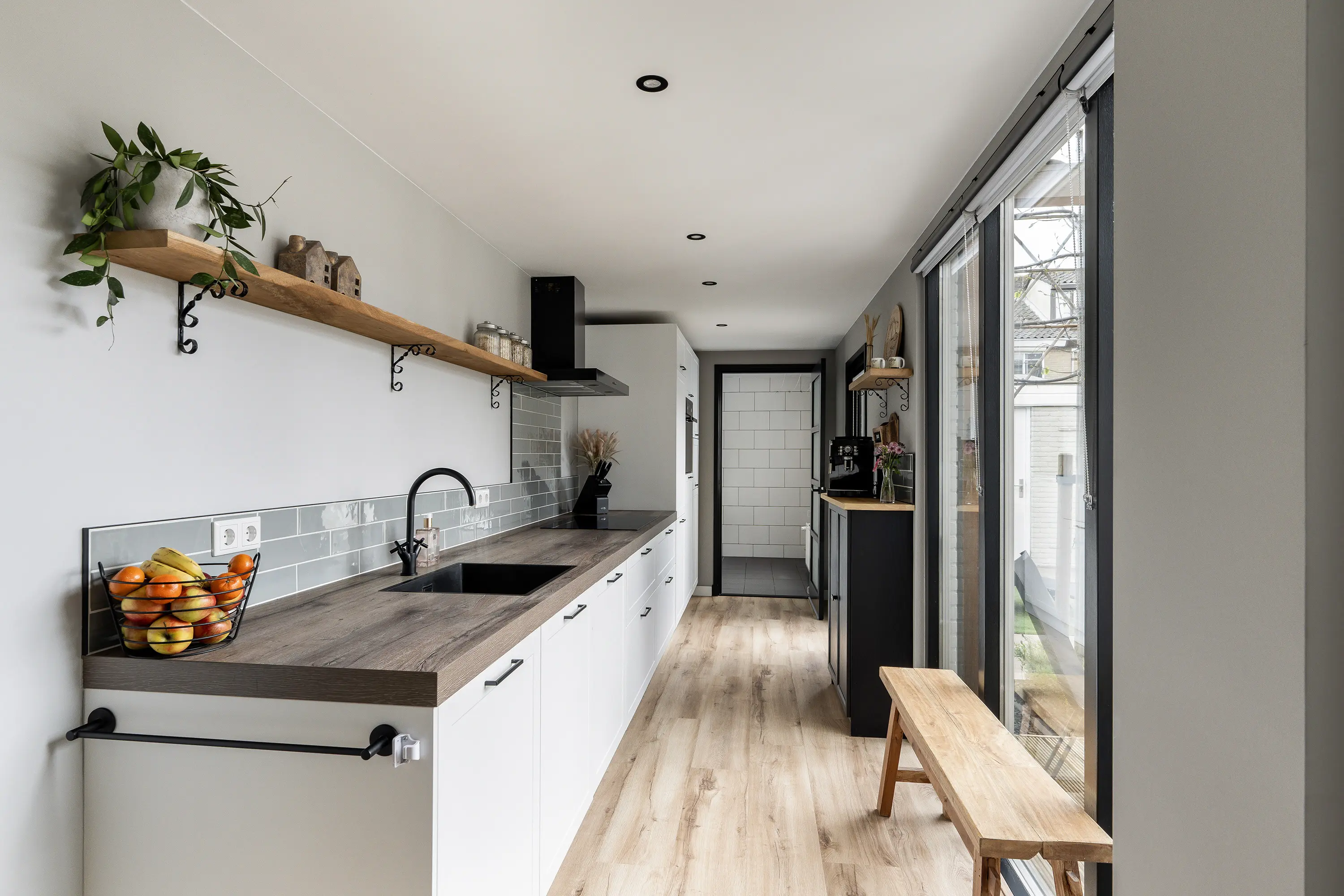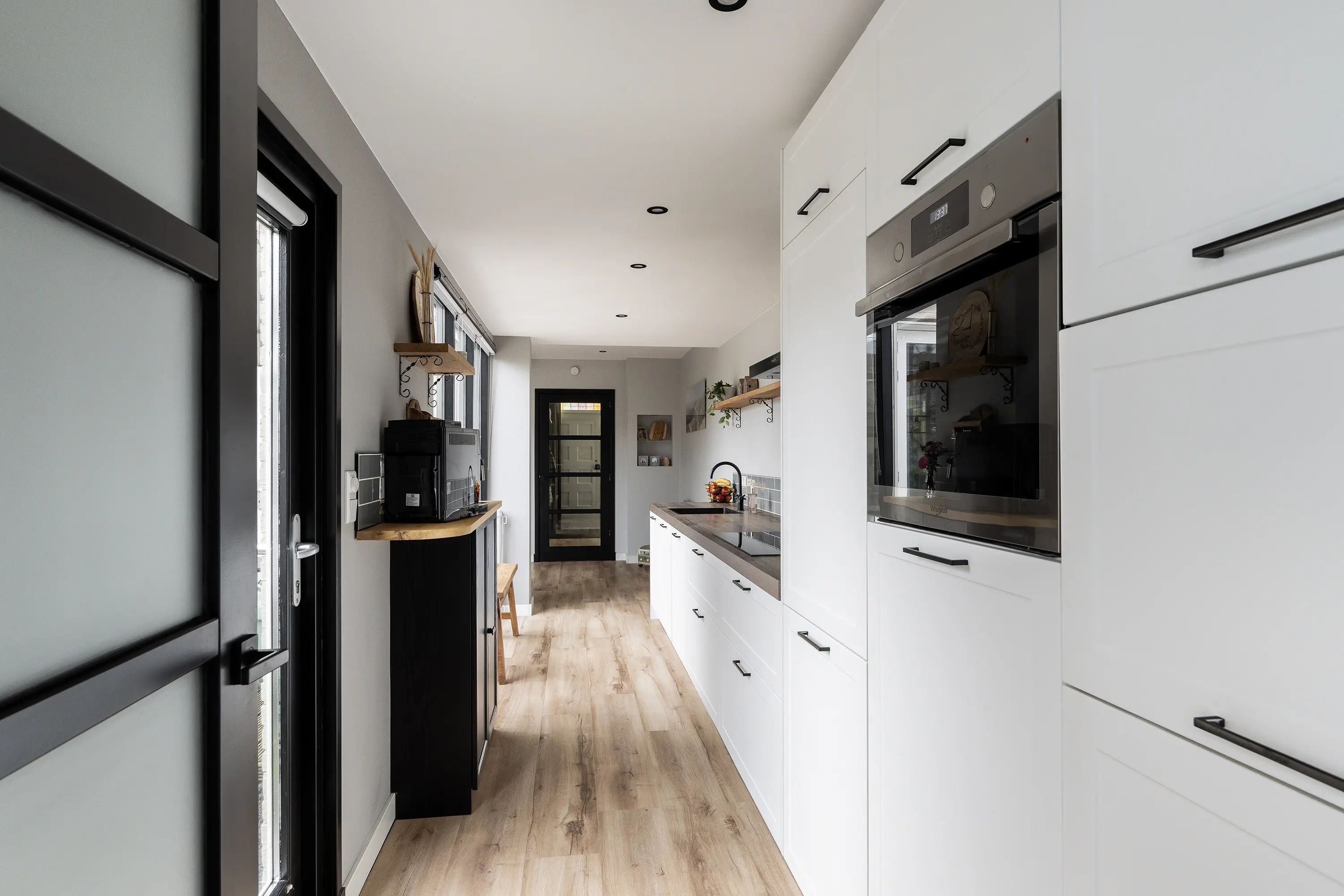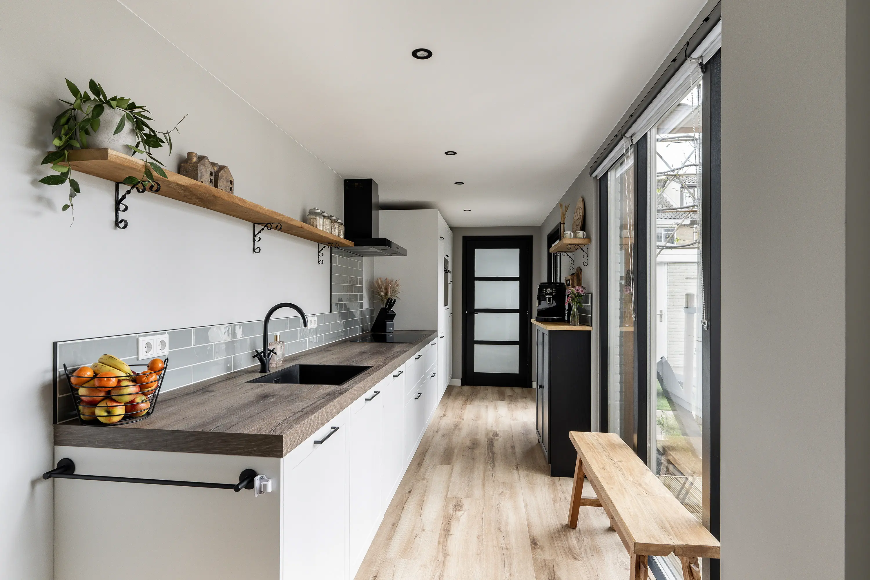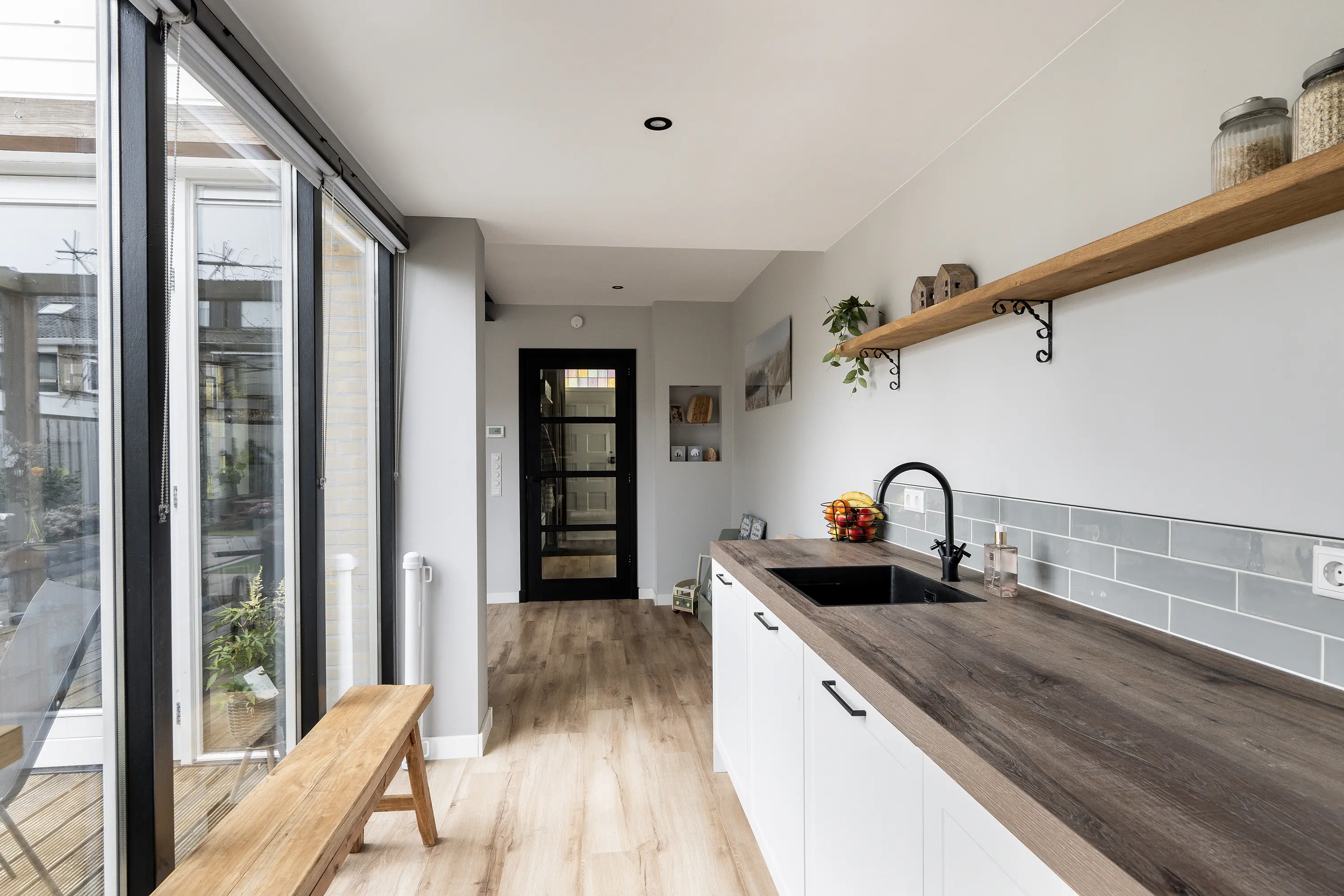 Tevens aan de achterzijde, in de uitbouw, bevindt zich de open keuken. De keuken (2021) is modern uitgevoerd en voorzien van diverse inbouwapparatuur, veel kastruimte en een praktische opstelling. De inbouwapparatuur bestaat uit een kookplaat met afzuigkap, oven, koelkast en vaatwasser.