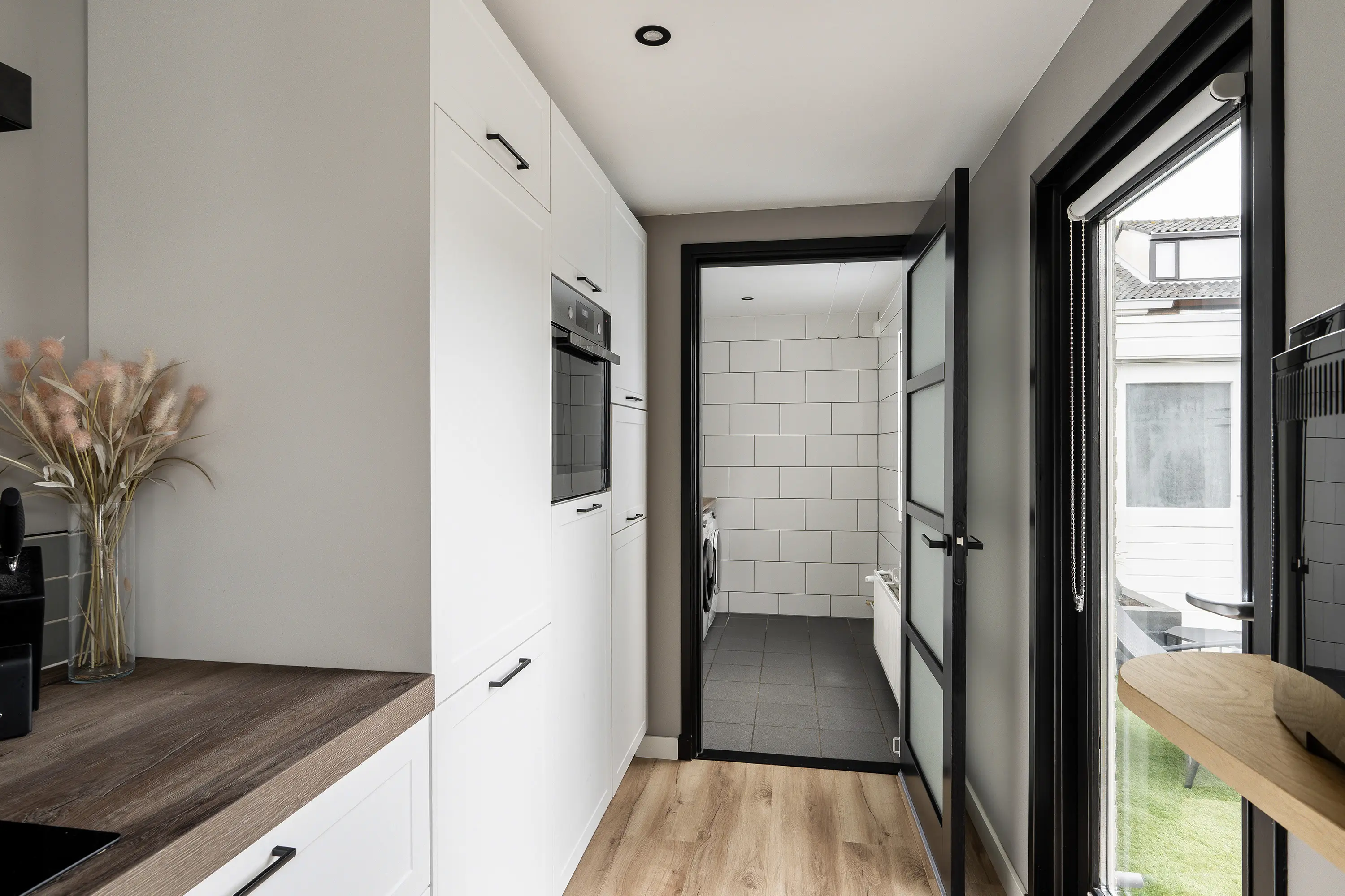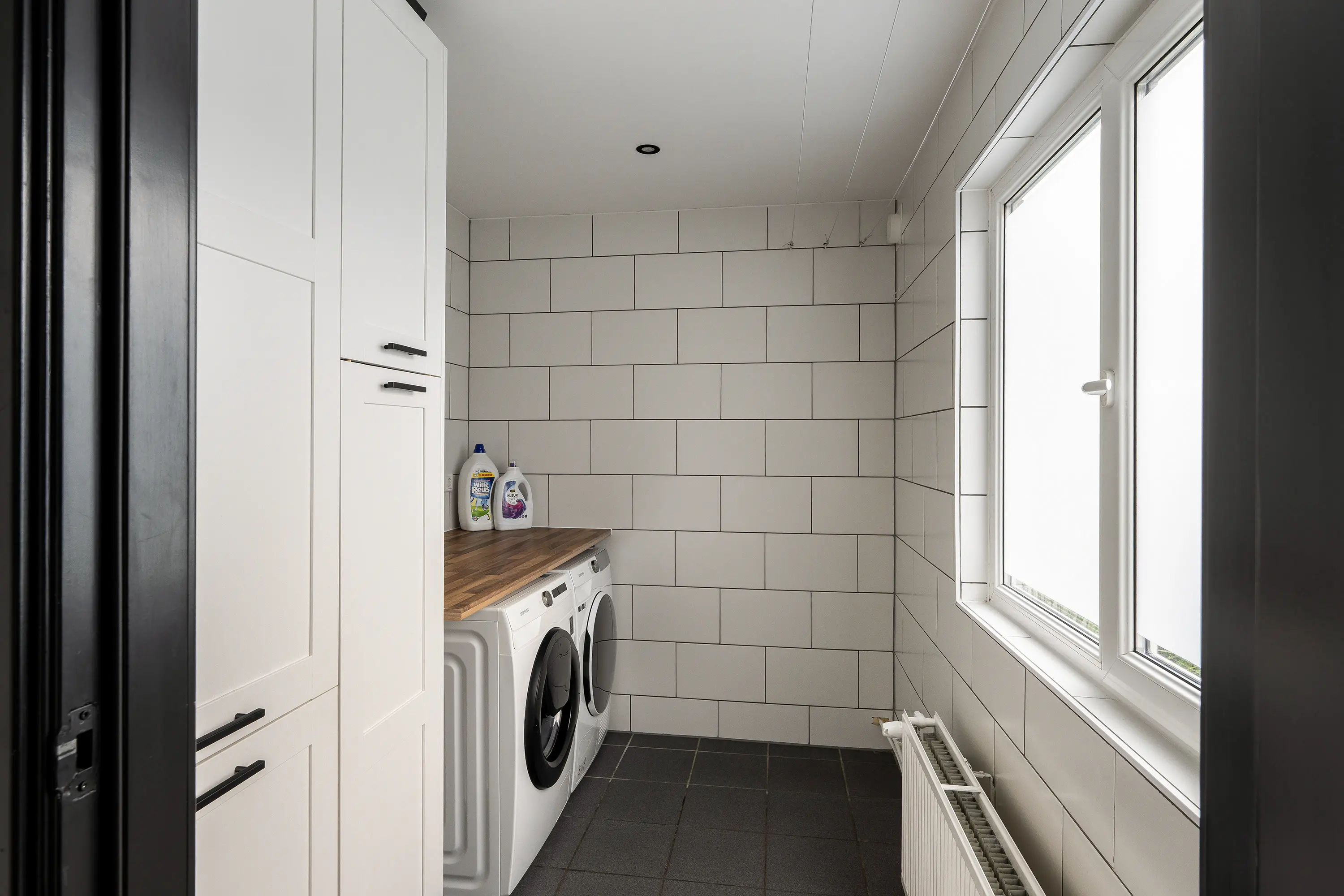Zeer praktisch is de aangrenzende bijkeuken waar niet alleen extra bergruimte is, maar ook de aansluiting voor wasmachine en droger. Zo is het bij mooi weer ideaal om de was buiten te drogen te hangen.