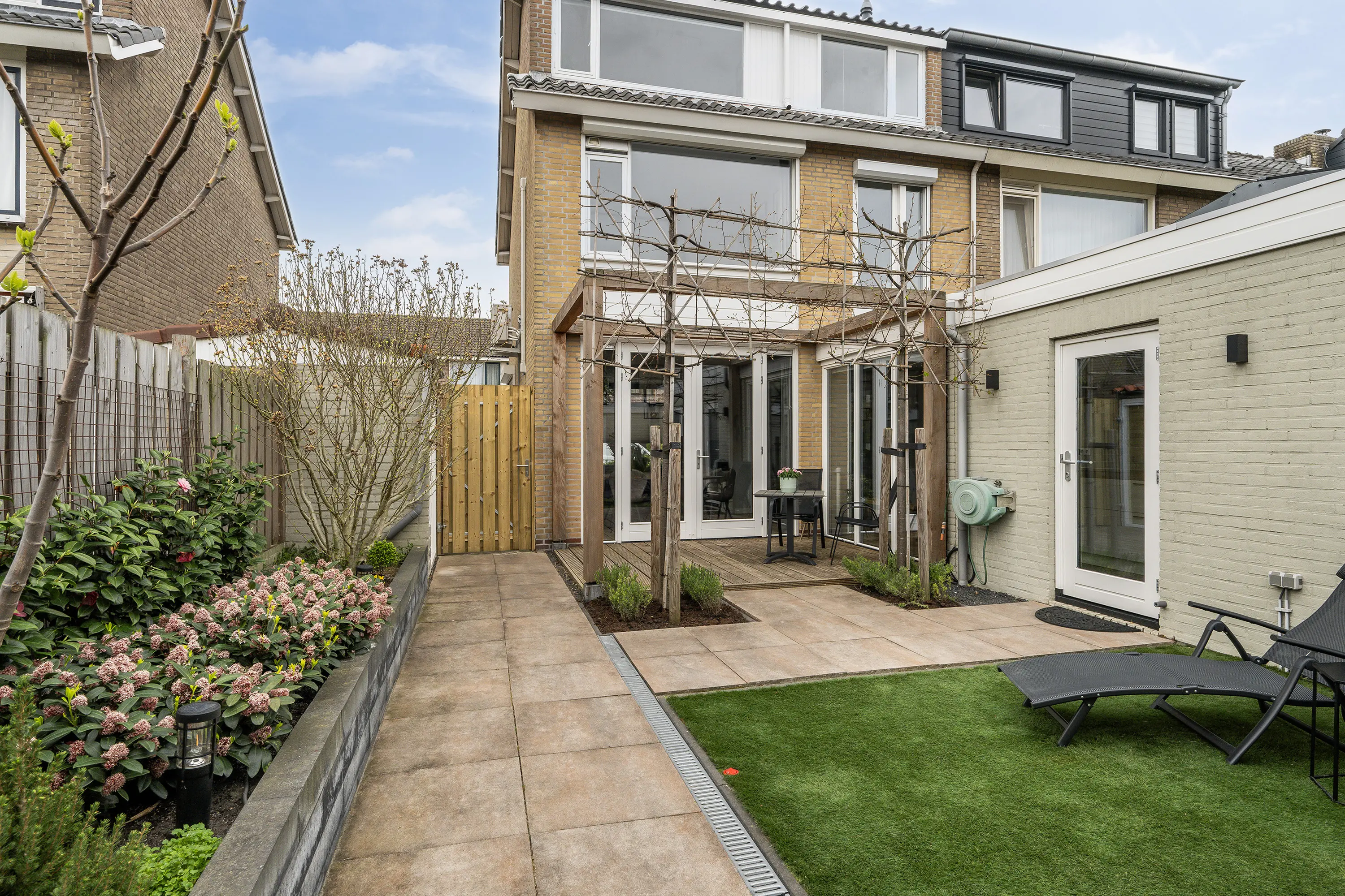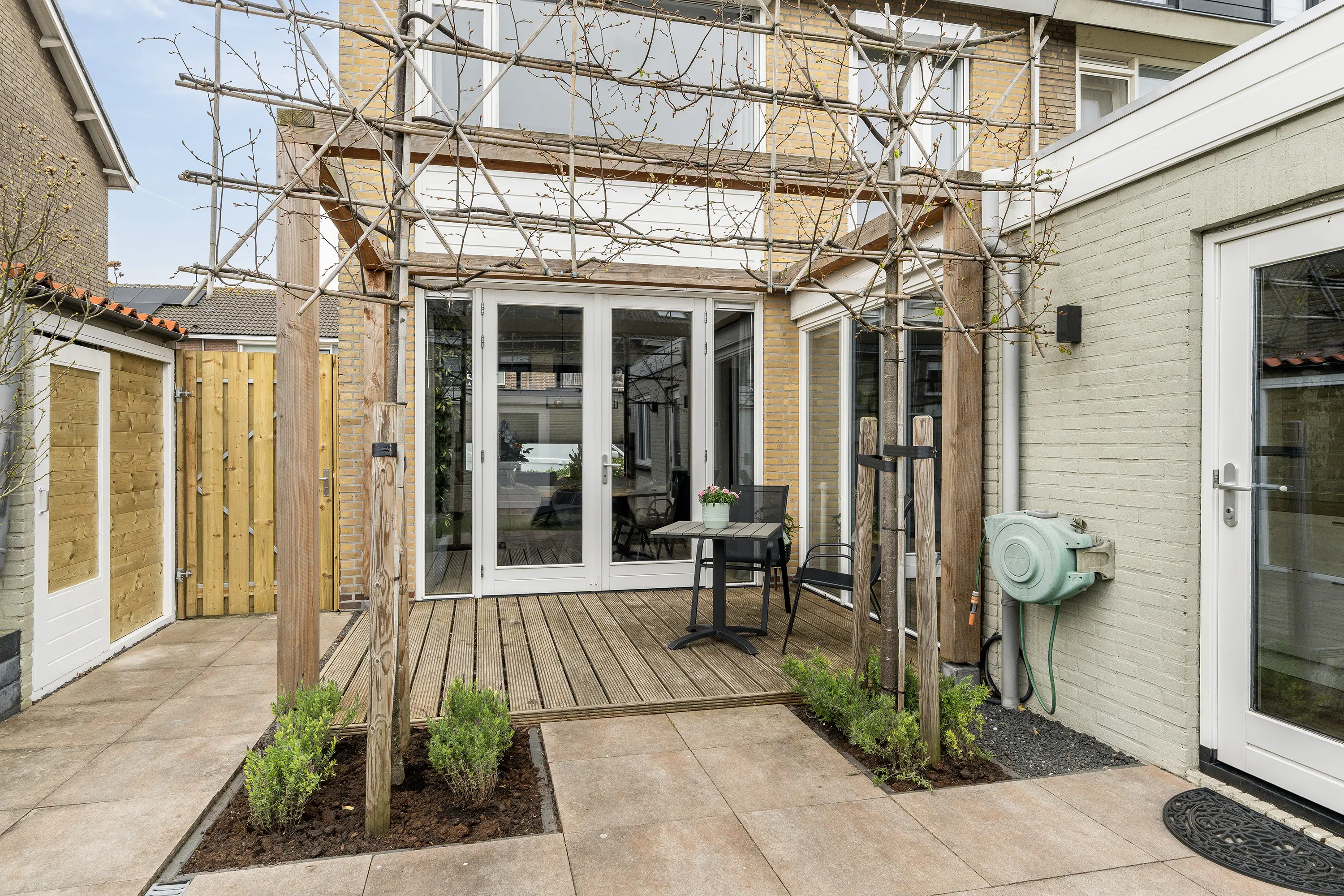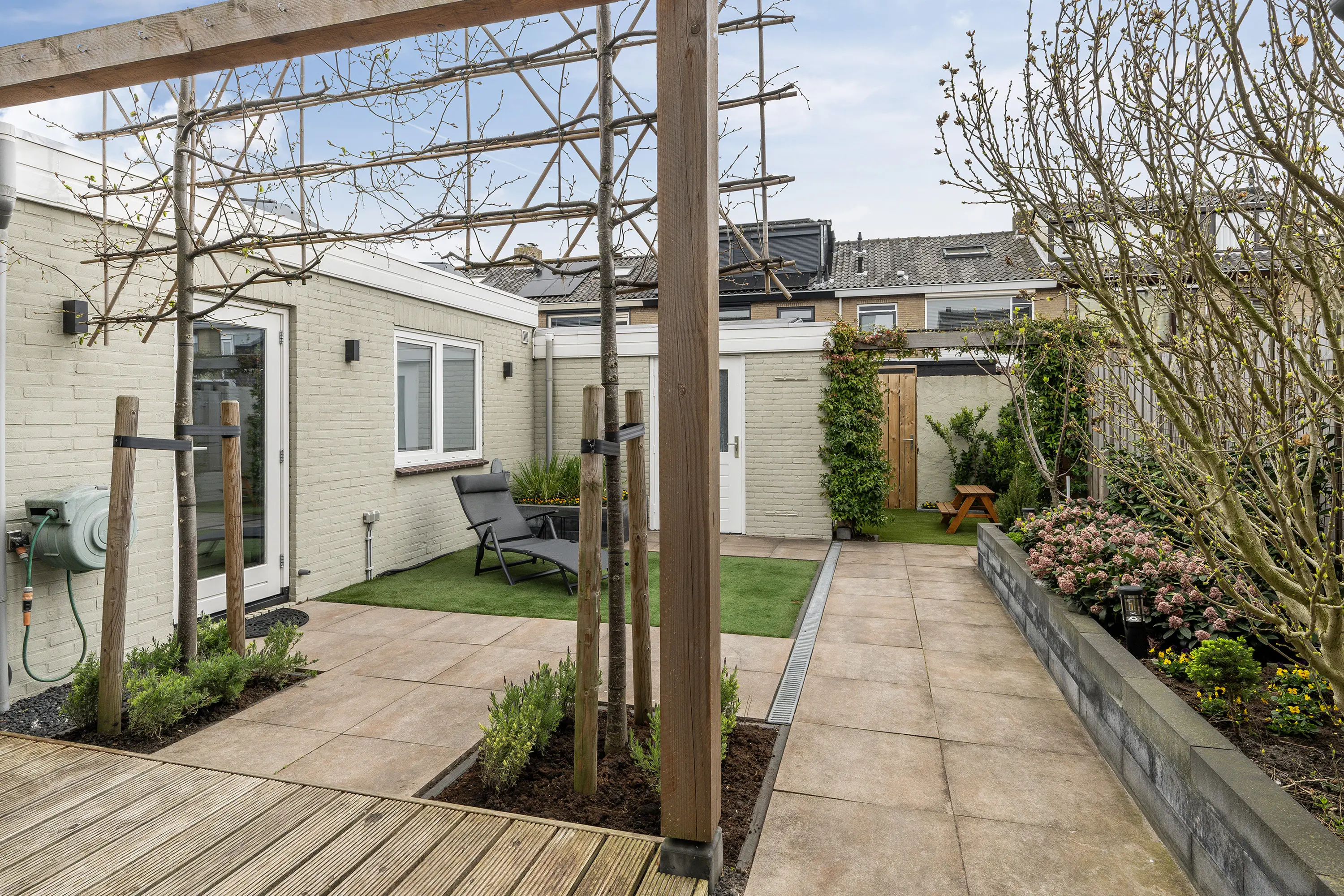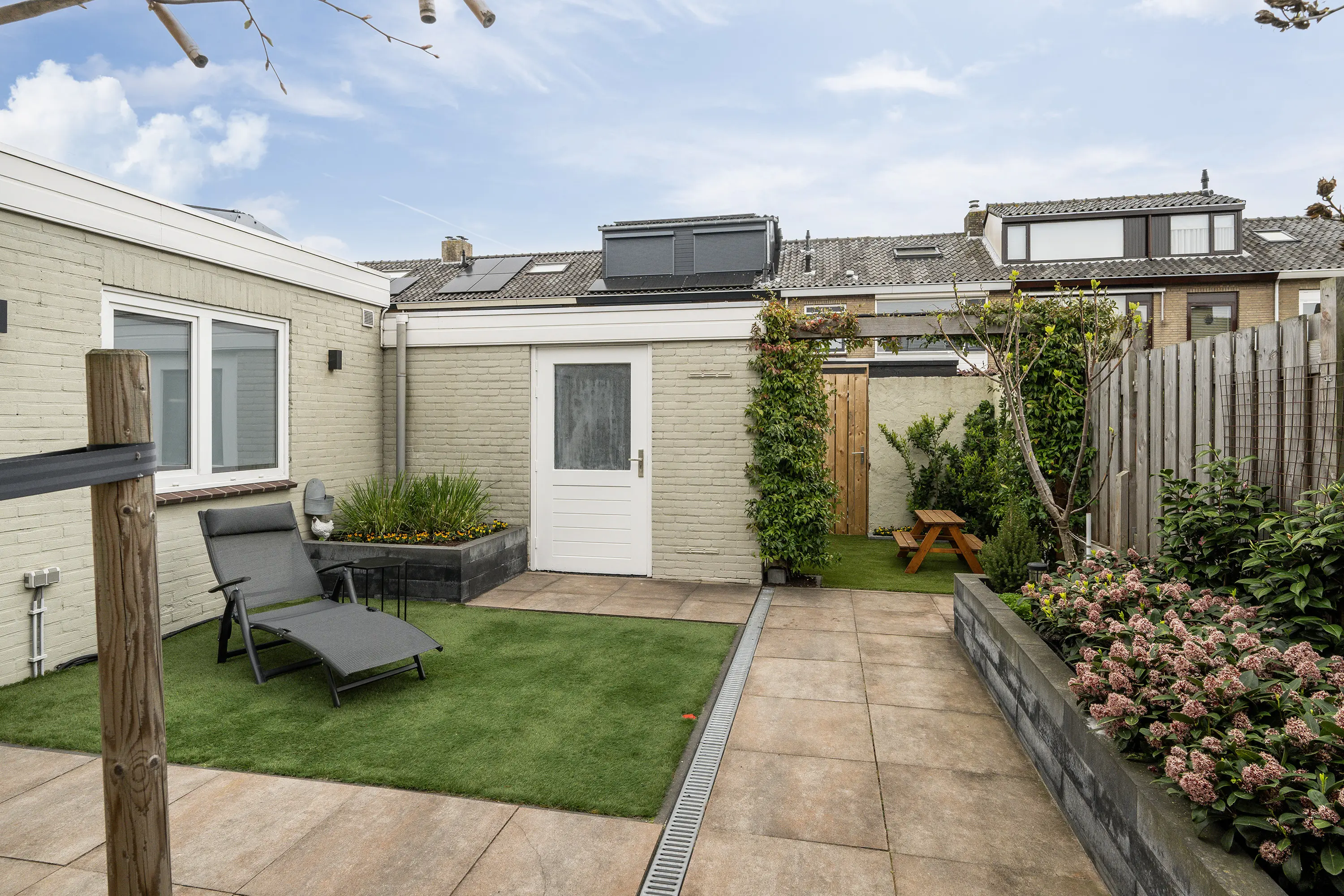 De achtertuin is verzorgd aangelegd met een combinatie van terras en groen, biedt volop privacy en is gunstig gelegen voor de zon. Achterin de tuin staat een ruime, vrijstaand stenen berging, voorin de tuin een extra stenen berging met schuifdeur, beide ideaal voor fietsen en tuingereedschap.