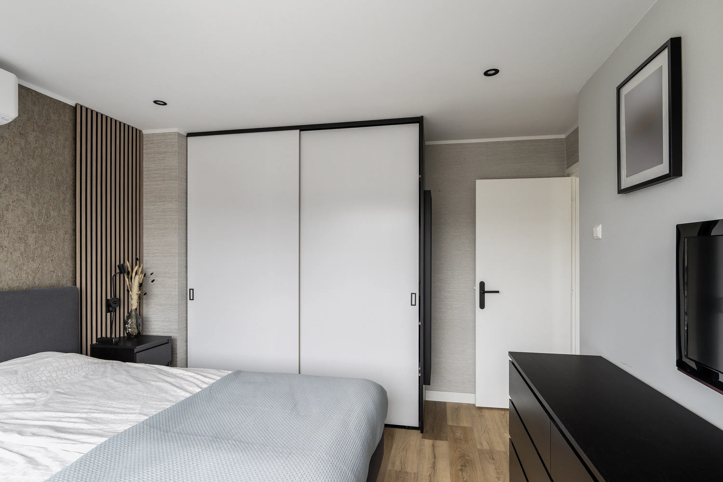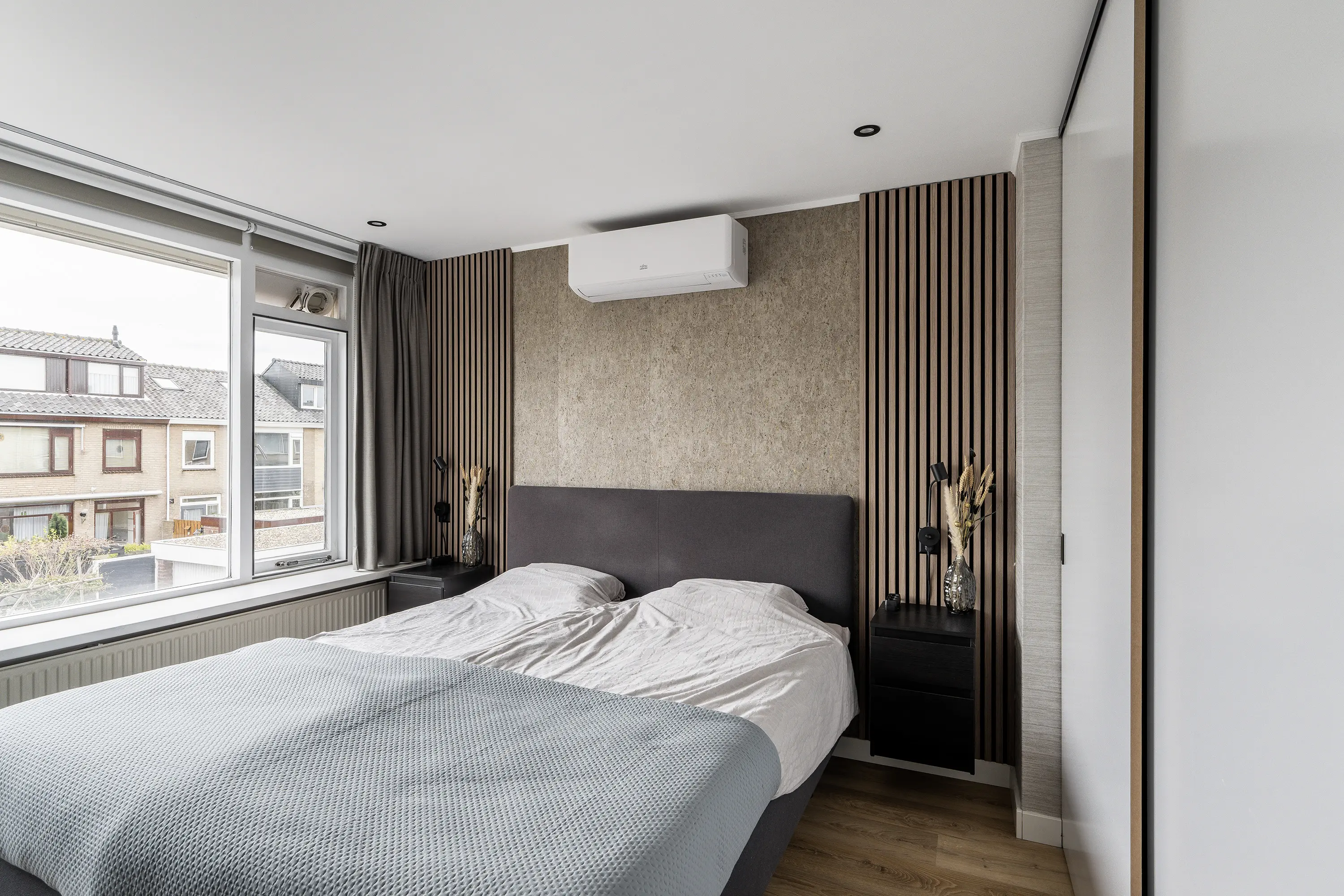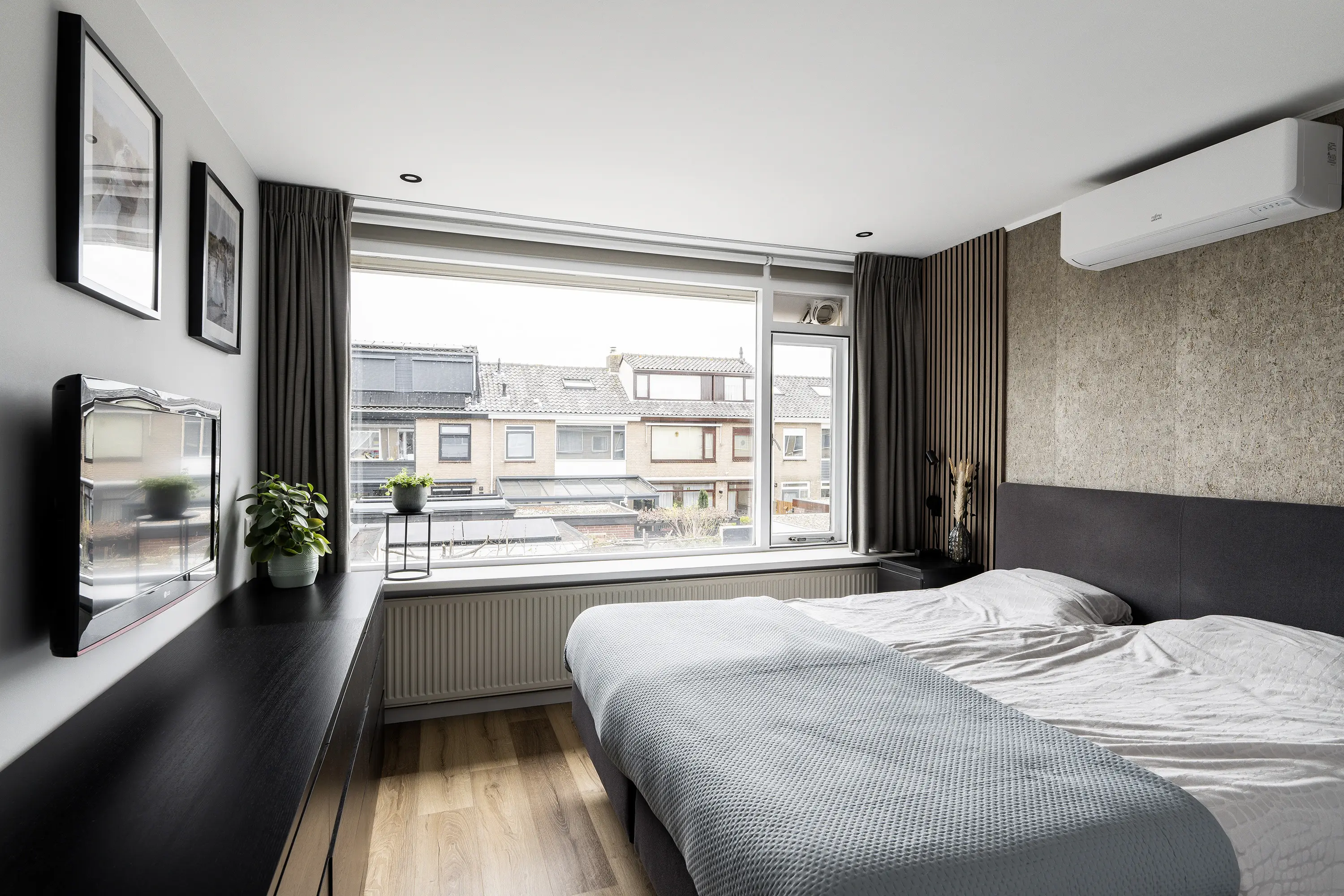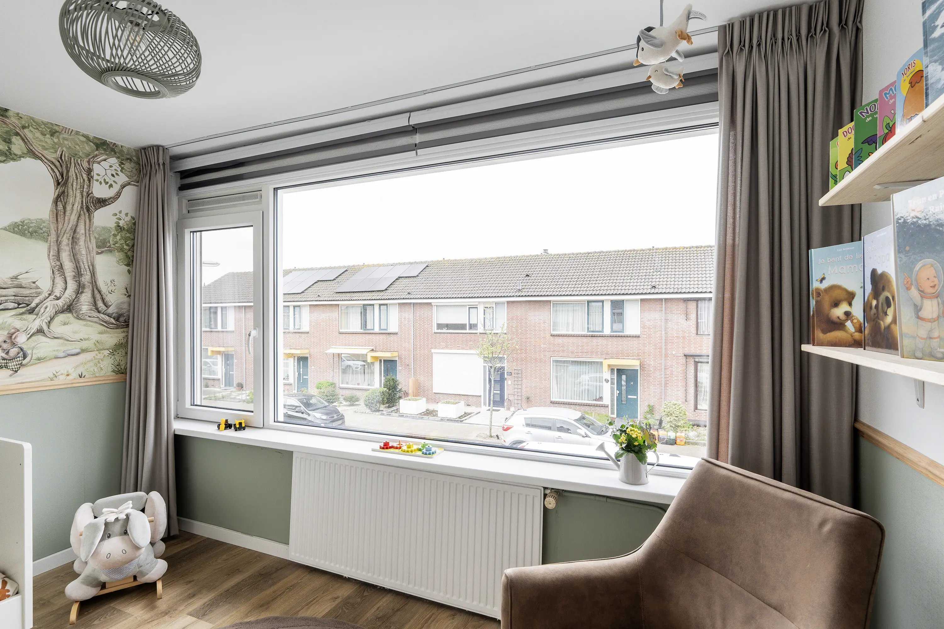 Op de eerste verdieping bevinden zich drie goed ingedeelde slaapkamers, uitgerust met een onderhoudsvriendelijke laminaatvloer over de gehele verdieping. De hoofdslaapkamer aan achterzijde is ruim en voorzien van een vaste kast en airconditioning (Fujitsu, 2025). De overige twee kamers zijn uitstekend geschikt als kinder-, werk- of logeerkamer en beschikken over prettig daglicht. De kamers aan de voorzijde beschikken over kunststof kozijnen met te openen draai-/kiepramen, aan de achterkant zijn de kozijnen van hout, alle slaapkamers beschikken over elektrische rolluiken, gunstig tegen de warmte in de zomer en als extra isolatie in de winterperiode.