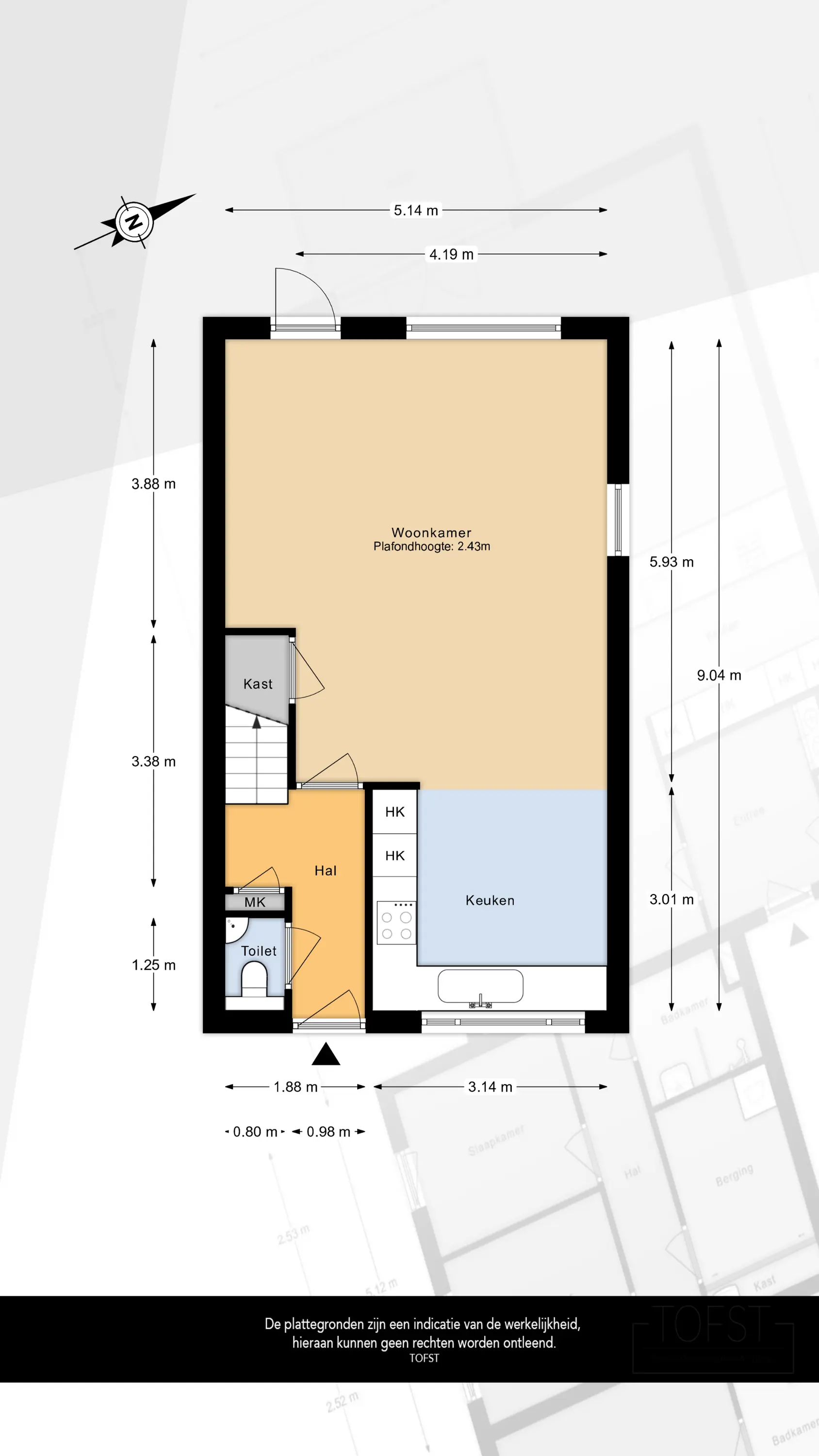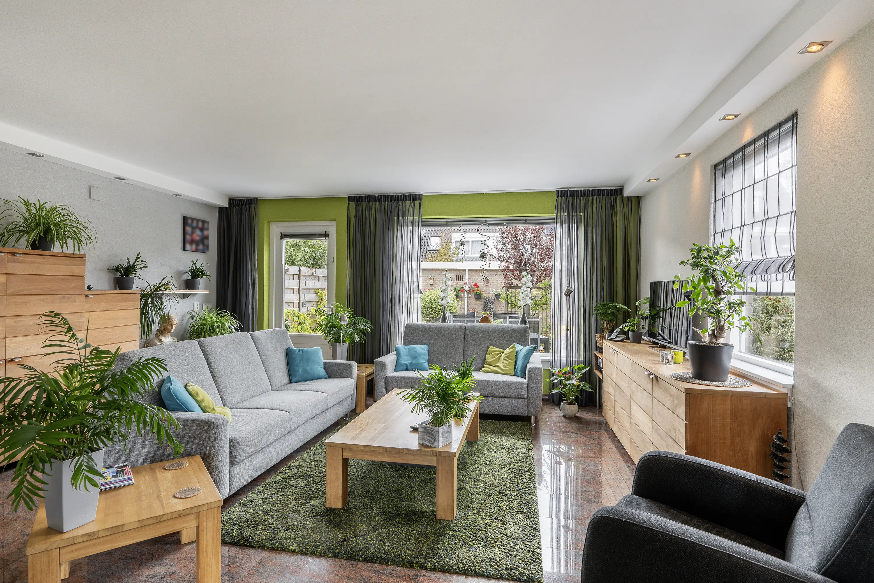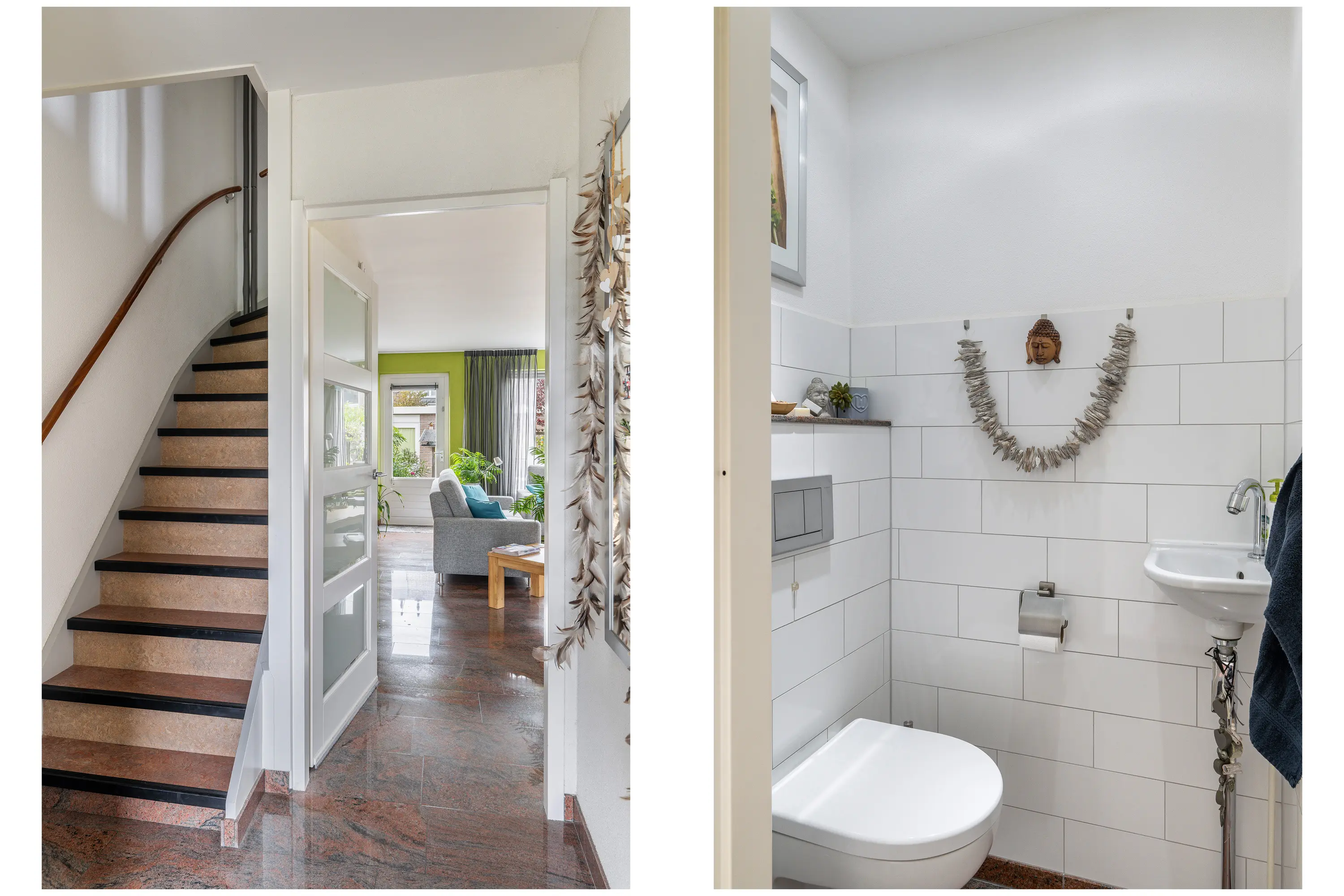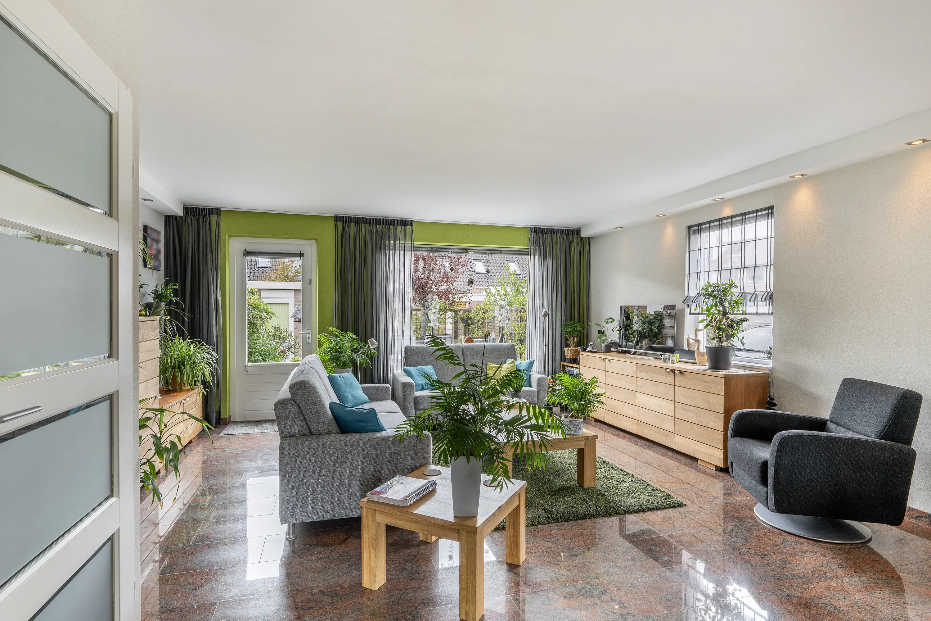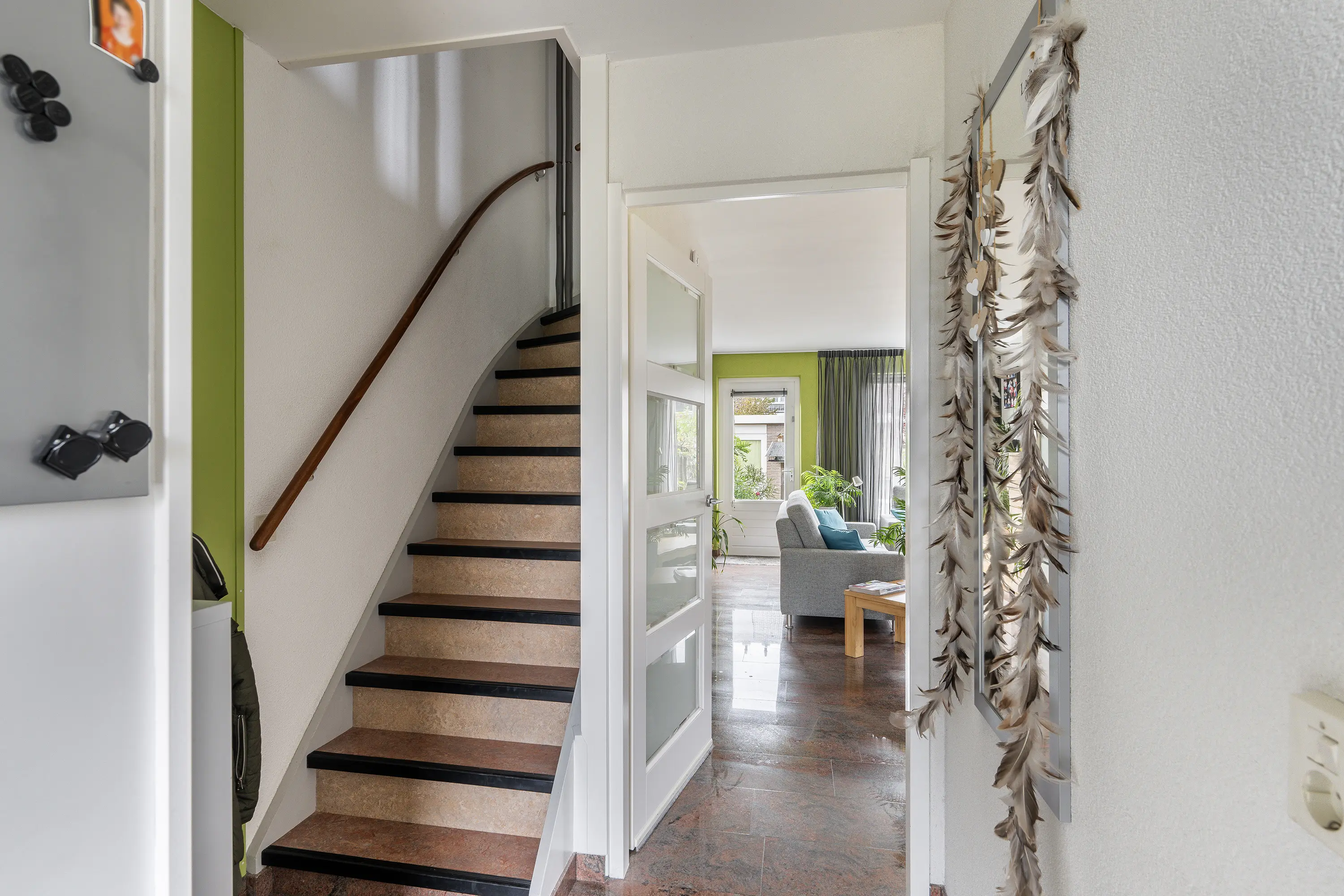 Via de verzorgde voortuin, waar het groen en de markies direct een uitnodigende indruk geven, komt u binnen in de hal. Deze biedt toegang tot het toilet, de trapopgang en de woonkamer. De woonkamer is voorzien van een nette plavuizenvloer (met vloerverwarming) en ingebouwde spots die aan weerszijden van het plafond zorgen voor een gelijkmatige verlichting.
