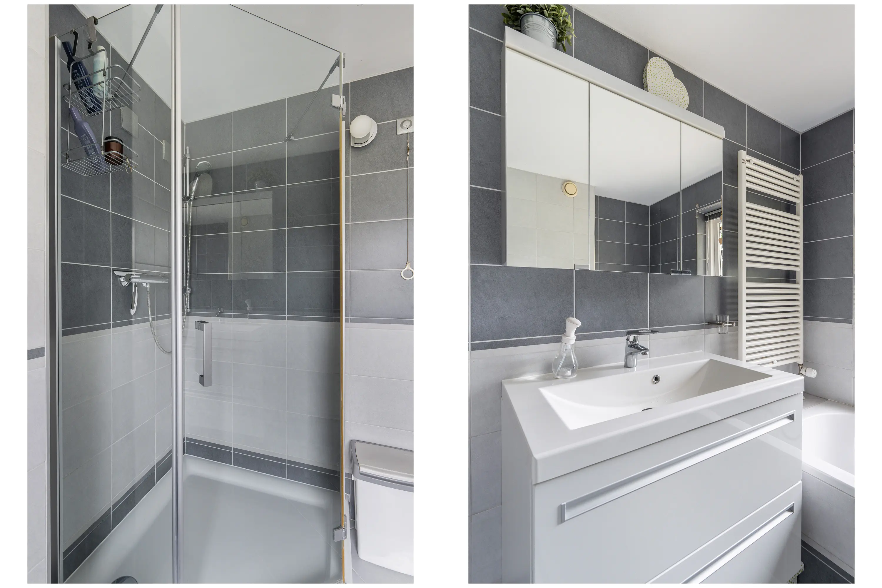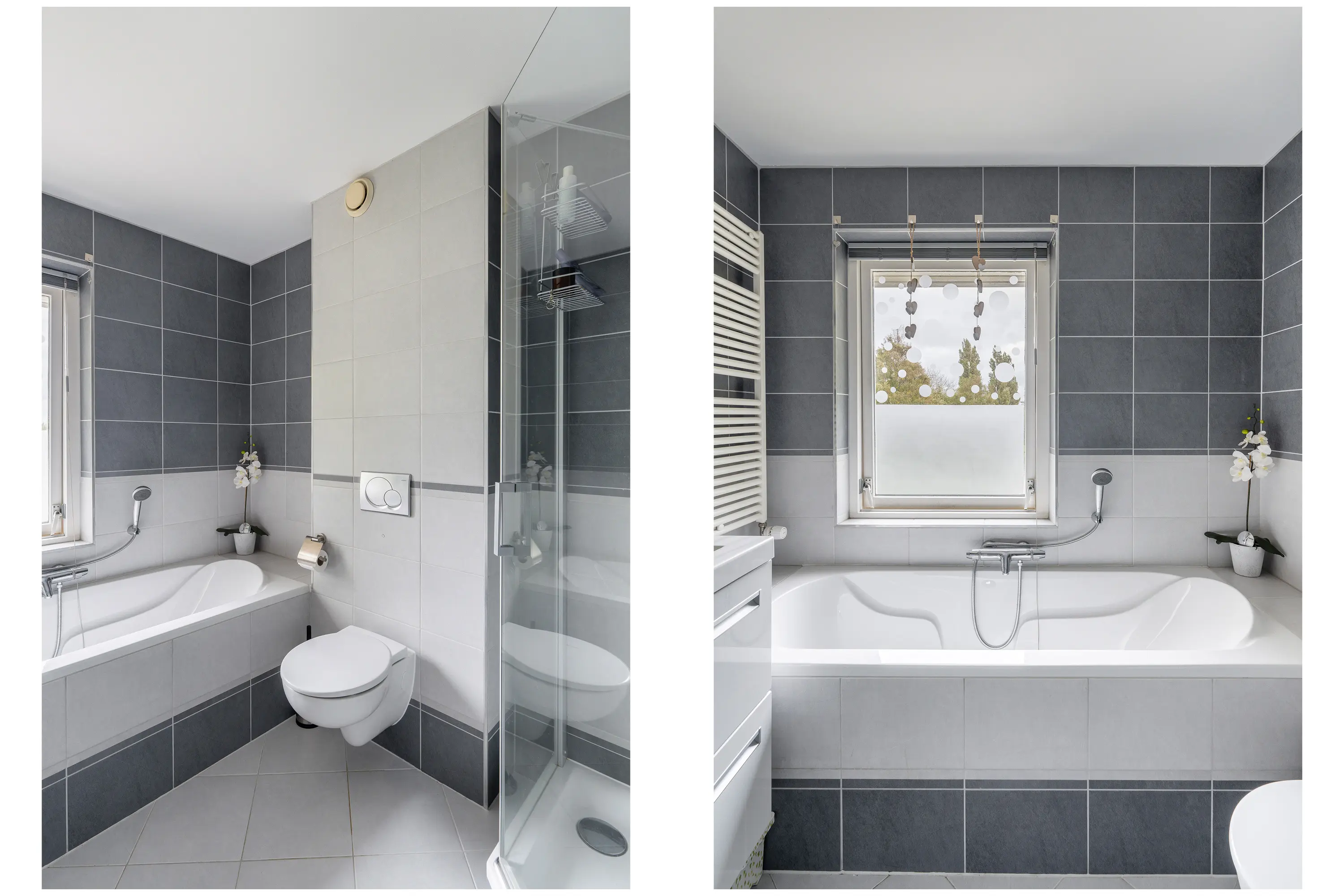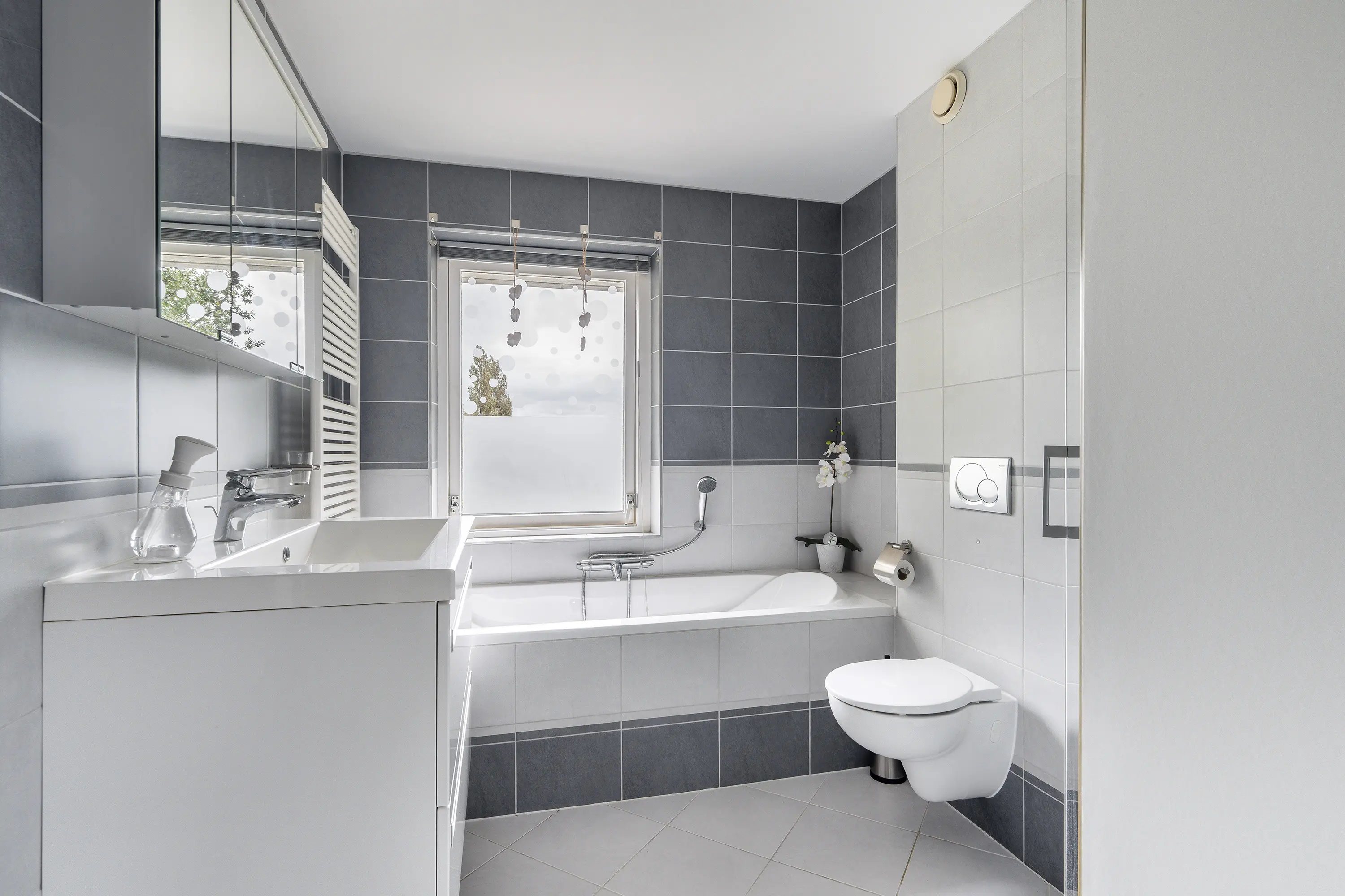 De badkamer is aan de voorzijde gesitueerd en uitgevoerd in een tijdloze wit-grijze kleurstelling. Hier vindt u een ligbad, een aparte douche, een tweede toilet, een wastafelmeubel met kastruimte en spiegel, en een radiator. Het aanwezige raam zorgt voor daglicht en natuurlijke ventilatie.