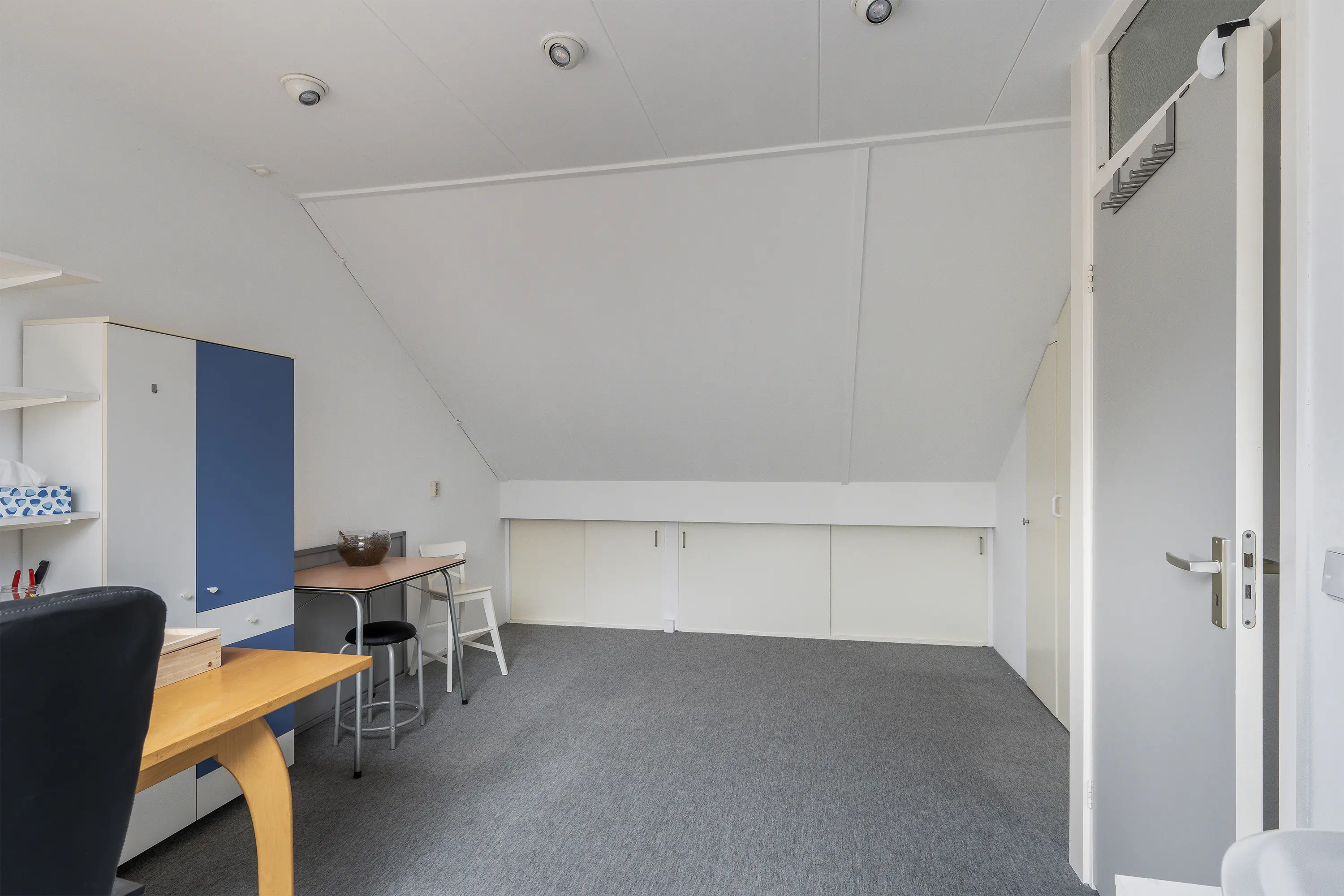De tweede verdieping verrast door de hoeveelheid ruimte en de veelzijdigheid ervan. Op deze verdieping is een ruime slaapkamer aanwezig met een dakraam, tapijt en een eigen wastafel. Achter de knieschotten bevindt zich bovendien veel bergruimte, ideaal voor koffers, seizoensspullen of andere zaken die u uit het zicht wilt opbergen.