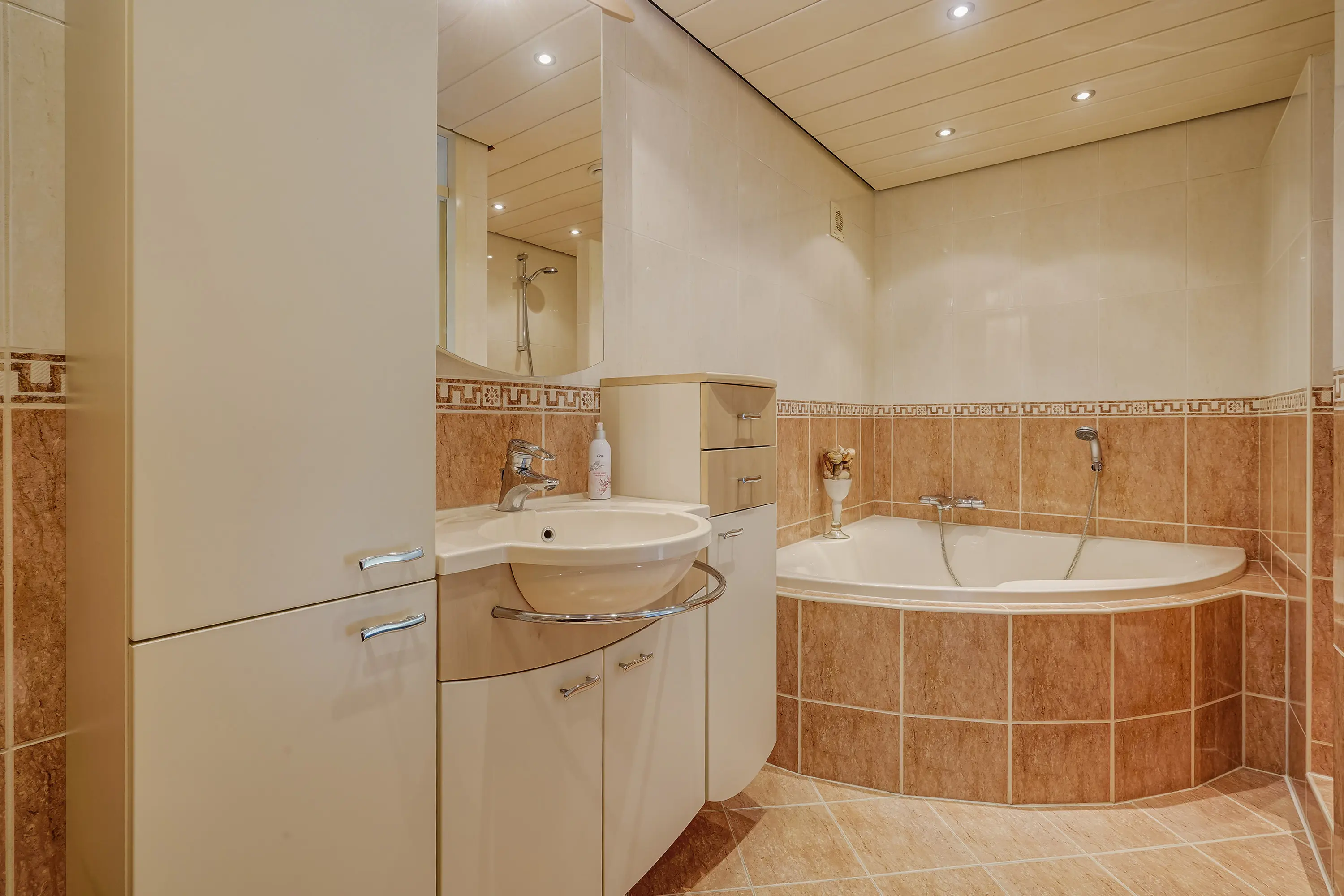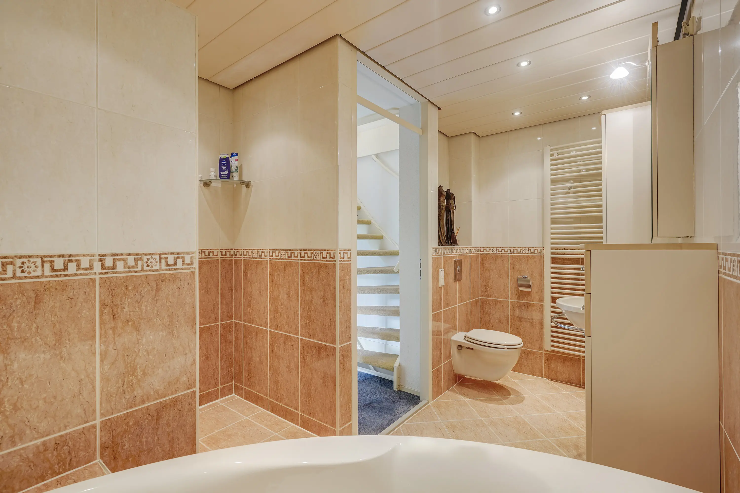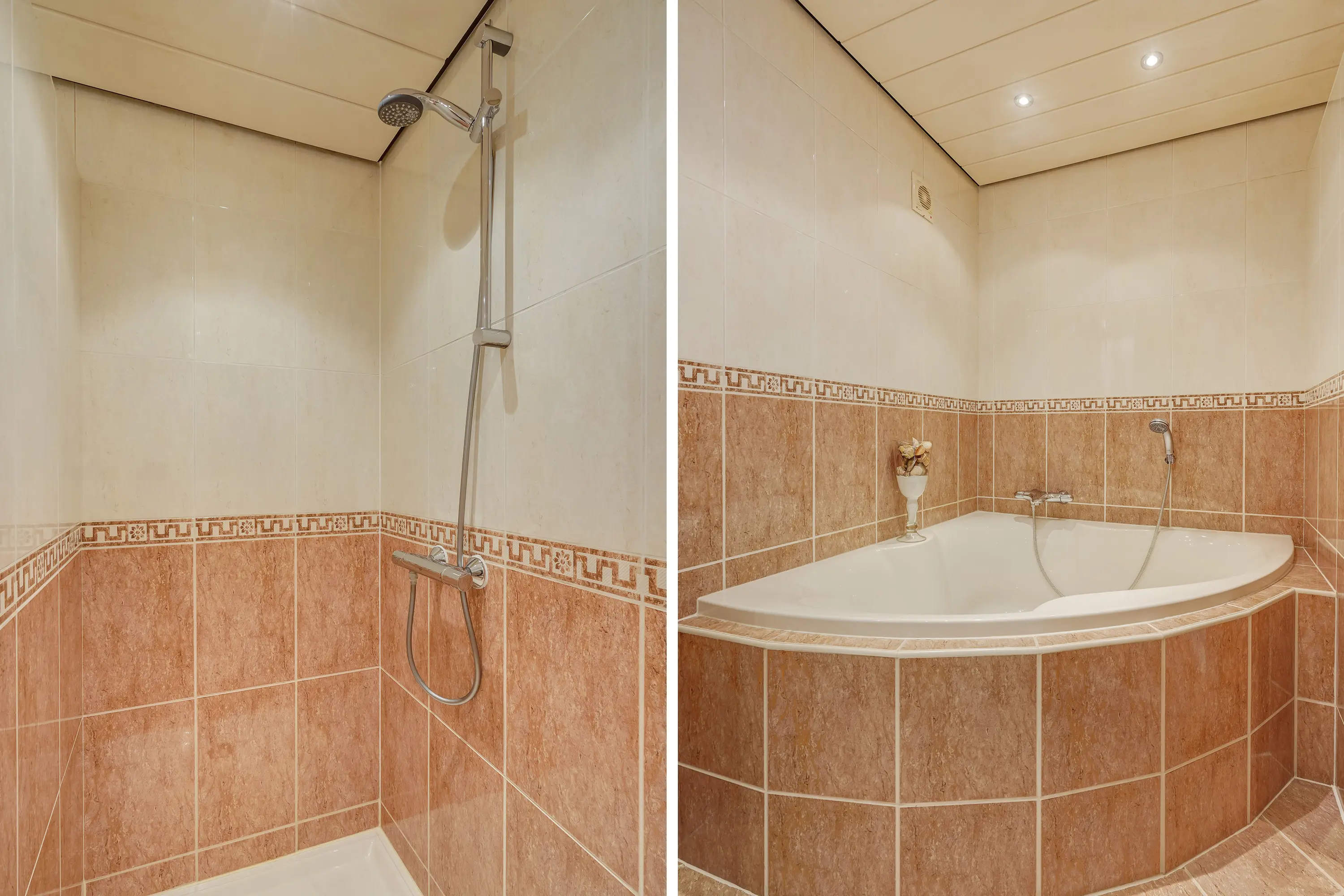 Eerste verdieping: Twee royale, woningbrede slaapkamers en een moderne badkamer geven iedereen zijn eigen plekje. De badkamer is uitgerust met hoekbad, inloopdouche, wastafelmeubel en tweede toilet.