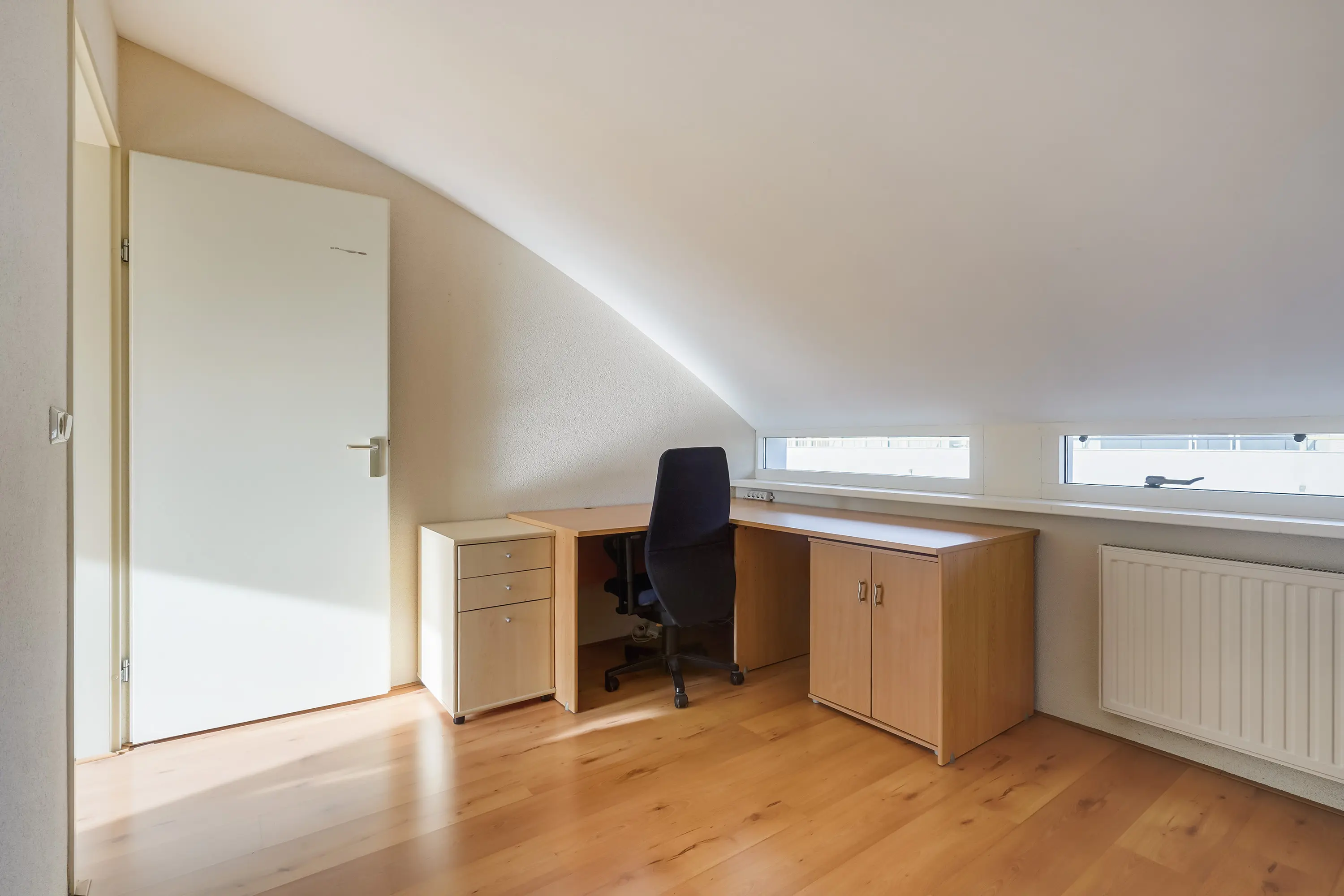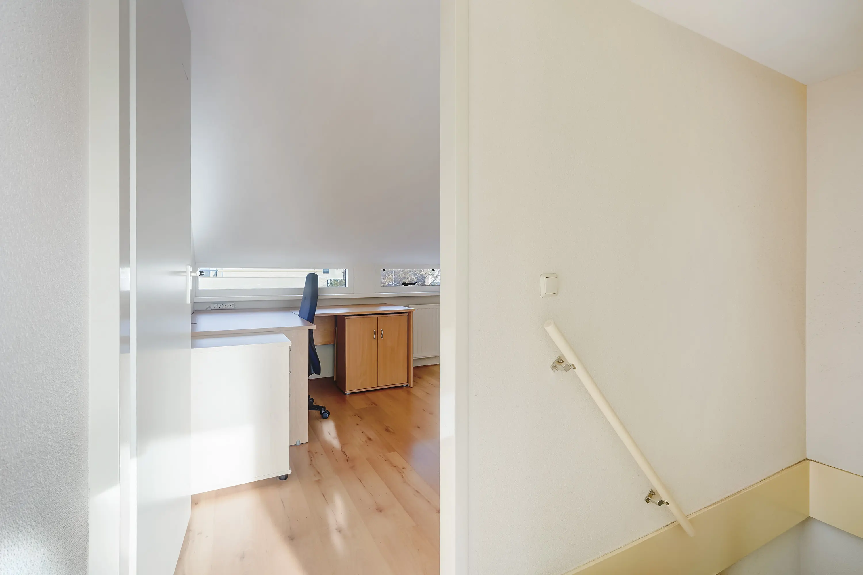 Tweede verdieping: Bereikbaar via een vaste trap, met nog eens twee slaapkamers onder het fraaie gebogen dak - perfect voor een groeiend gezin of als studeerkamer en logeerkamer. Een loopdeur biedt toegang tot een riant balkon van ca. 8 m2.