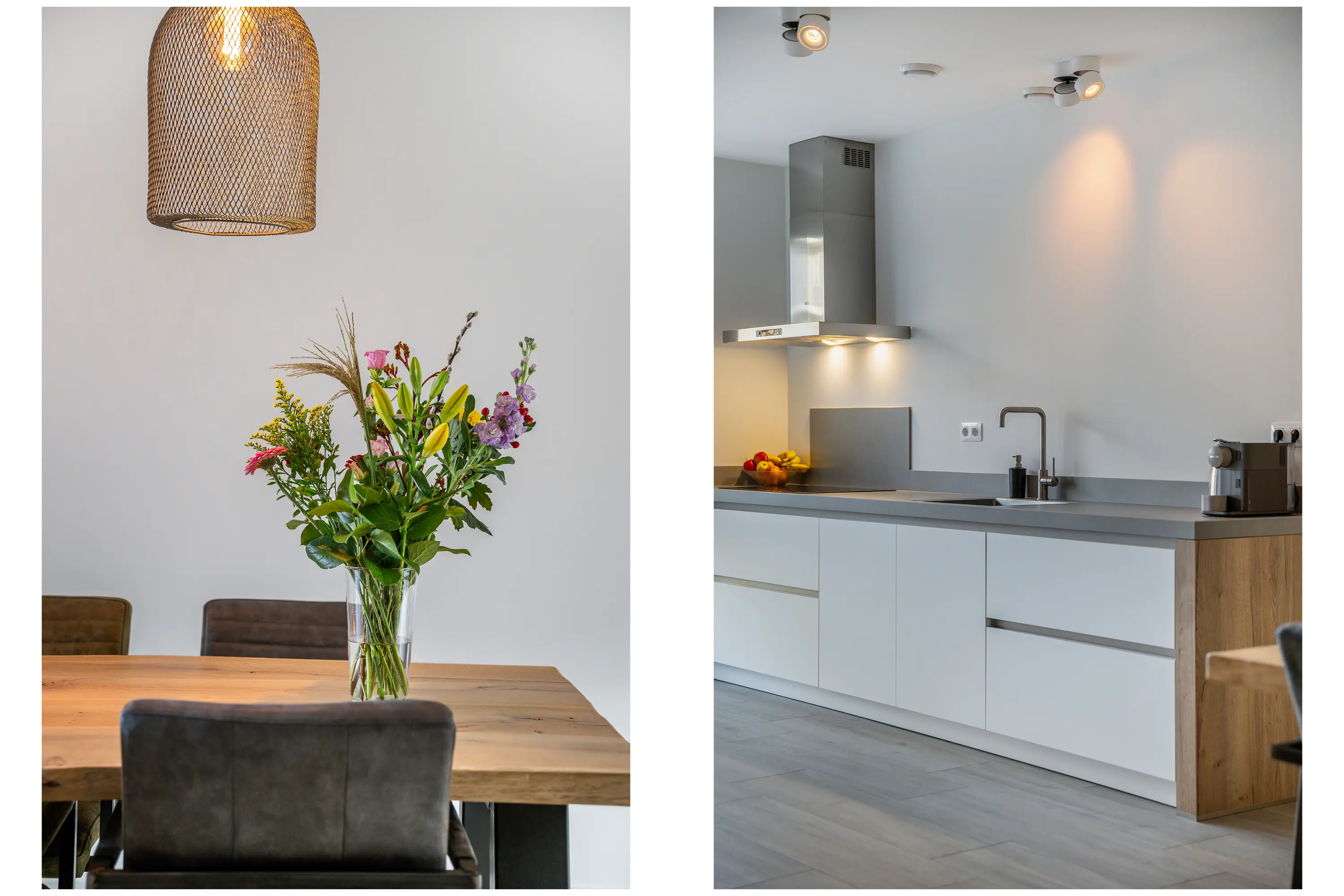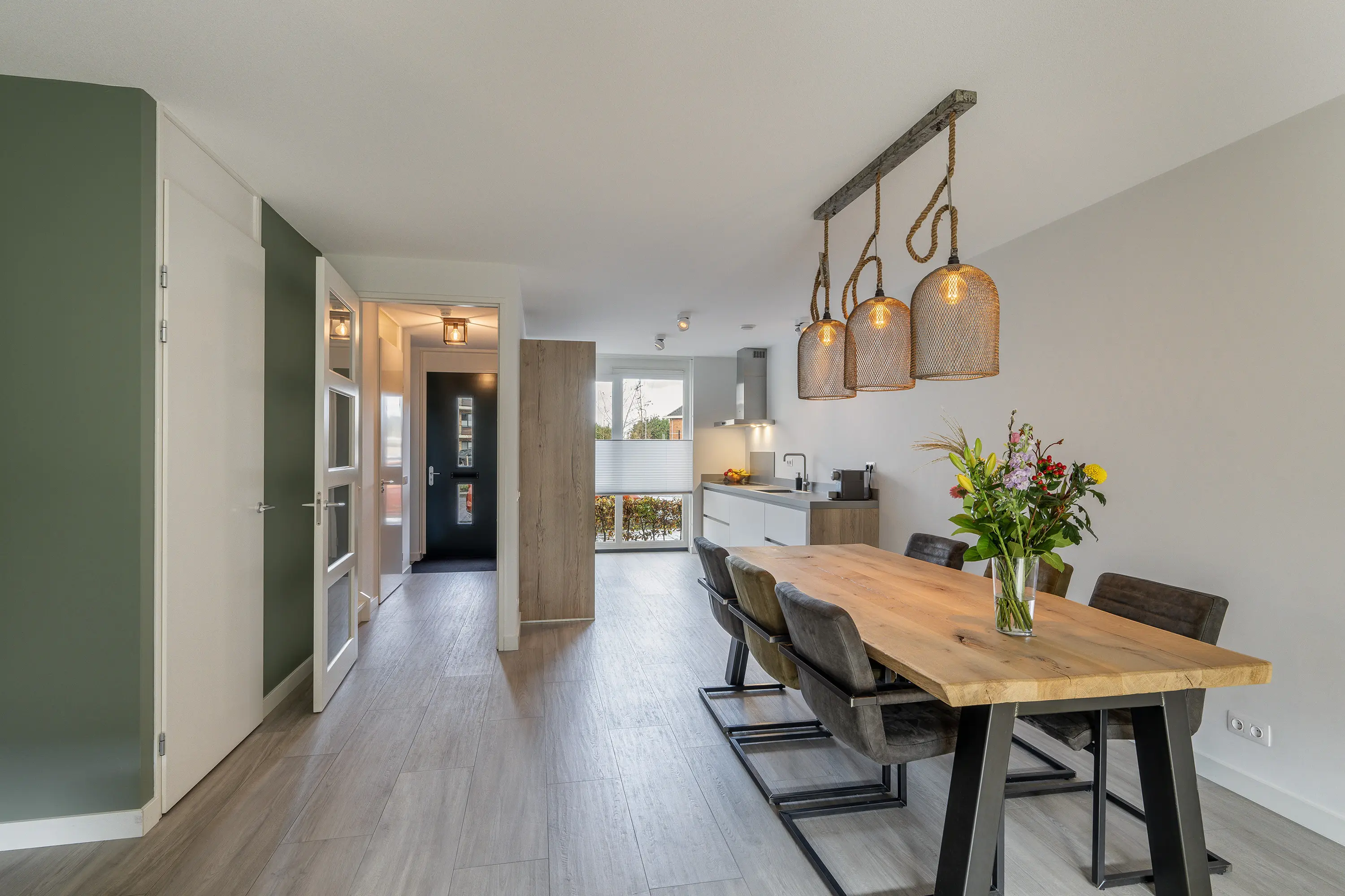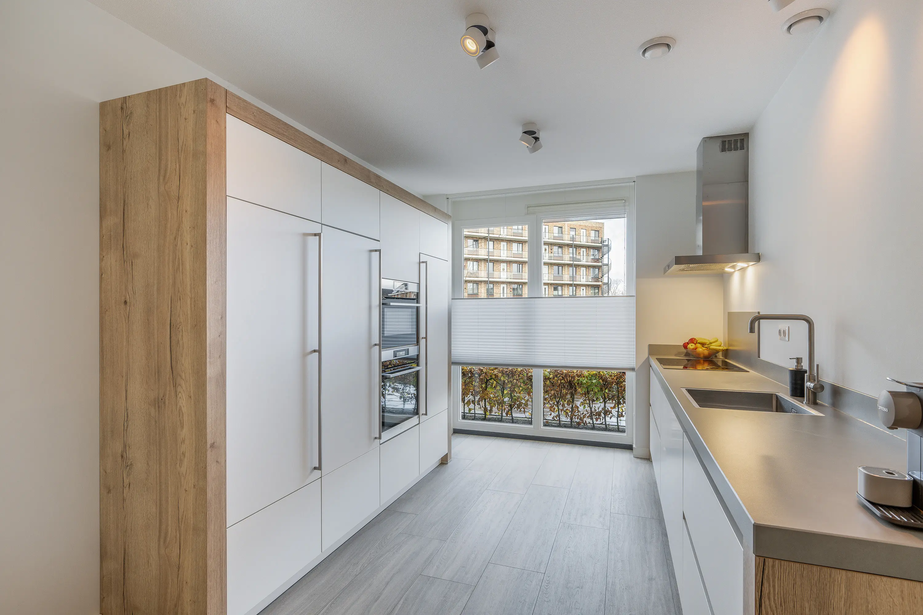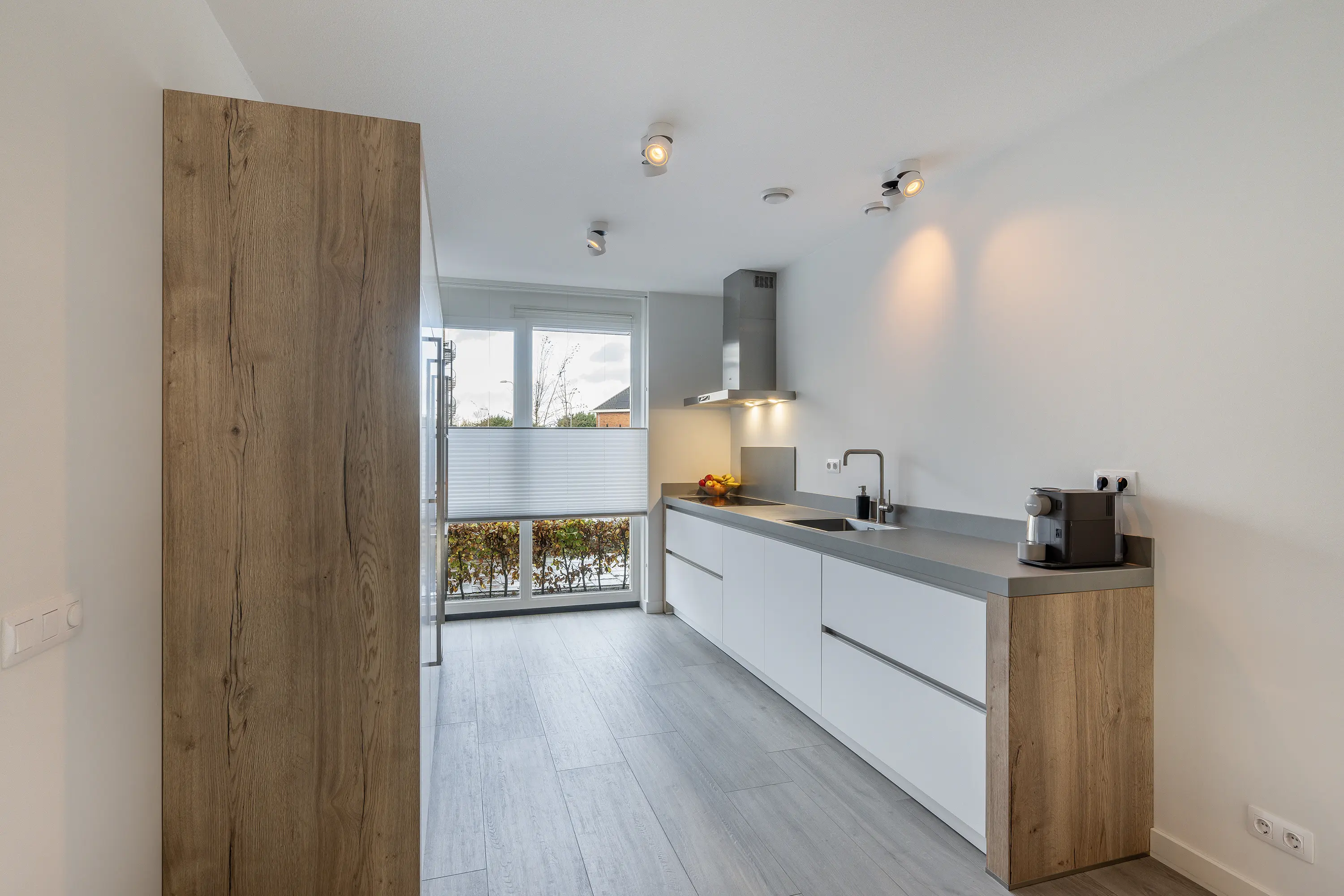 Aan de voorzijde bevindt zich de keuken, uitgevoerd in een tweedelige wandopstelling met ramen tot de grond. De keuken is volledig uitgerust met inbouwapparatuur van het merk AEG: inductiekookplaat, afzuigkap, oven, magnetron, XL-koelkast, XL-vriezer en vaatwasser. Vanuit de keuken heeft u zicht op het speeltuintje aan de voorzijde.