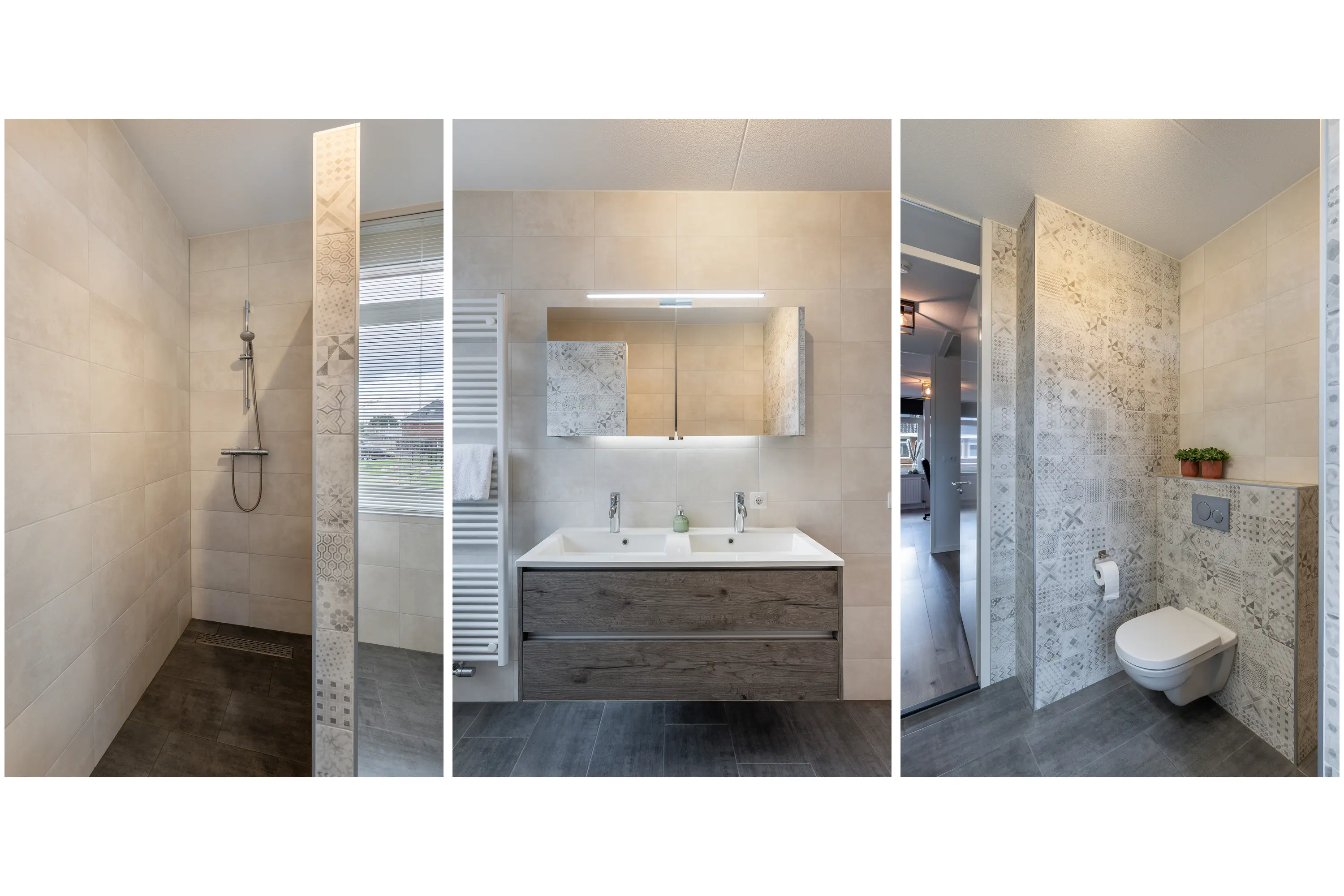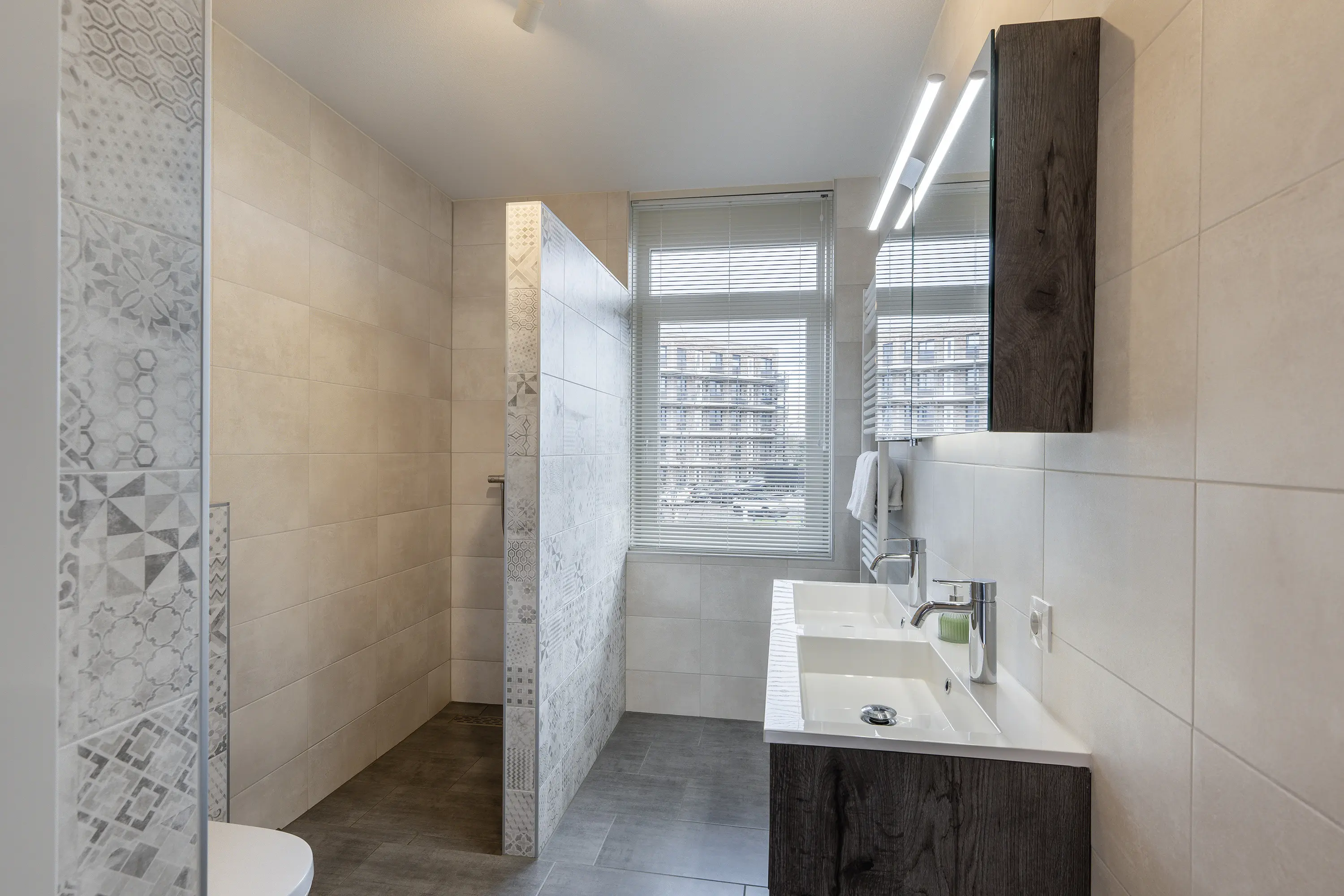 De badkamer is uitgerust met een inloopdouche, een dubbel wastafelmeubel in houtlook en een toilet.