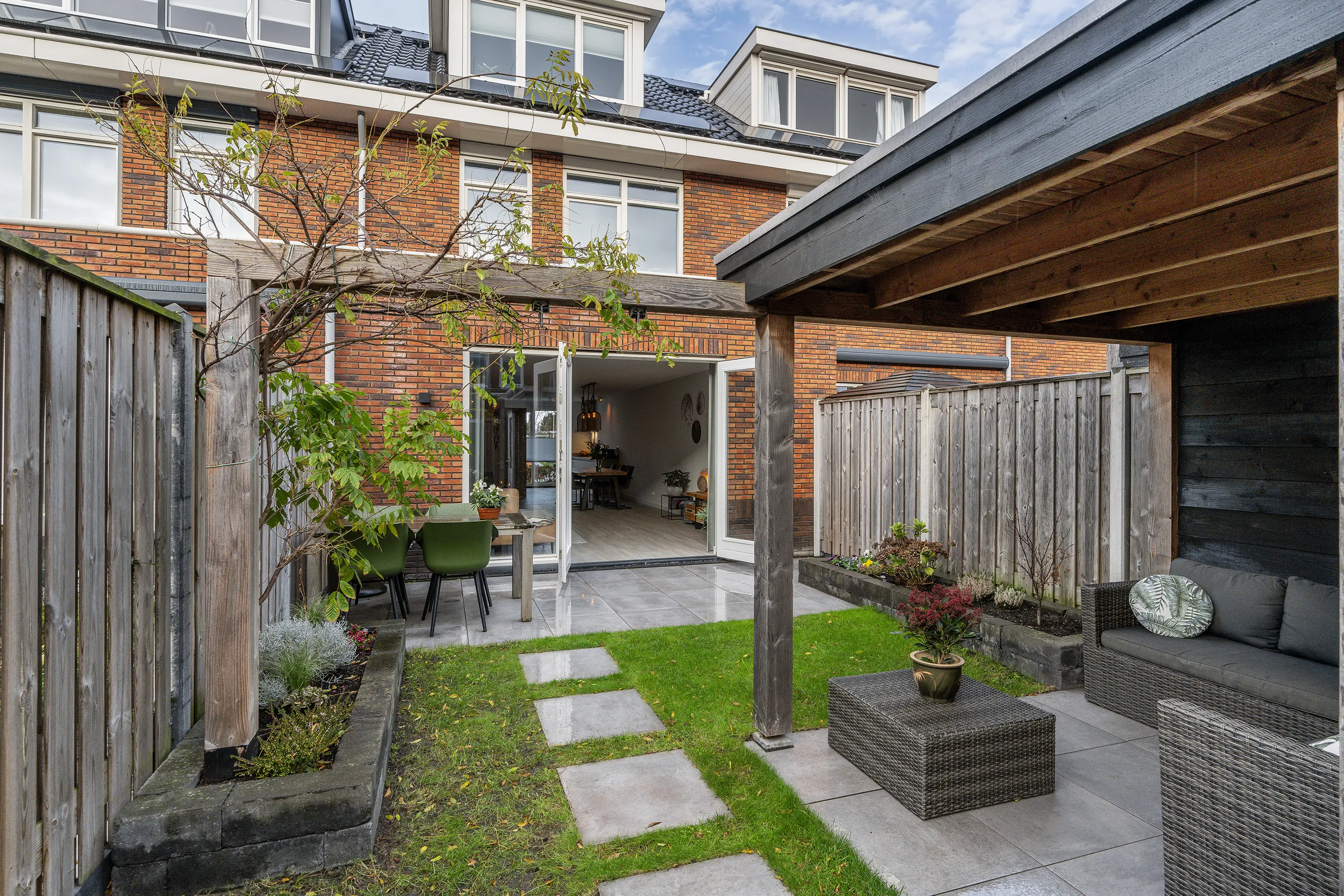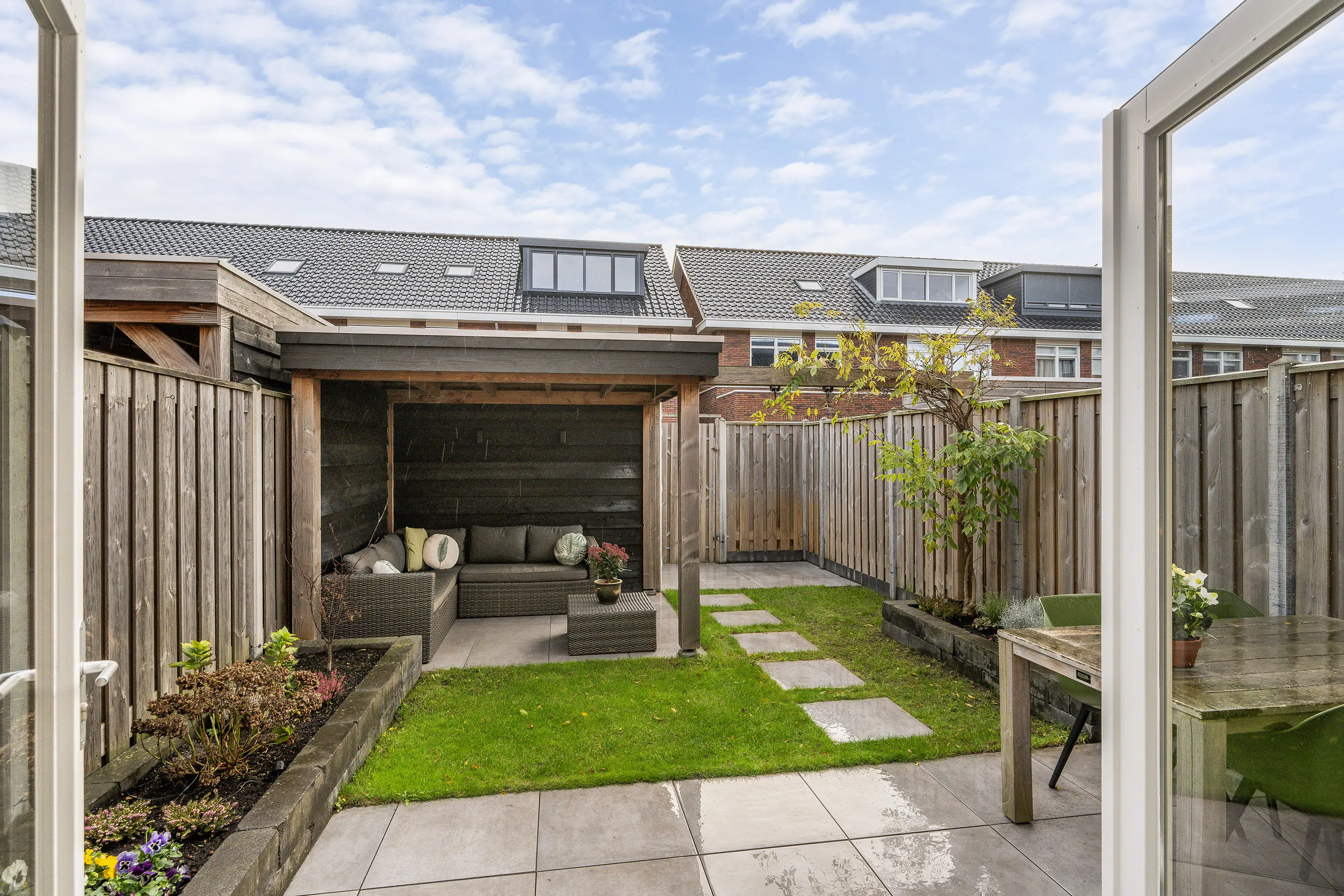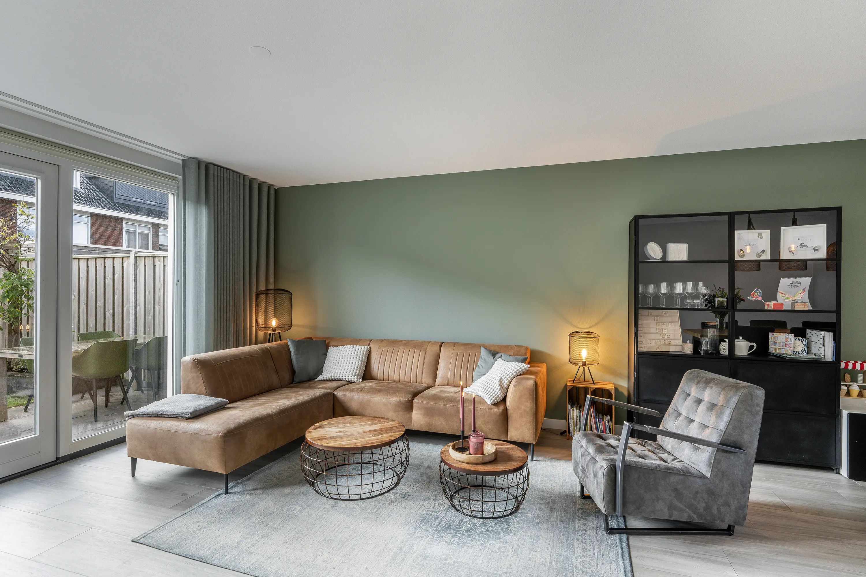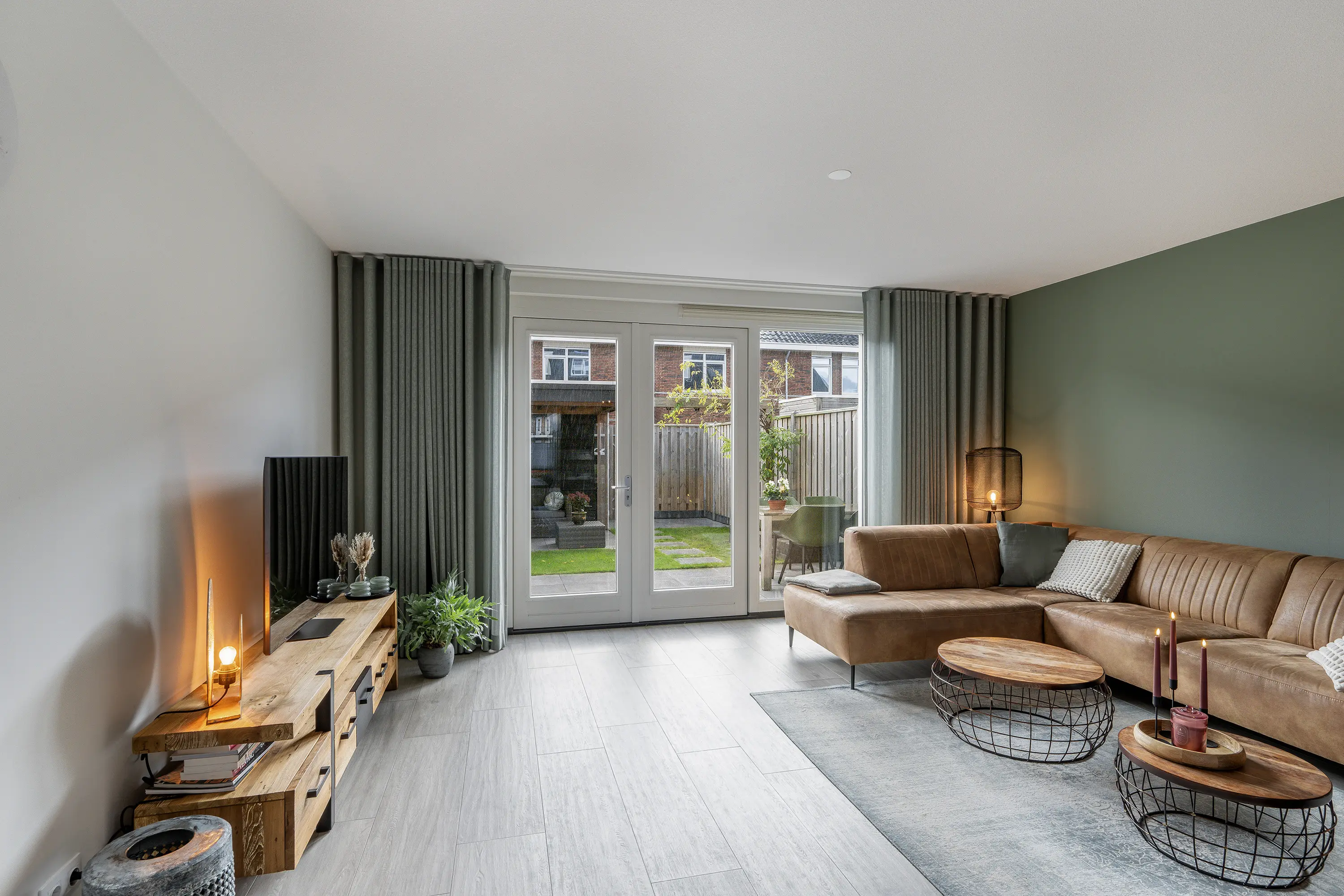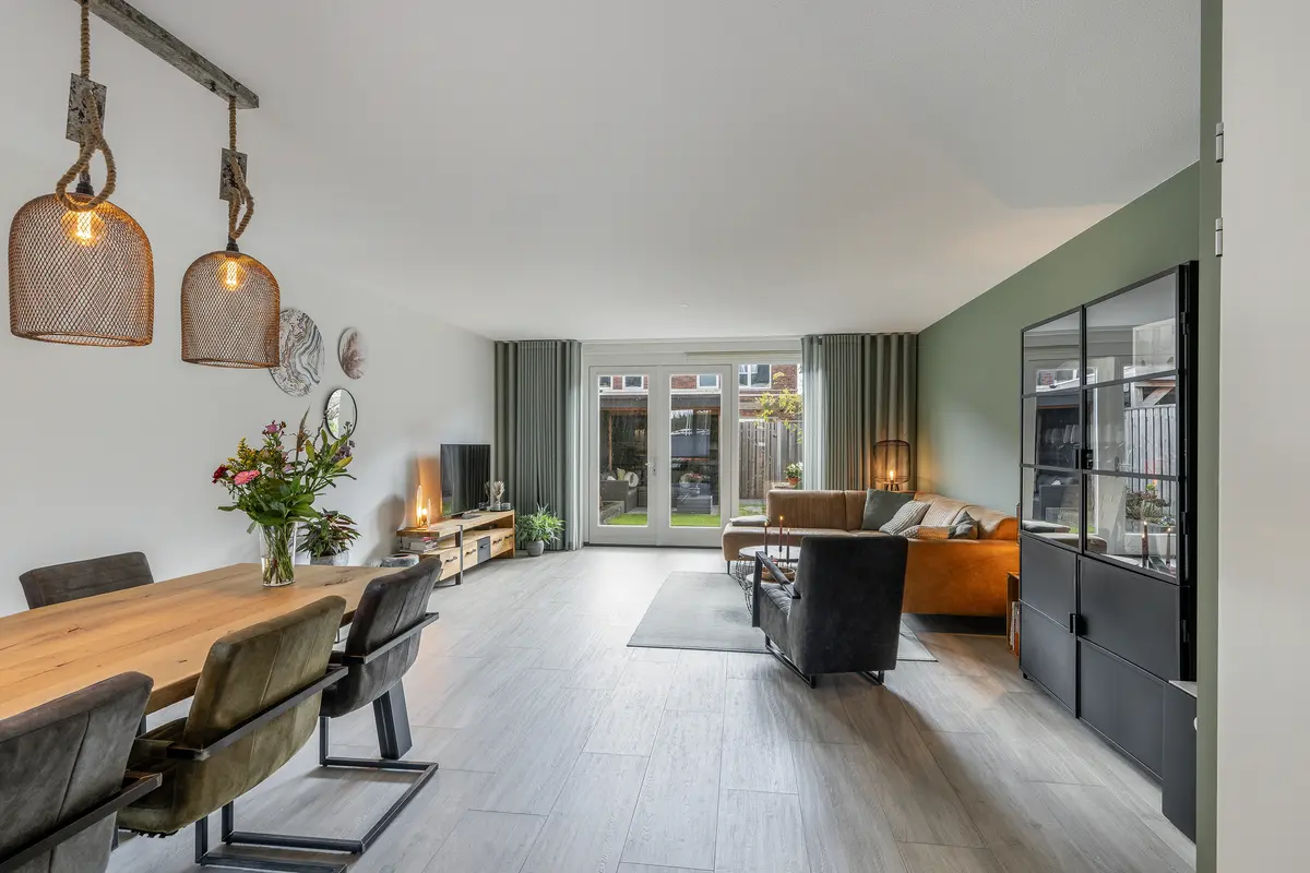 - Woonkamer met openslaande deuren naar de achtertuin, welke op het zuidoosten is gesitueerd;