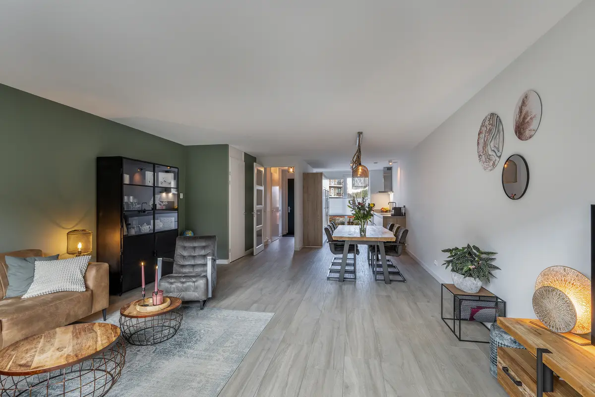 Vanuit de hal is de uitgebouwde woonkamer toegankelijk. De woonkamer is ruim en licht, mede dankzij het langgerekte raam aan de voorzijde en de openslaande deuren aan de achterzijde van de kamer. De trapkast biedt hier praktische bergruimte. De gehele begane grond wordt verwarmd middels vloerverwarming en is voorzien van een duurzame stenen vloer.