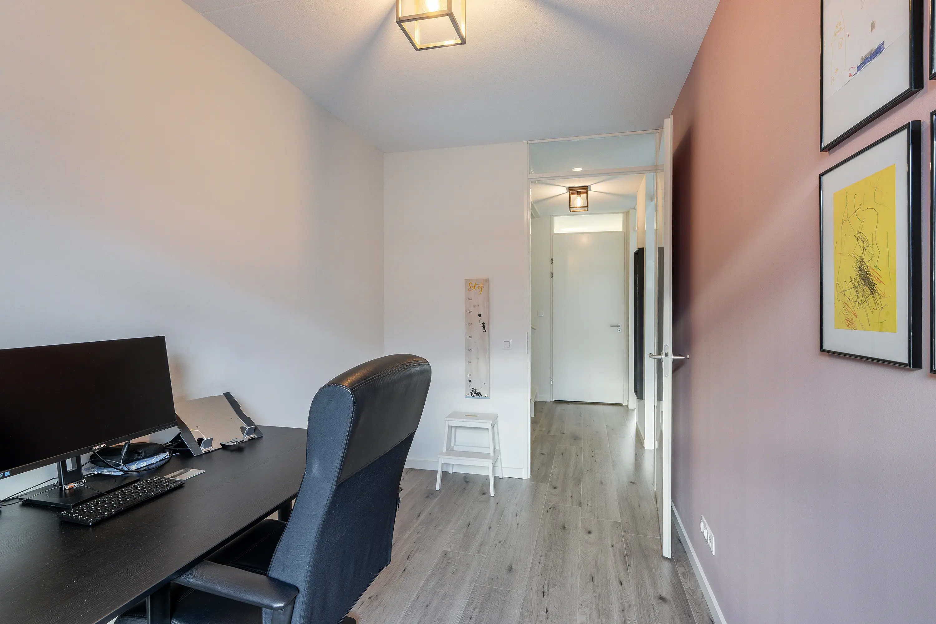 Twee van de drie slaapkamers liggen aan de achterzijde. Eén wordt momenteel gebruikt als kinderkamer, de andere als werkruimte, maar beide zijn groot genoeg om ook als volwaardige slaapkamer te dienen. De hoofdslaapkamer ligt aan de voorzijde en is voorzien van een ingebouwde kastenwand.