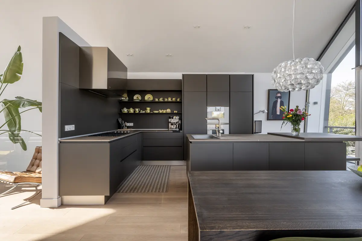 De luxe woonkeuken is uitgerust met hoogwaardige apparatuur van Gaggenau en vormt een stijlvol middelpunt van de leefruimte.
