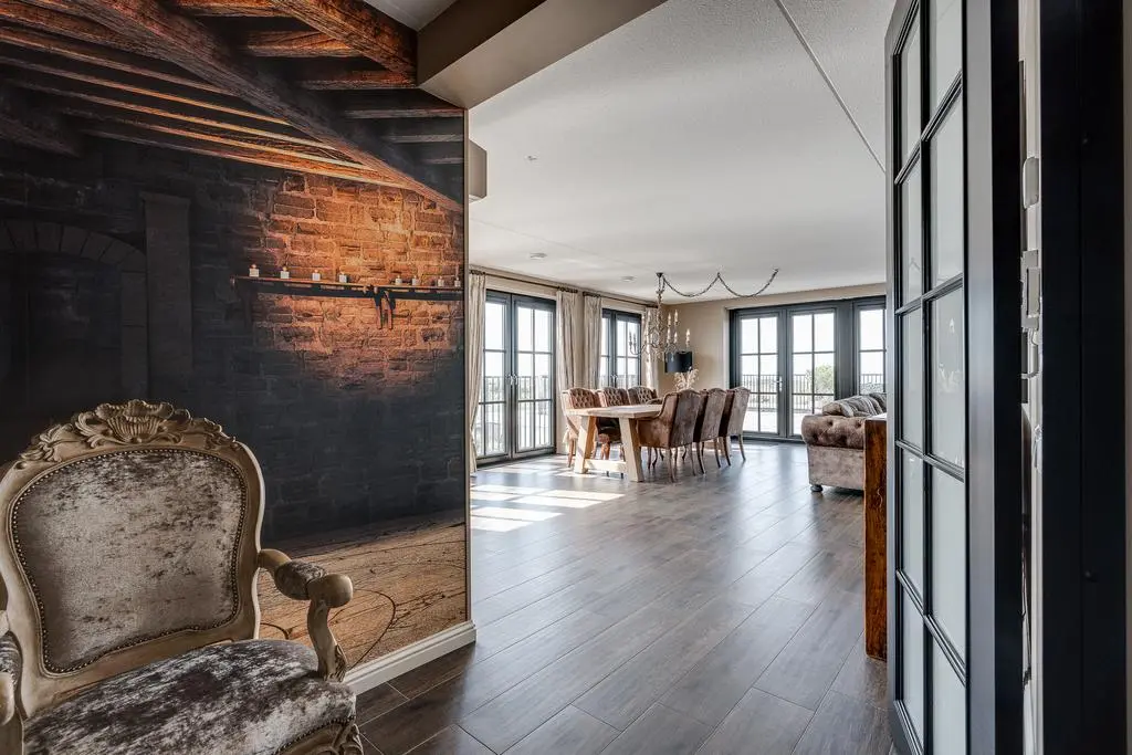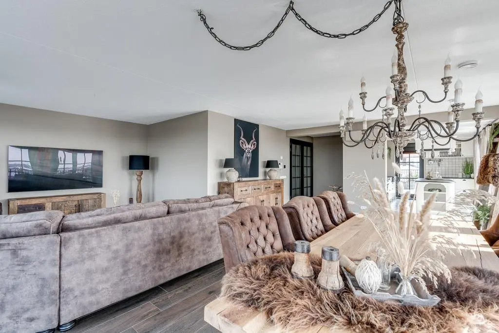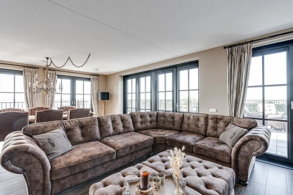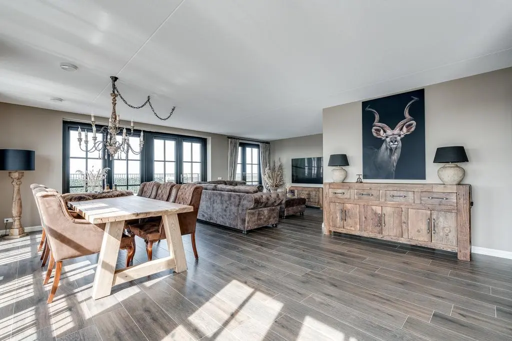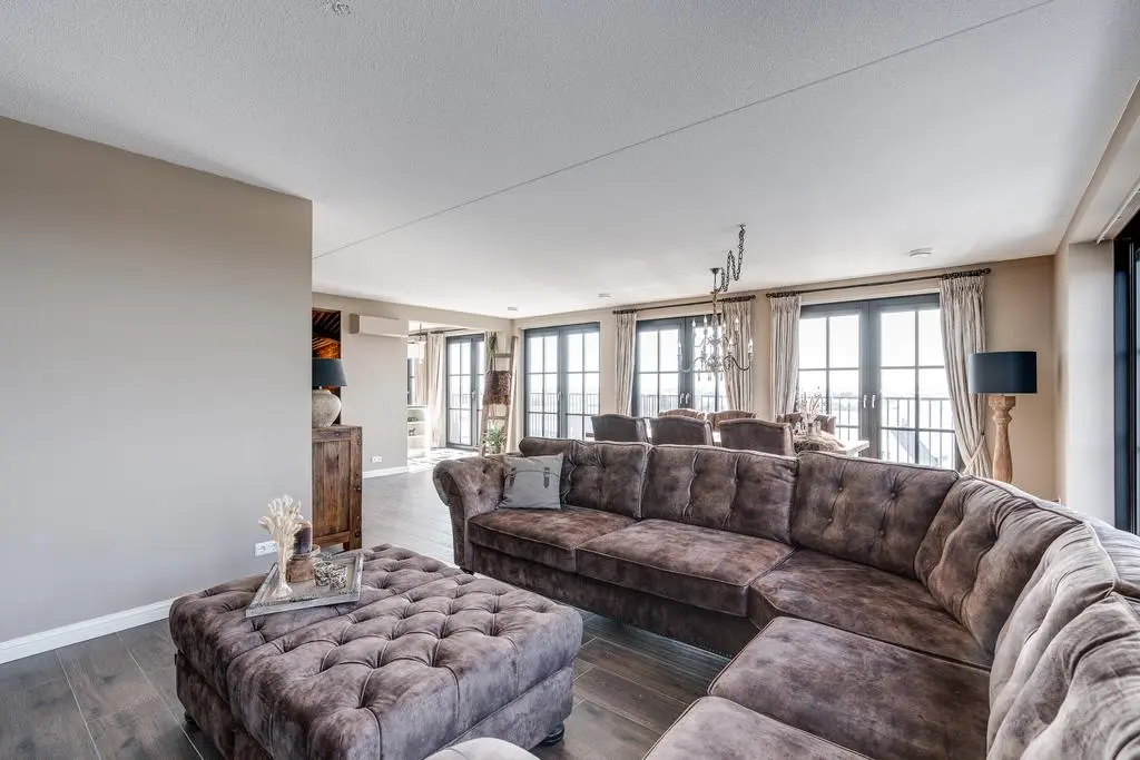 De royale woonkamer baadt in natuurlijk licht dankzij de grote raampartijen en openslaande deuren naar twee zonneterrassen en een balkon. De keramische parketvloer met vloerverwarming, strak afgewerkte wanden en smaakvolle inrichting – waaronder een LED-TV en elegante eethoek – zorgen voor een warme, uitnodigende sfeer.