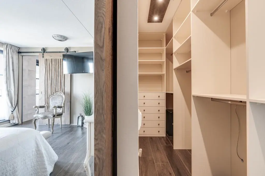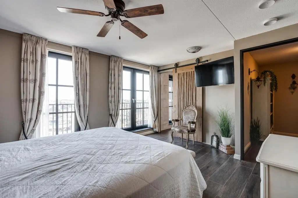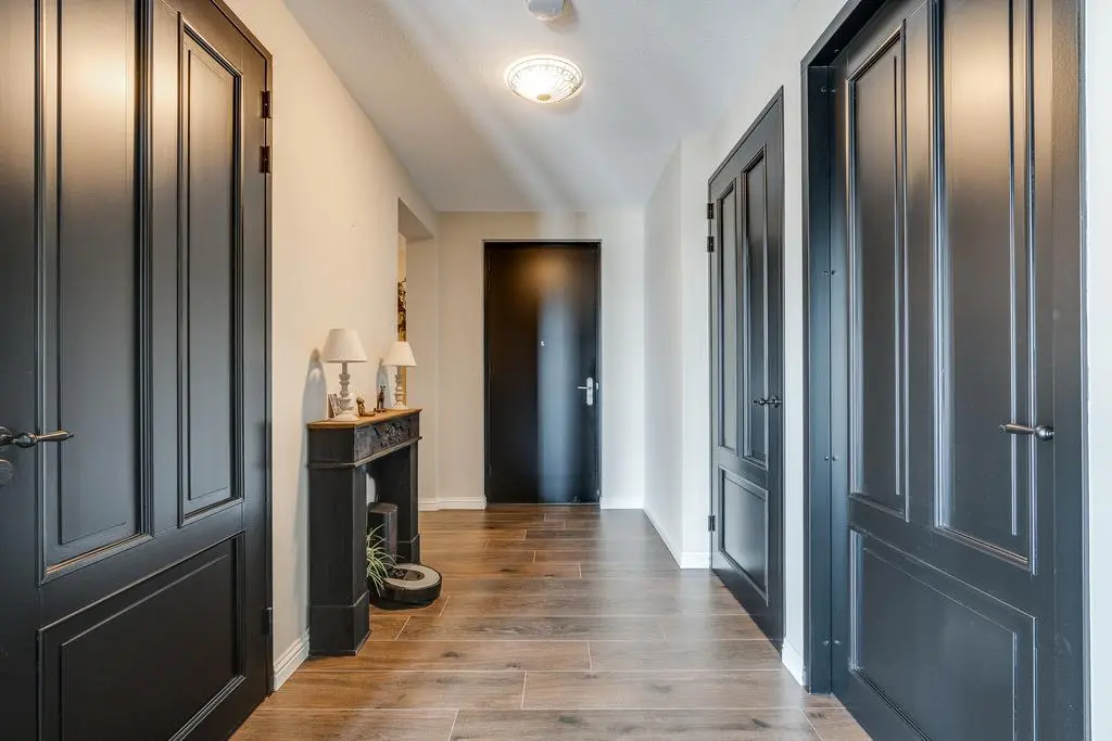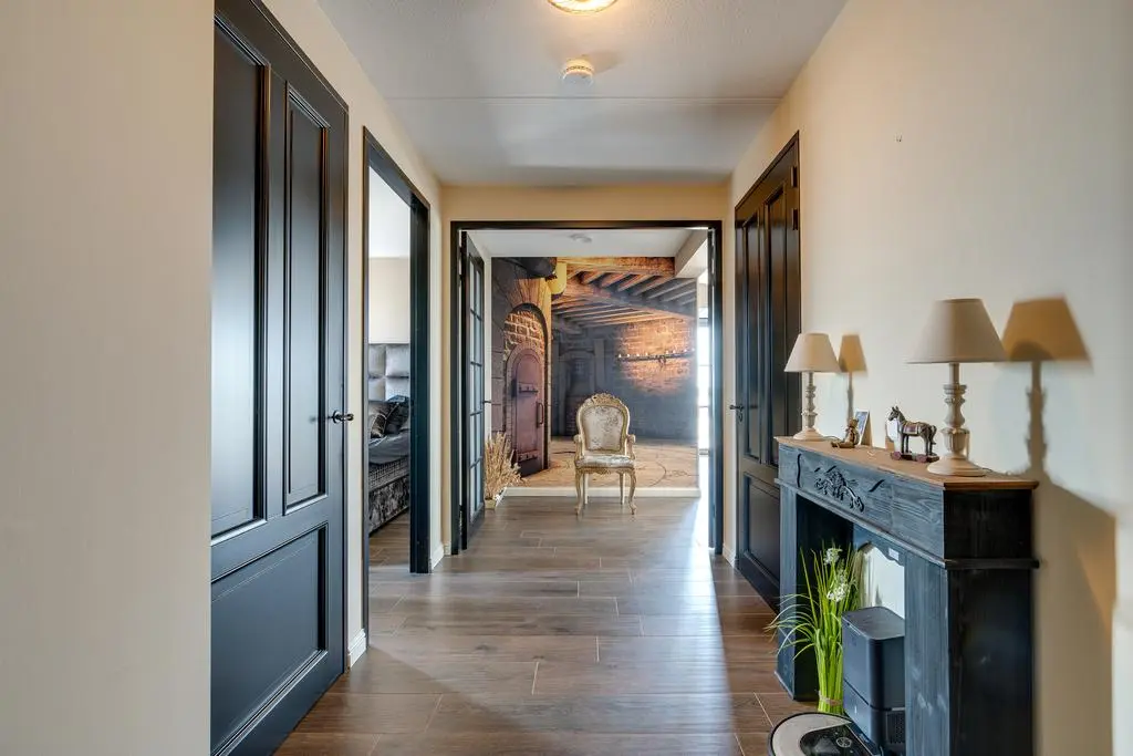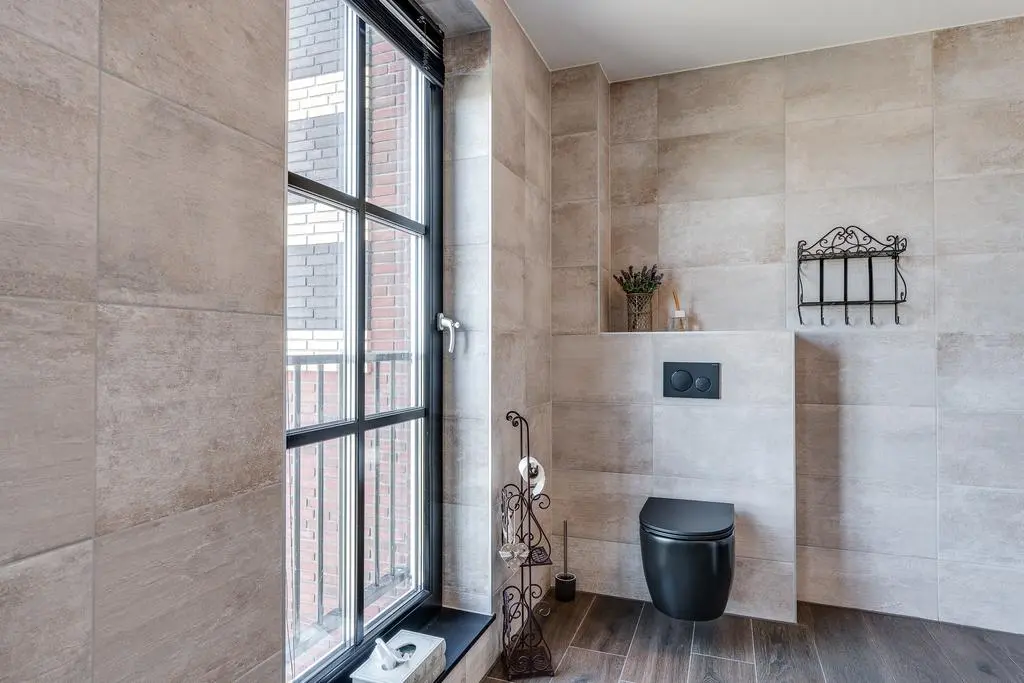 De royale woonkamer baadt in natuurlijk licht dankzij de grote raampartijen en openslaande deuren naar twee zonneterrassen en een balkon. De keramische parketvloer met vloerverwarming, strak afgewerkte wanden en smaakvolle inrichting – waaronder een LED-TV en elegante eethoek – zorgen voor een warme, uitnodigende sfeer.