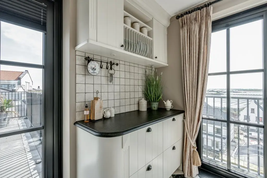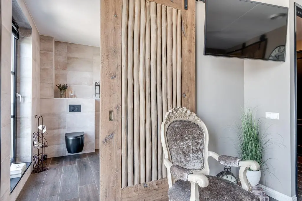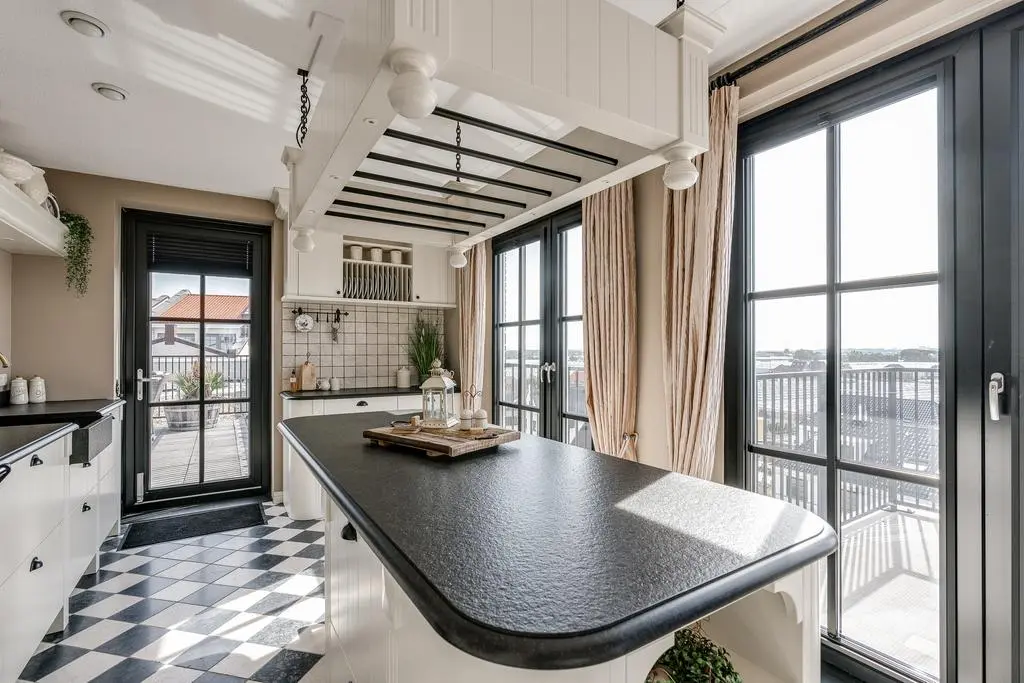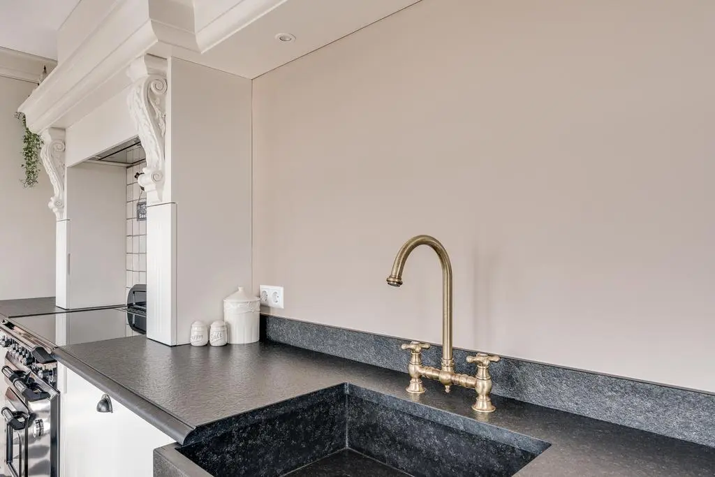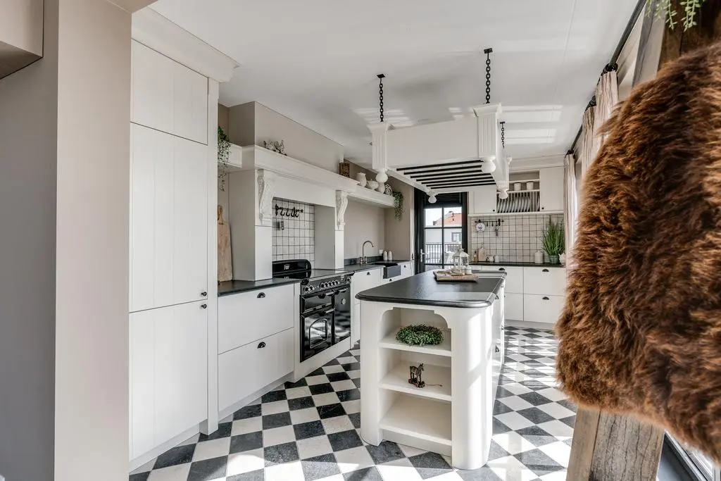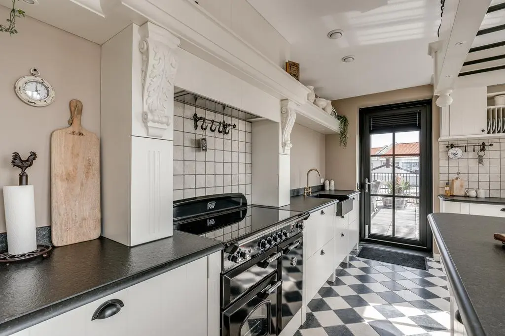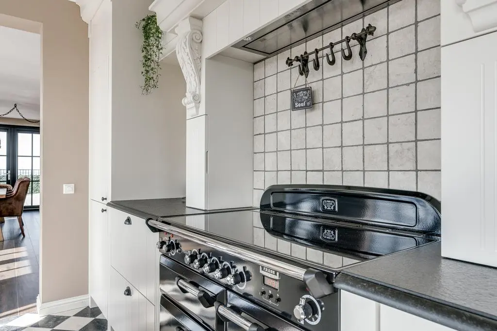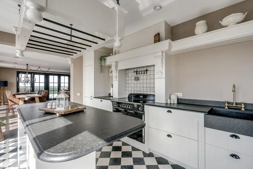 De open keuken in landelijke stijl is een eyecatcher. Centraal staat een karakteristiek Falcon kooktoestel met keramische kookplaat, dubbele oven en grill, omgeven door een stijlvolle houten ombouw met afzuigkap. De keuken is verder uitgerust met hoogwaardige apparatuur van Miele, een royale bar en extra bergruimte. De zwart-witte tegelvloer maakt het geheel af.