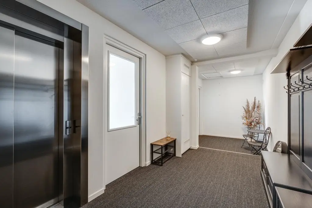 Bij binnenkomst via de stijlvolle entree op kelderniveau, bereikt u het penthouse op de vijfde verdieping per lift of via een van de twee trappenhuizen. De ruime overloop met garderobe leidt naar een indrukwekkende hal, die toegang biedt tot alle vertrekken.