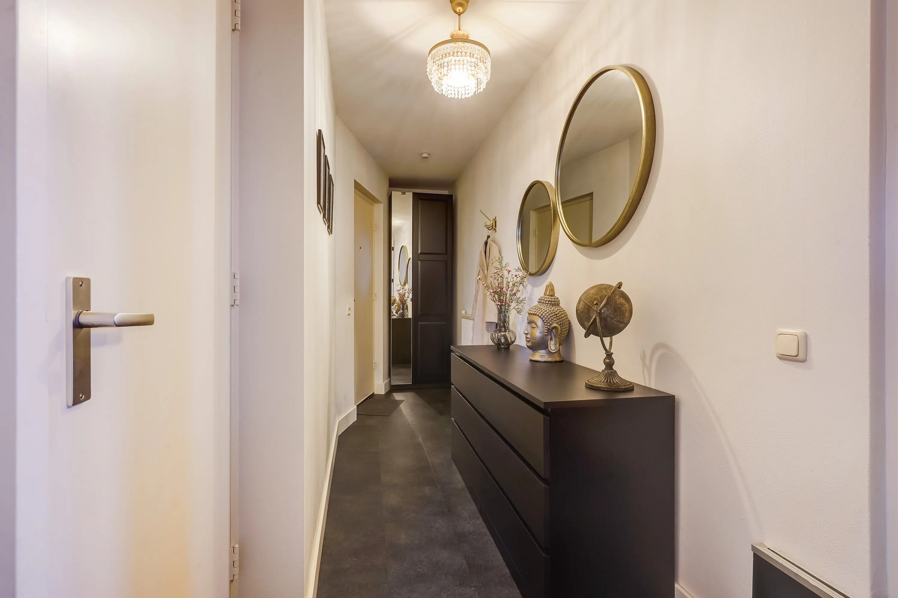 Via de centrale hal met bellentableau, lift en trappenhuis bereikt u het appartement. Een lange, ruime hal met garderobe en vaste kast (CV-ketel AWB, 2018) leidt naar de verschillende vertrekken.