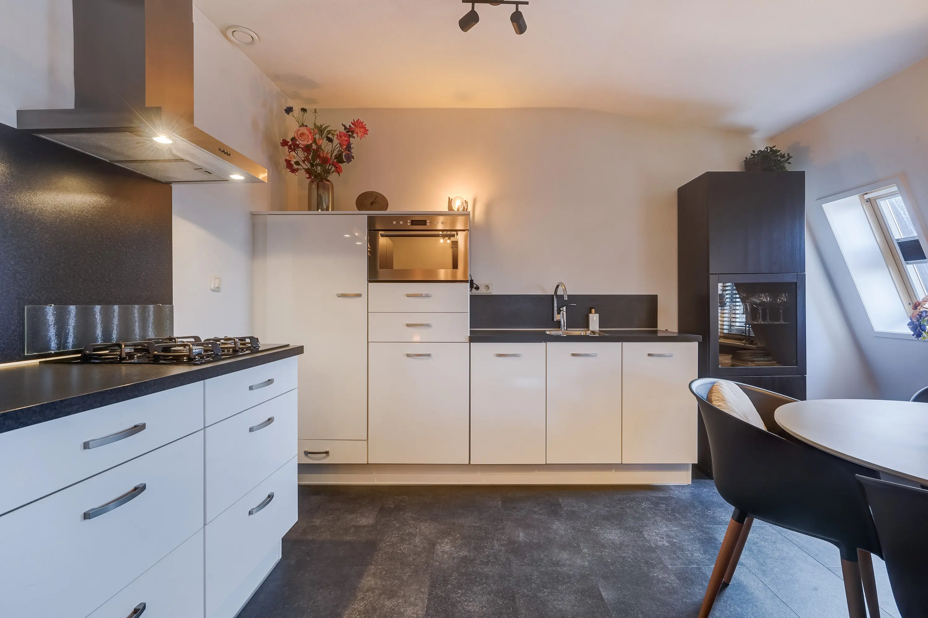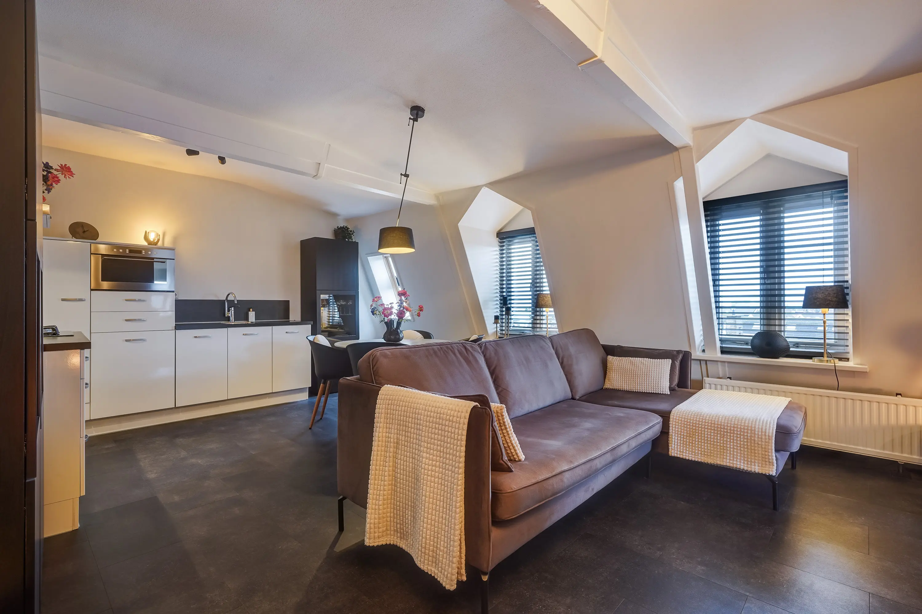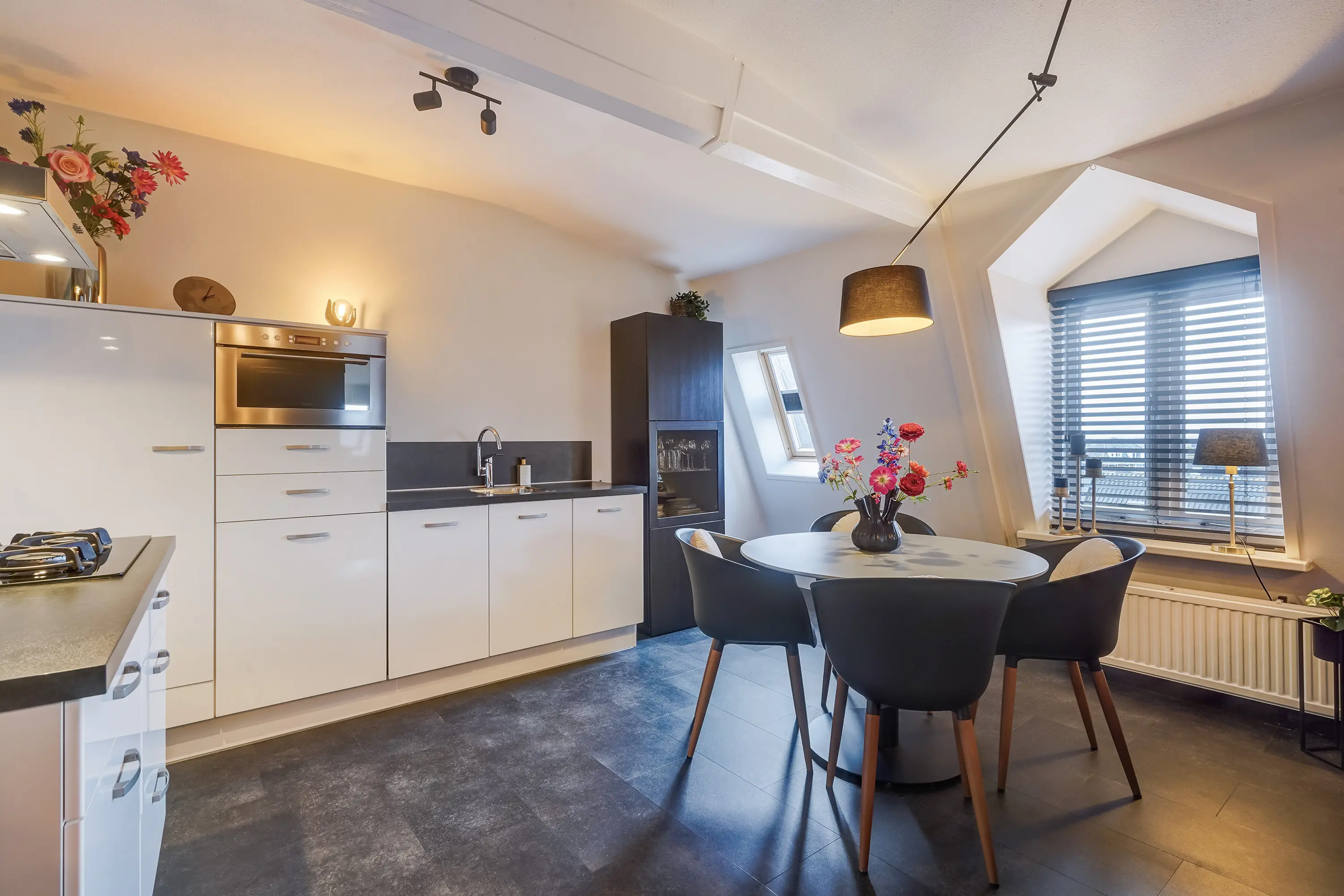 De open hoekkeuken is modern en compleet: vaatwasser (2020), koelkast, vriezer en combimagnetron. Het gehele appartement is stijlvol afgewerkt met een pvc-vloer, recent schilderwerk (voorjaar 2025), moderne materialen en karakteristieke houten balken, waardoor het charmante karakter behouden blijft.