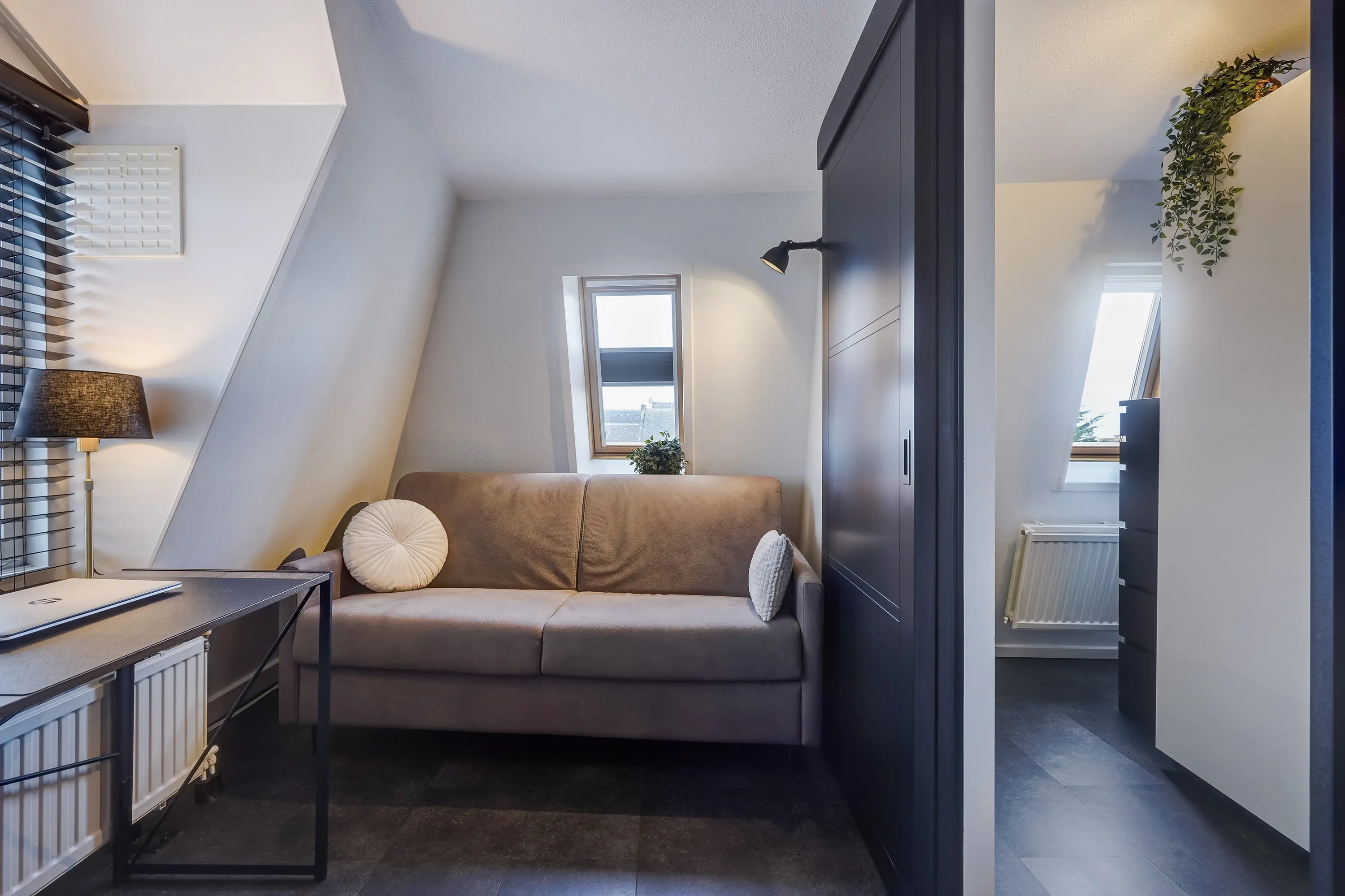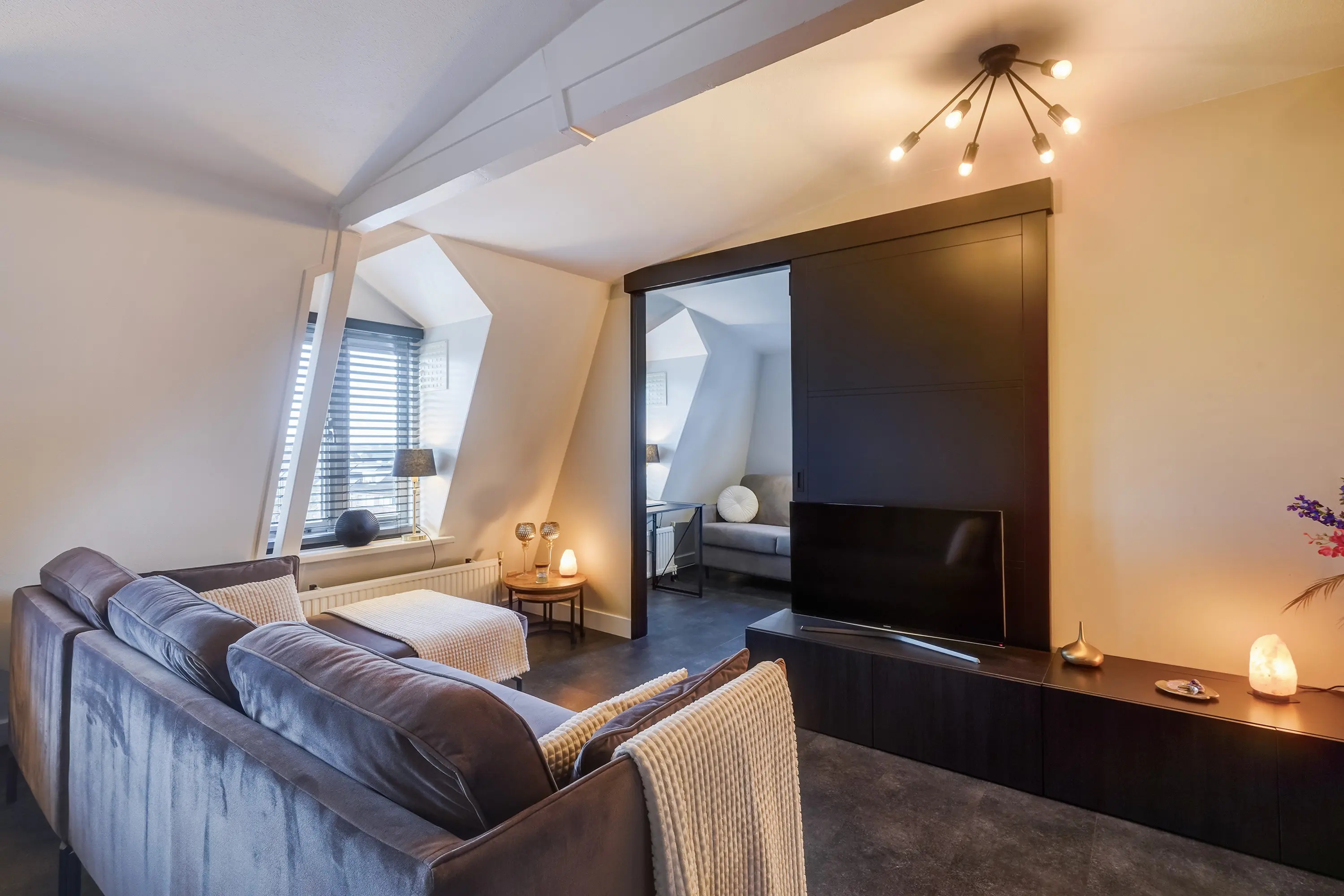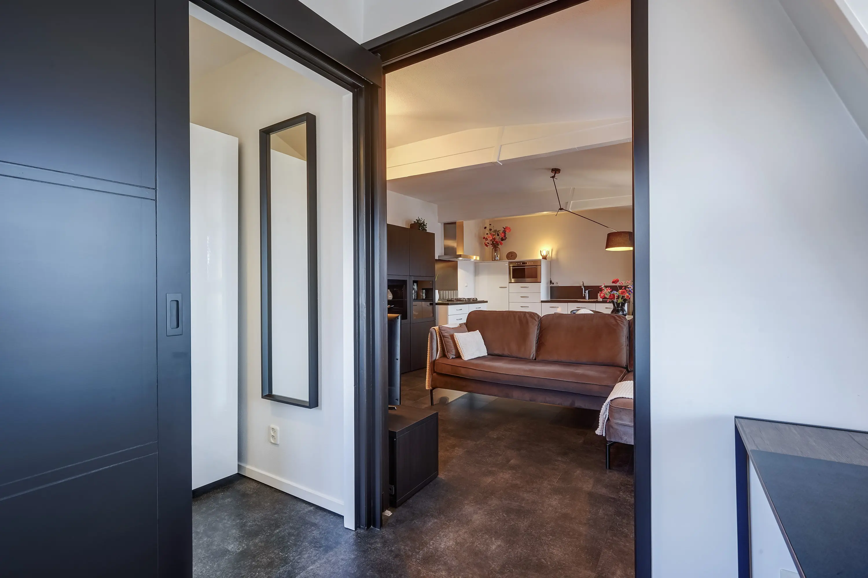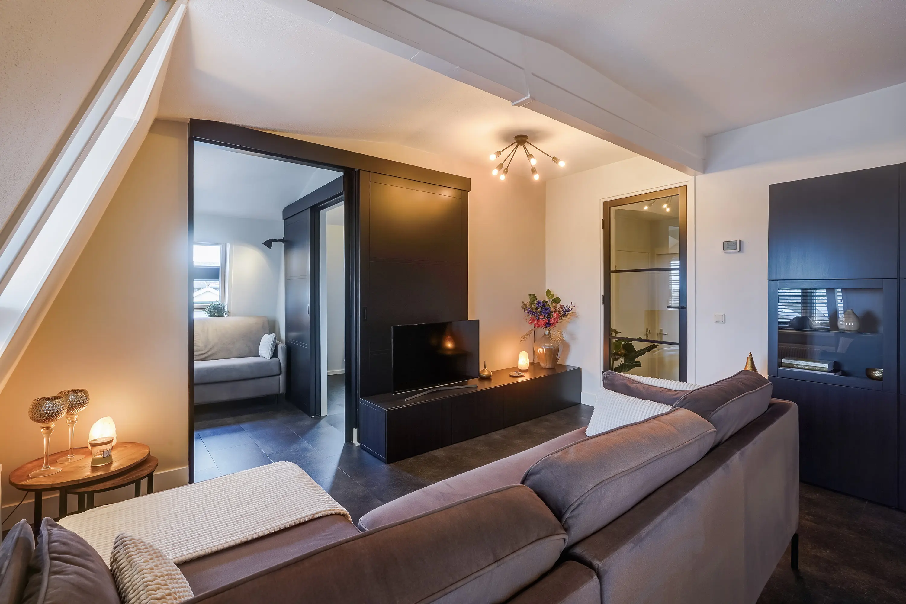 De sfeervolle woonkamer is slim ingedeeld en biedt volop mogelijkheden om het naar eigen wens in te richten en te gebruiken. In 2020 is een schuifwand geplaatst, zodat de woonkamer flexibel kan worden afgesloten van de extra kamer van circa 5 m². Perfect als werkkamer, hobbyruimte of logeerkamer. Deze kamer geeft bovendien toegang tot een luxe inloopkast.