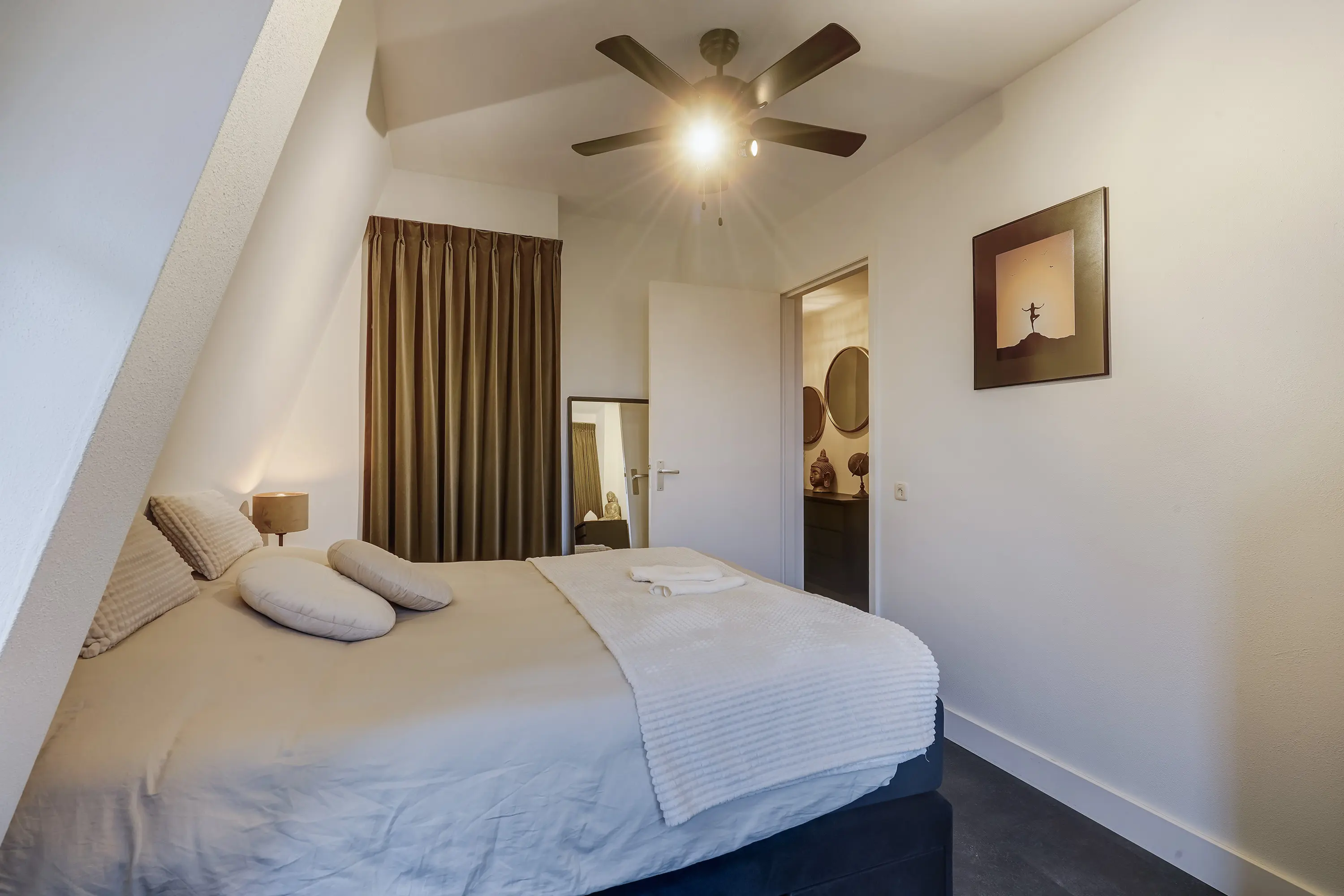 De royale hoofdslaapkamer van circa 13 m² beschikt over een praktische kast en openslaande deuren naar het ruime dakterras van circa 12 m². Hier kunt u heerlijk loungen, buiten eten of gewoon genieten van het vrije uitzicht.