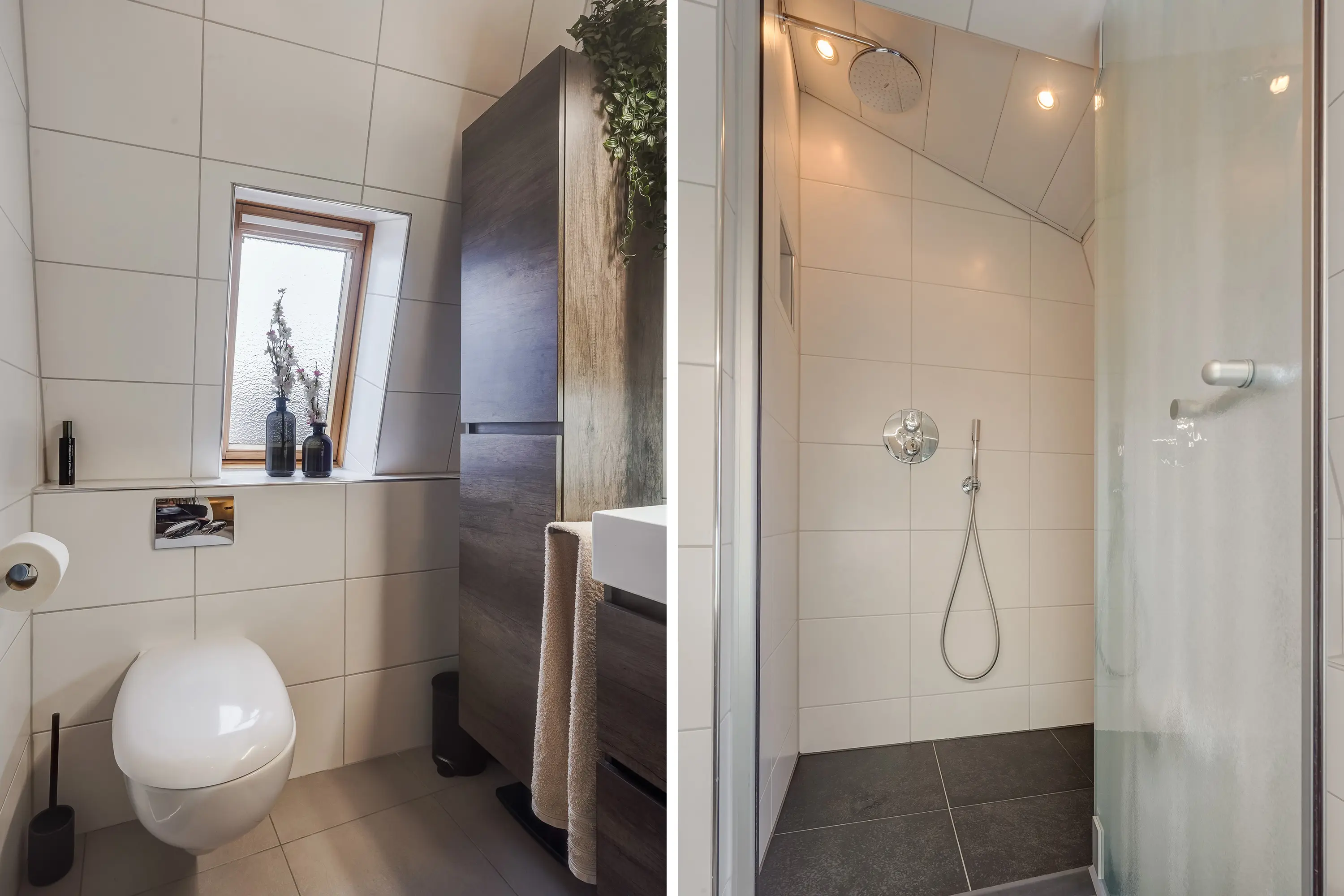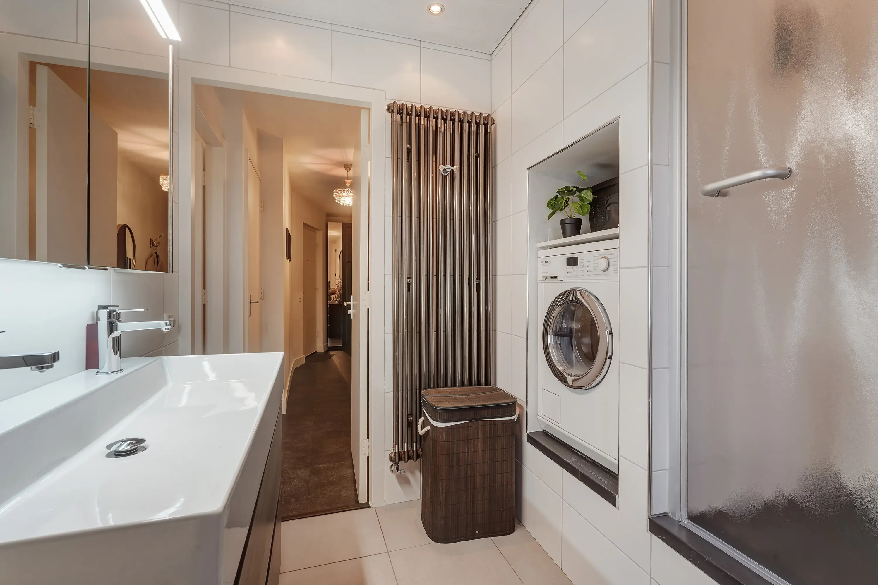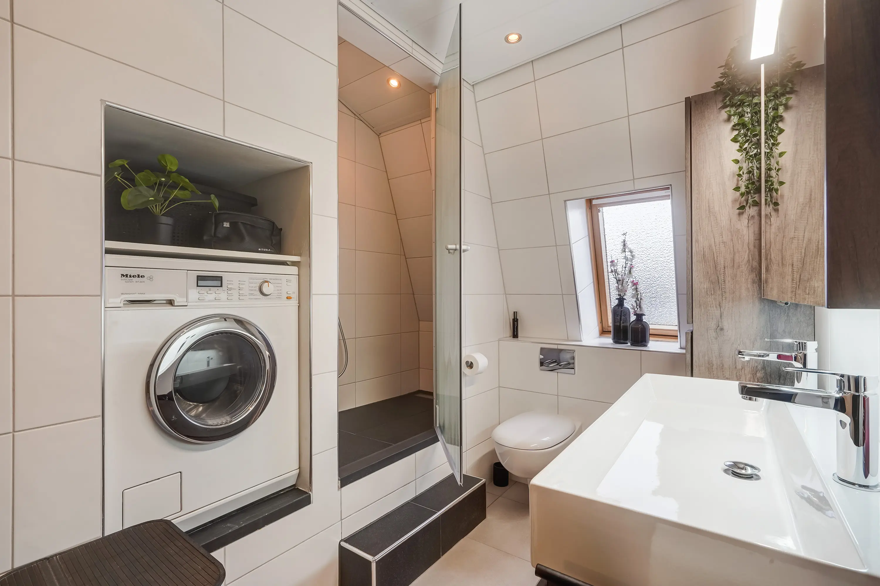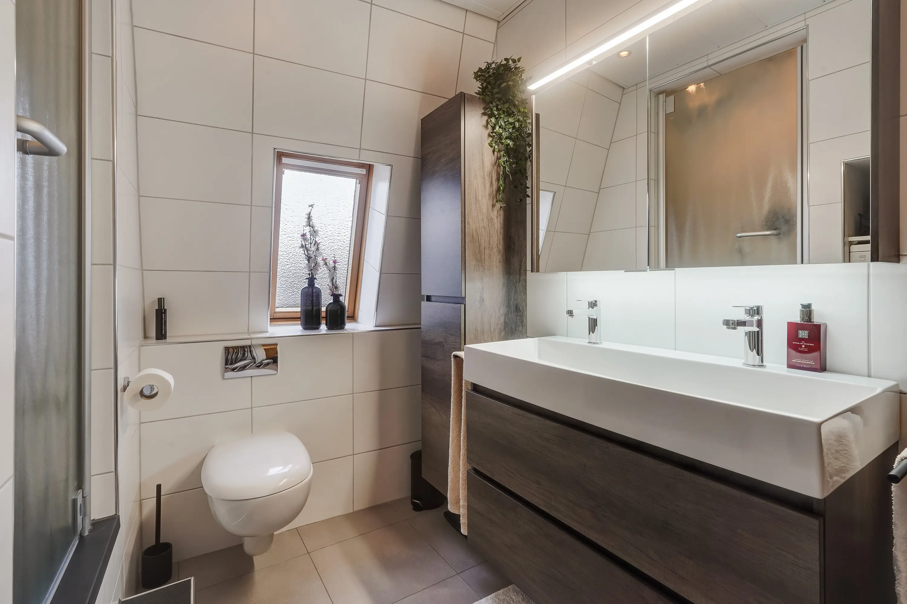 De badkamer, deels vernieuwd in 2020, is ruim en voorzien van een regendouche, wastafelmeubel, toilet en wasmachineaansluiting. De badkamer is wordt tevens mechanisch geventileerd.