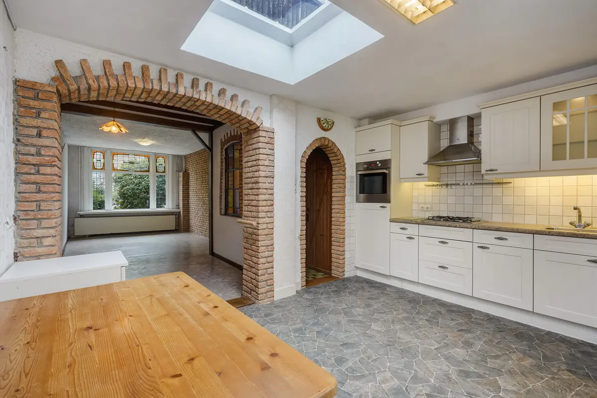De woning verwelkomt u met een zonnige voortuin en een fraaie gevel met karakteristieke erker. Binnen komt u via de hal met trapopgang en toiletruimte in de royale doorzonwoonkamer, die aan de achterzijde is uitgebouwd. De keuken, eveneens aan de achterzijde, is licht dankzij een dakkoepel en voorzien van alle basisapparatuur, waaronder een koelkast, oven, gaskookplaat en afzuigkap.