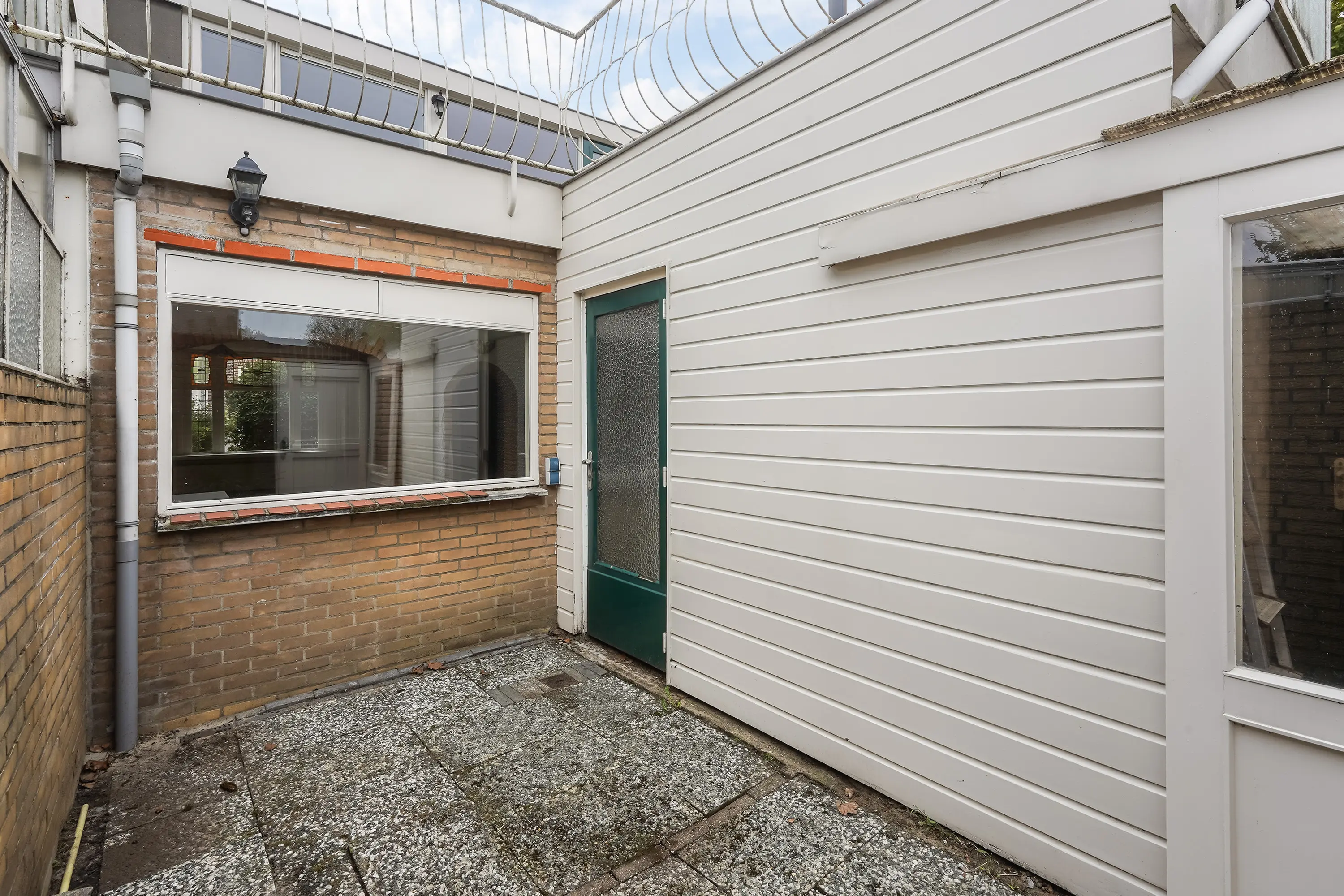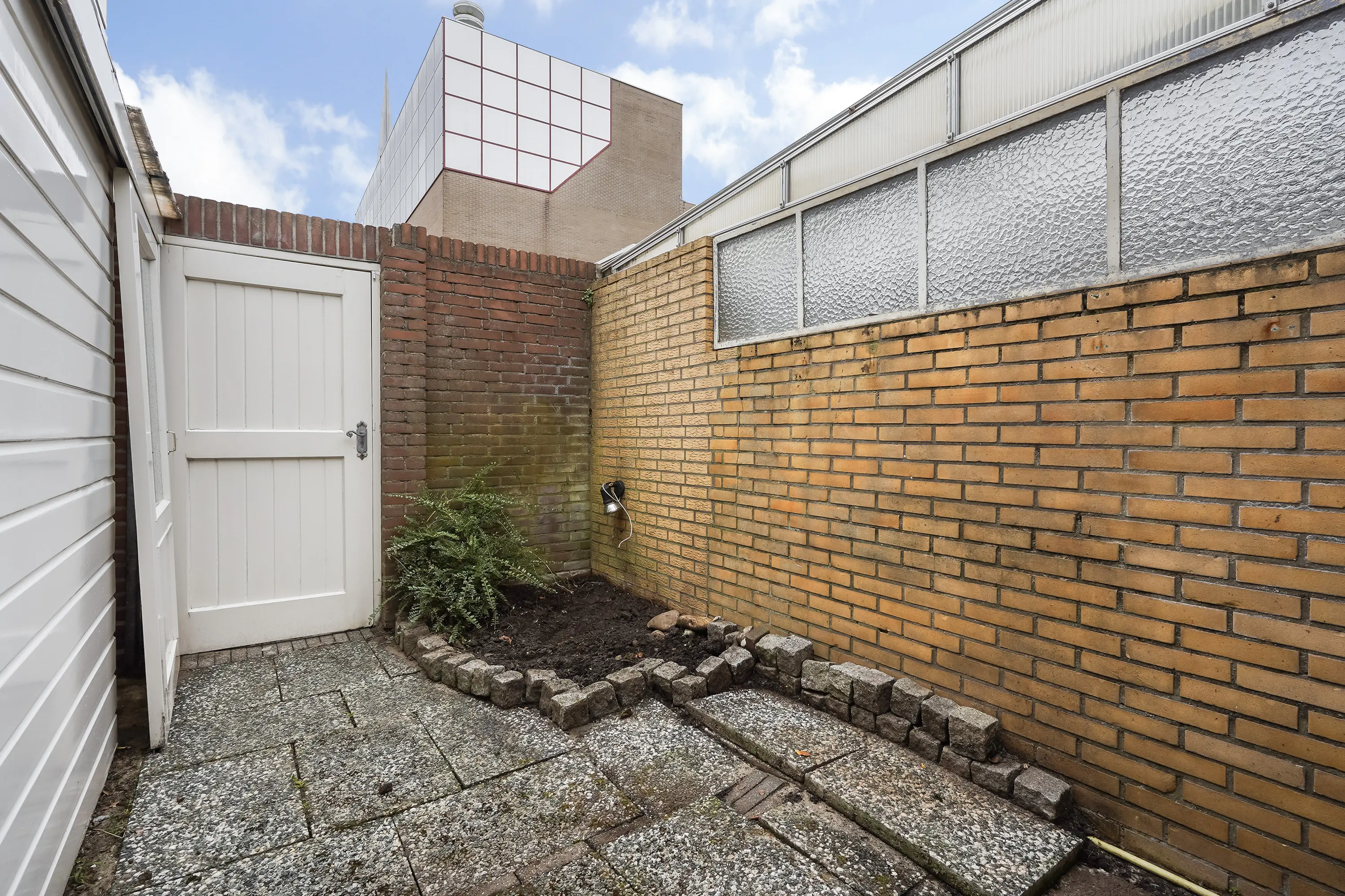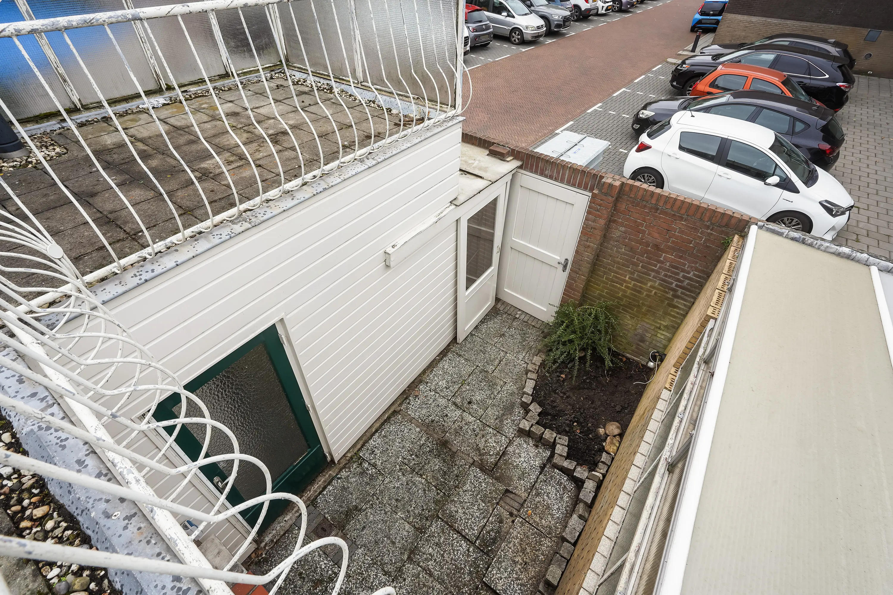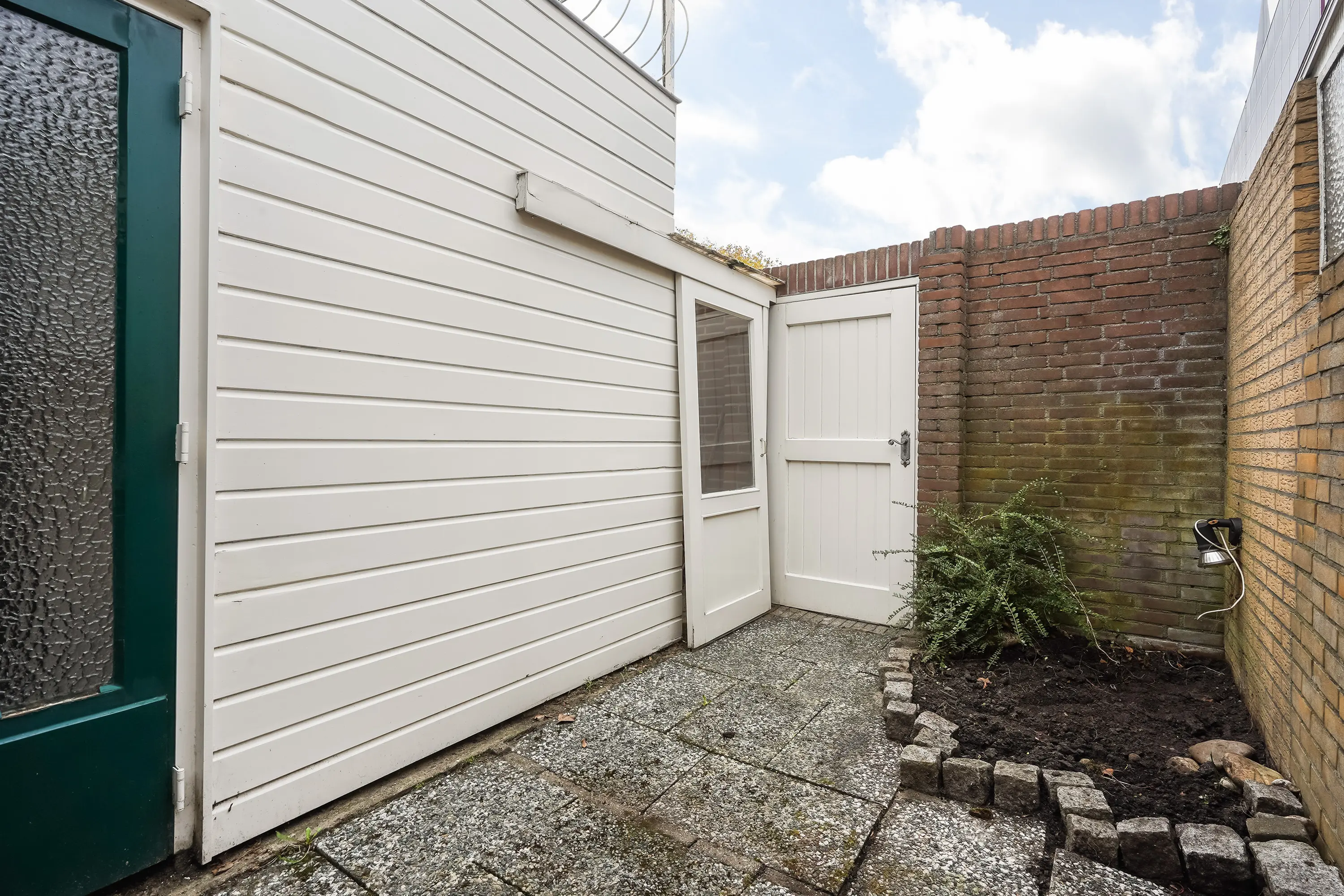 Achter de woning bevindt zich een zonnige achterplaats met achterom, toegankelijk via een afsluitbare poort naar de openbare parkeerplaats. Hier staat ook een handige berging met de opstelplaats voor de cv-combiketel (Remeha Avanta).