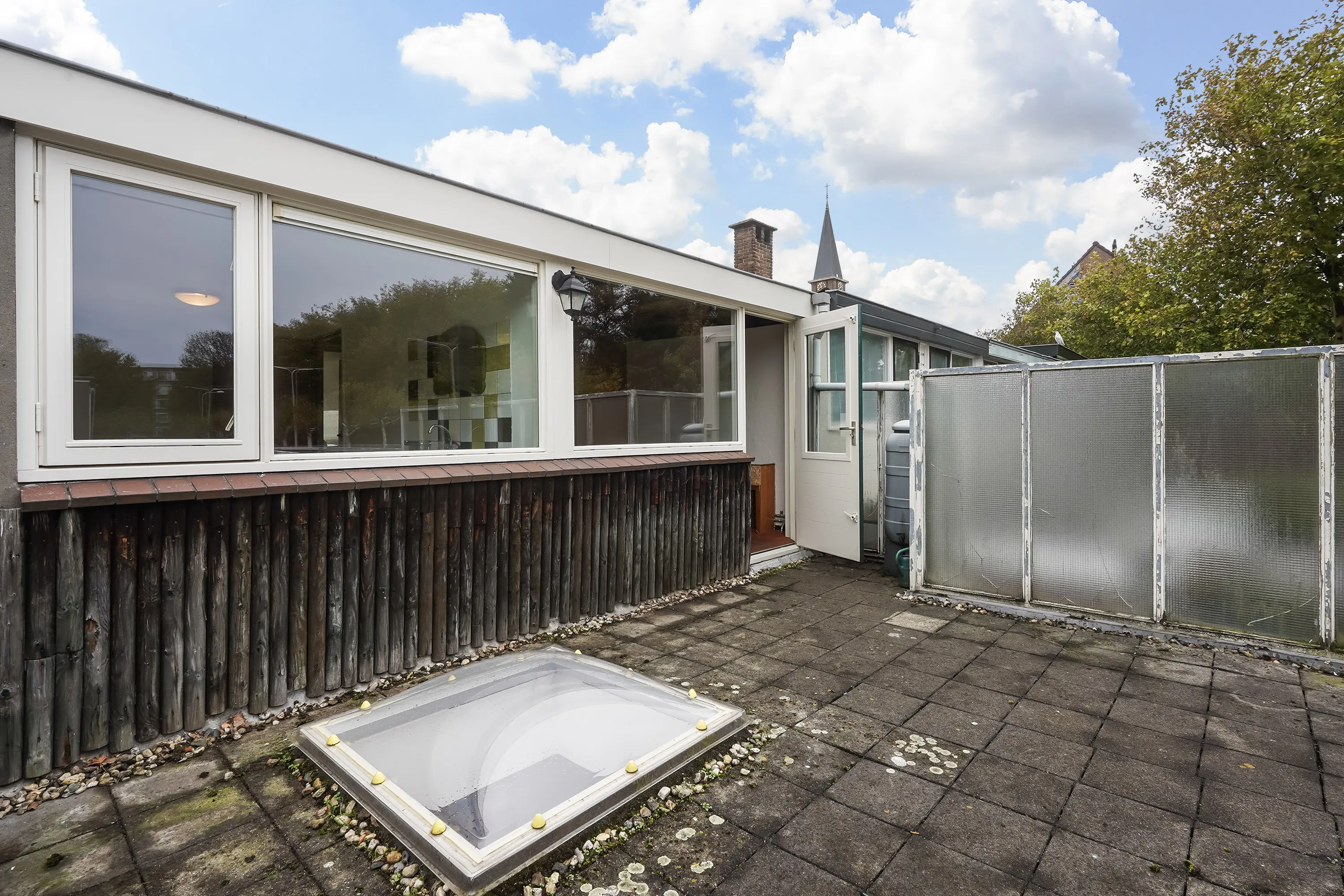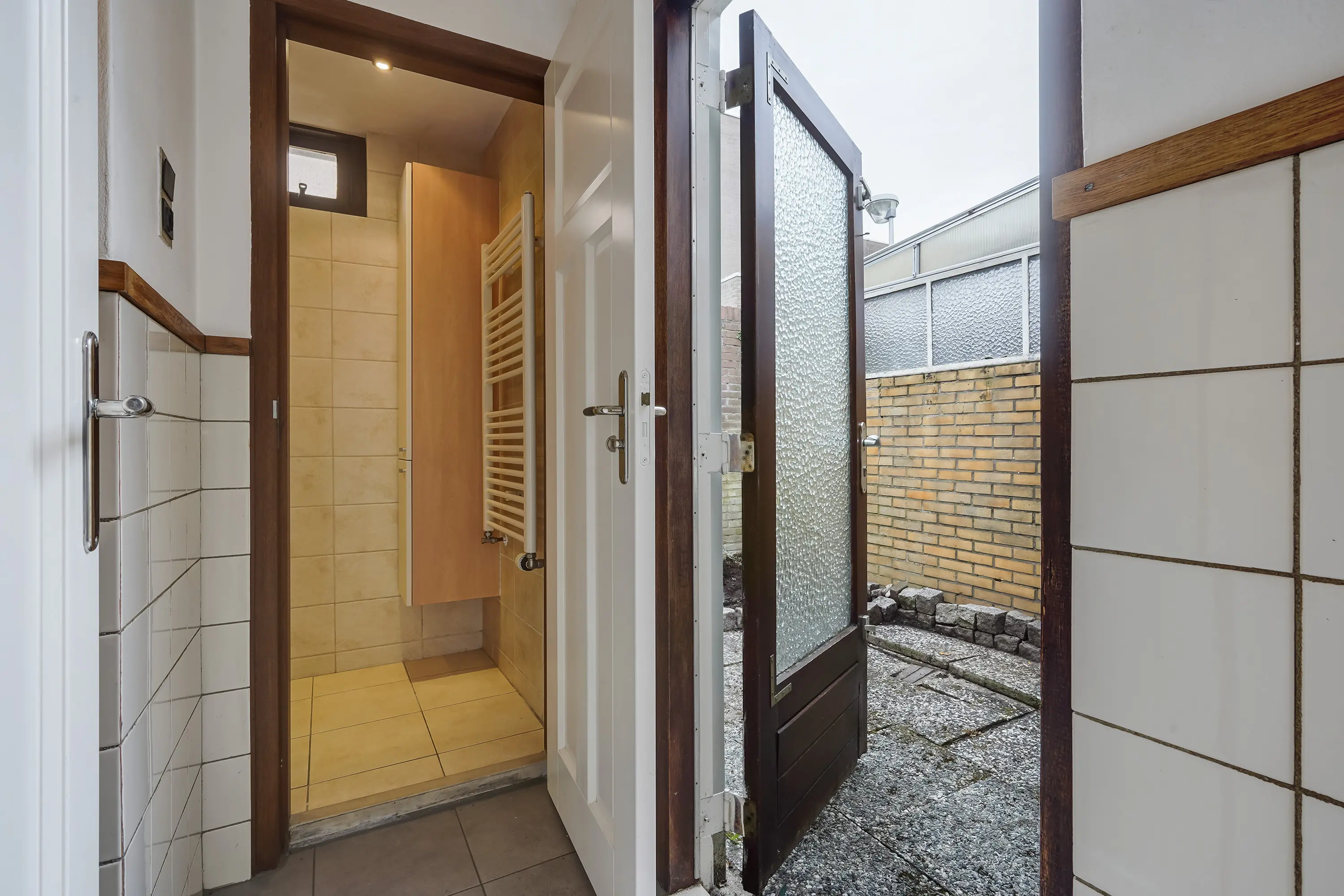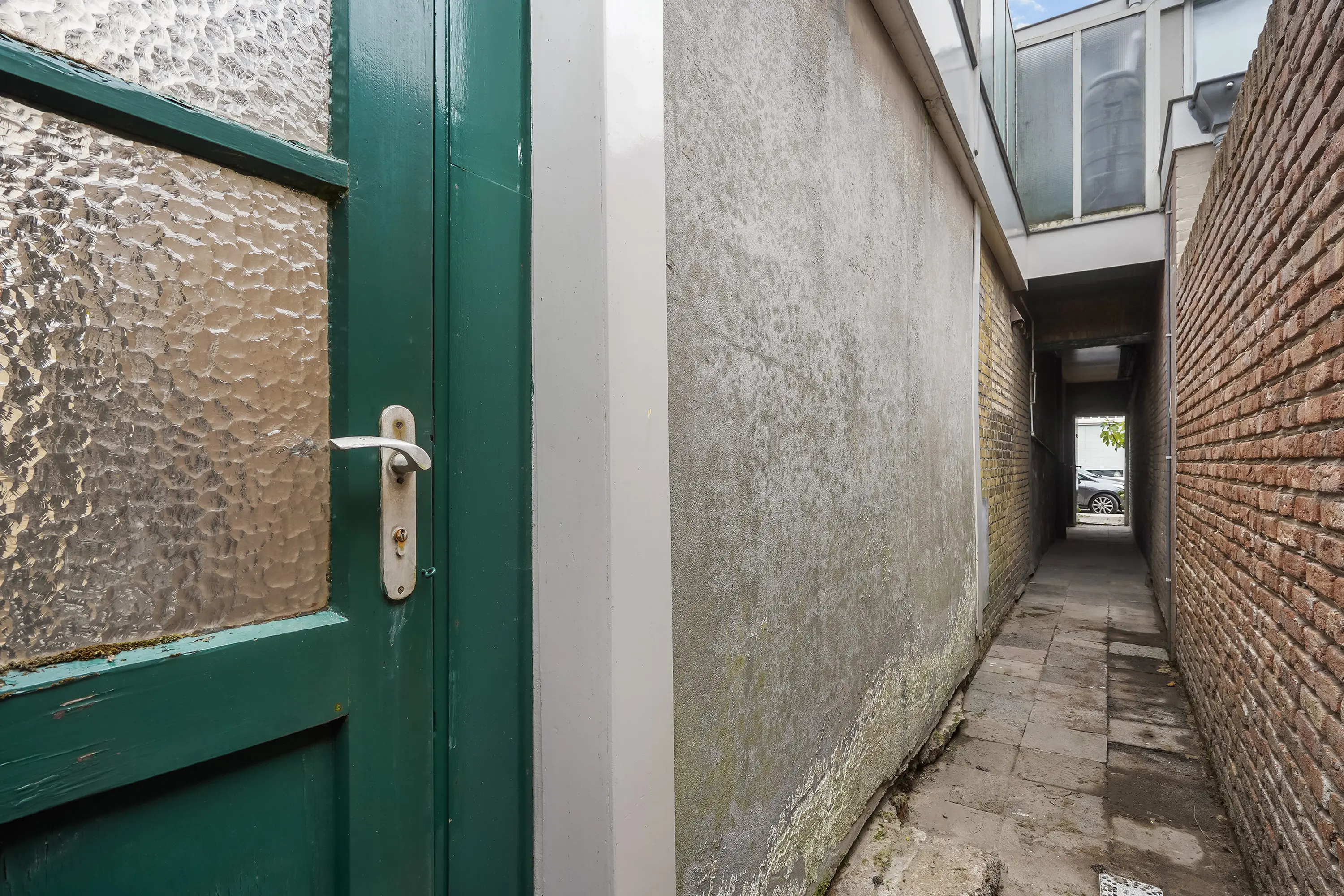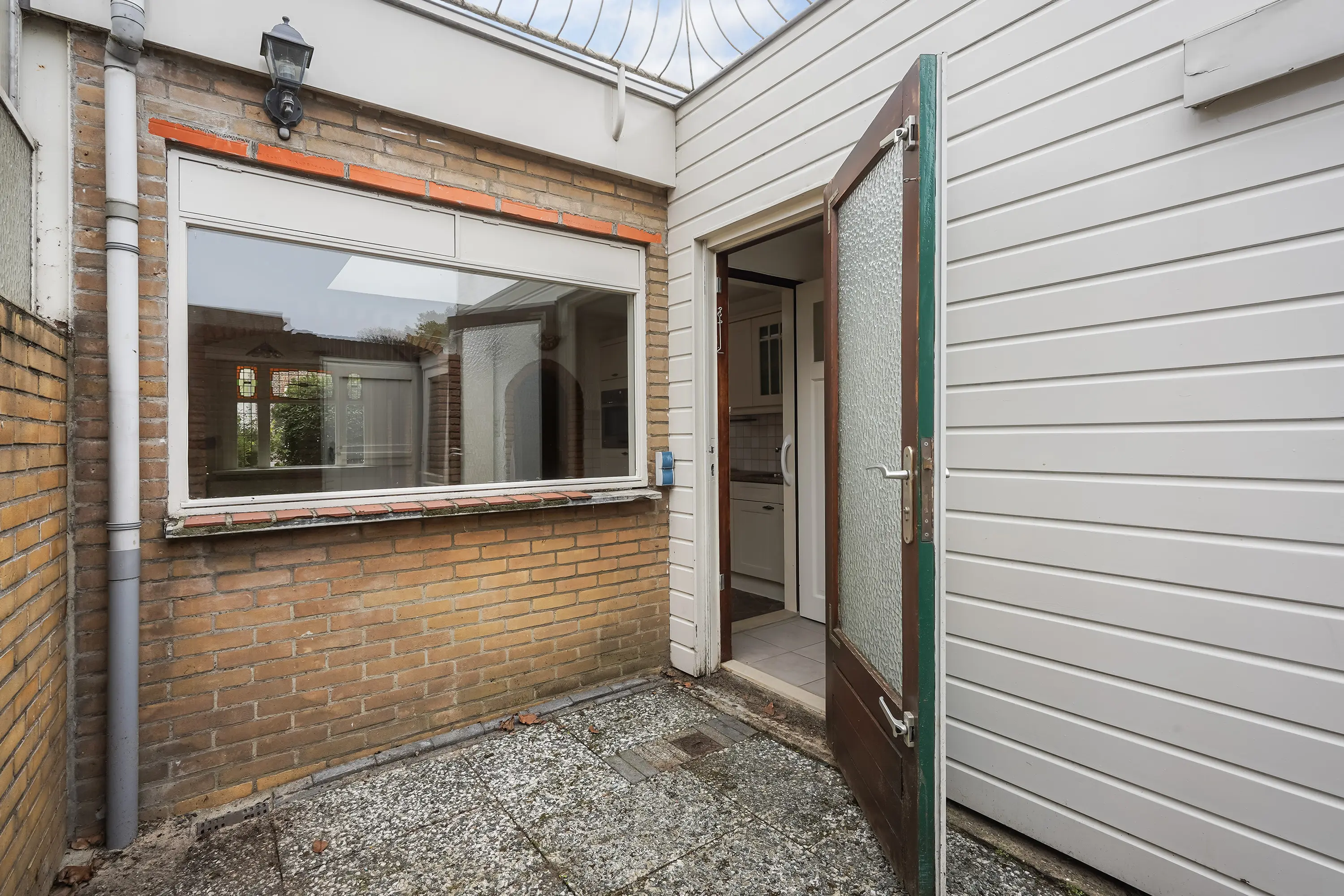 Achter de woning bevindt zich een zonnige achterplaats met achterom, toegankelijk via een afsluitbare poort naar de openbare parkeerplaats. Hier staat ook een handige berging met de opstelplaats voor de cv-combiketel (Remeha Avanta).