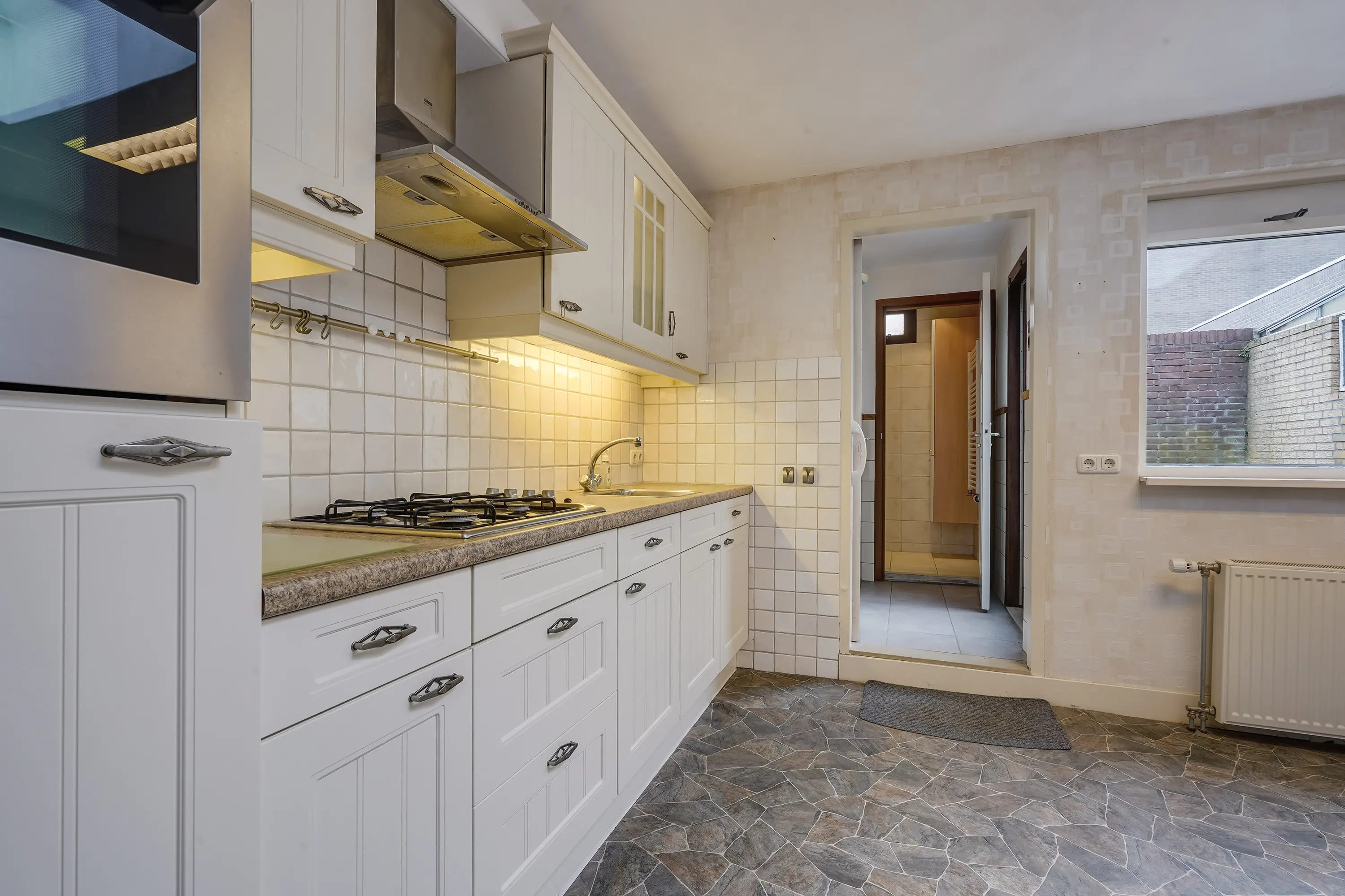 Direct naast de keuken ligt de praktische badkamer met inloopdouche, wastafelmeubel en designradiator.
