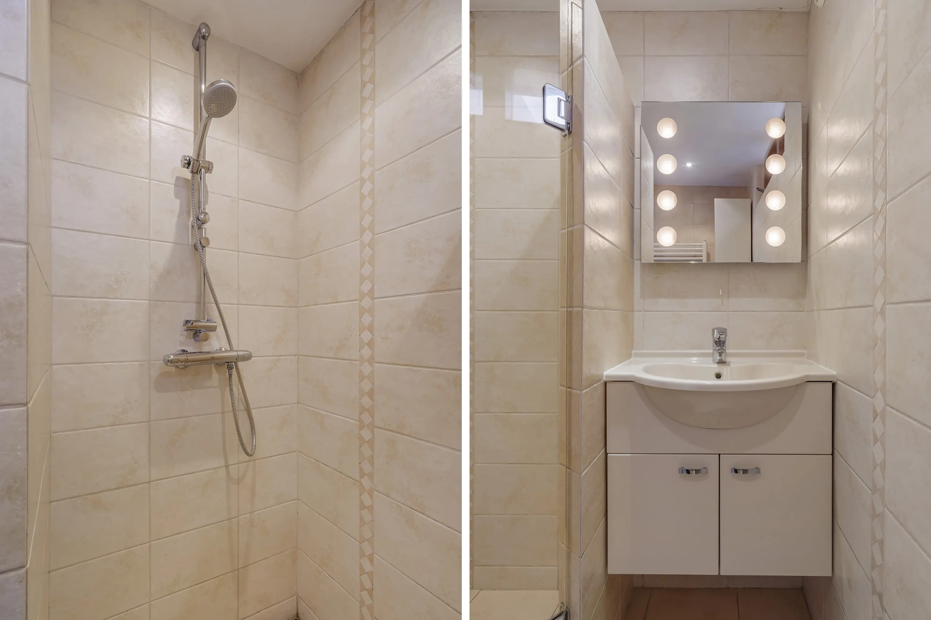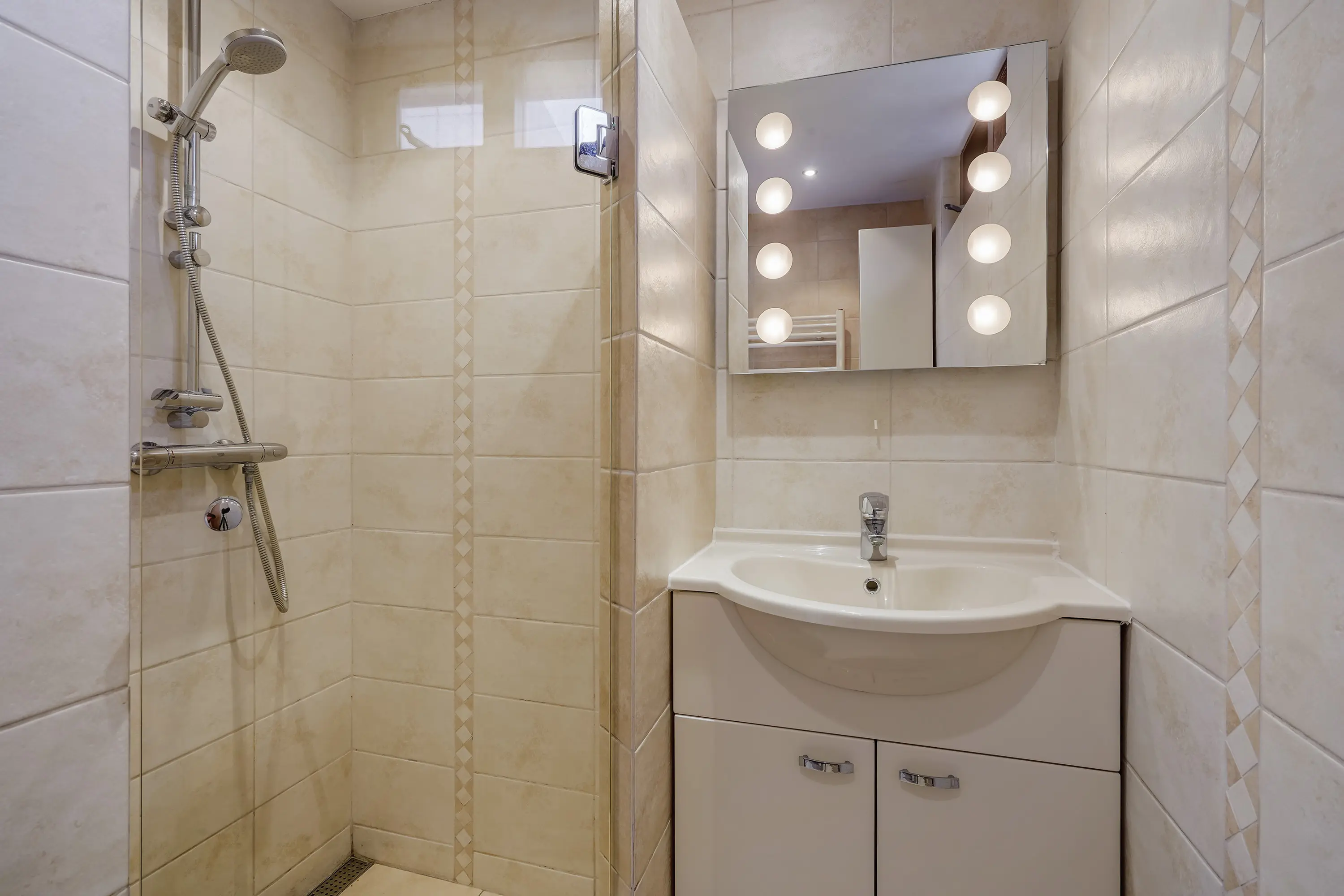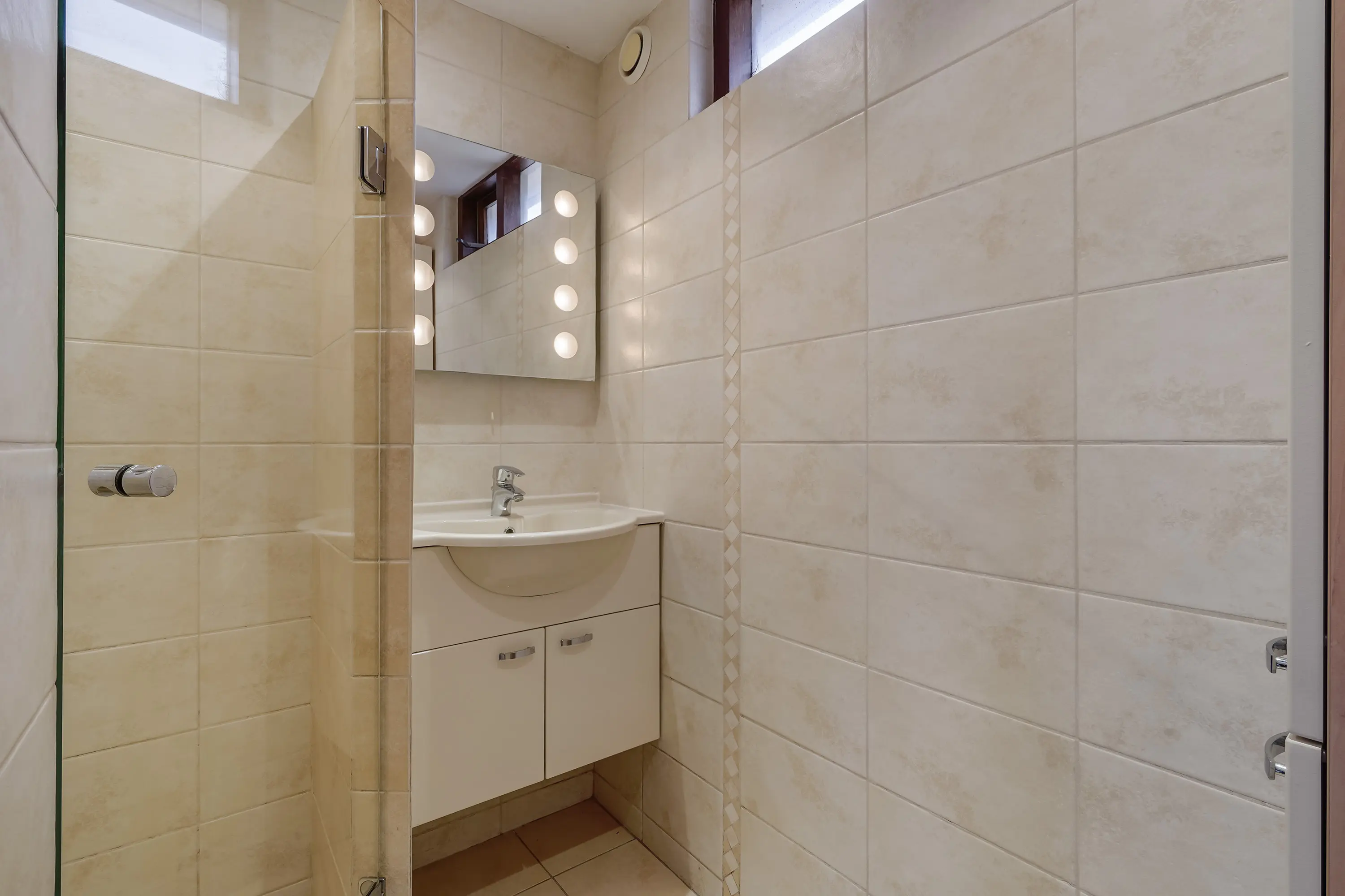 - Badkamer met inloopdouche, wastafelmeubel en designradiator;