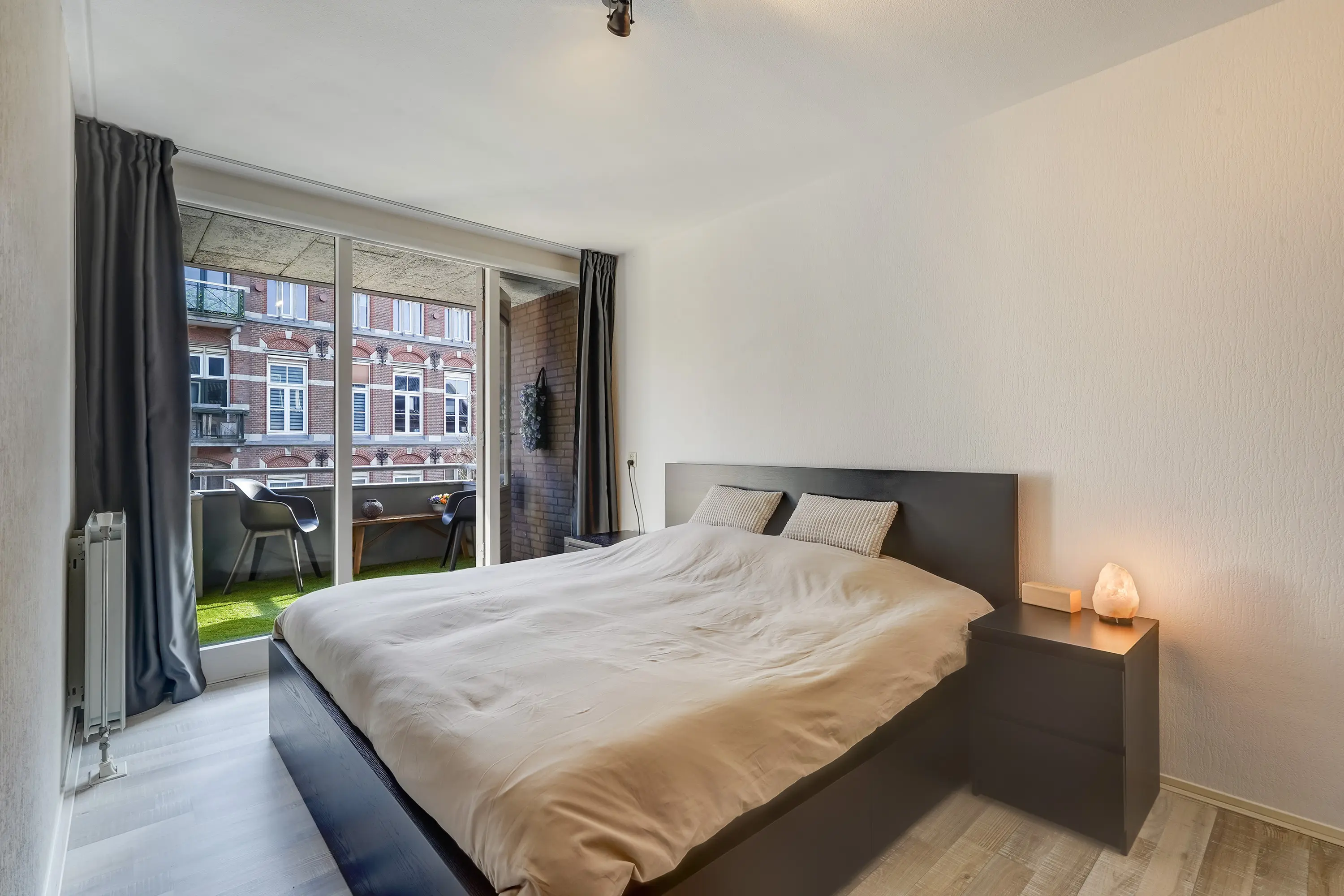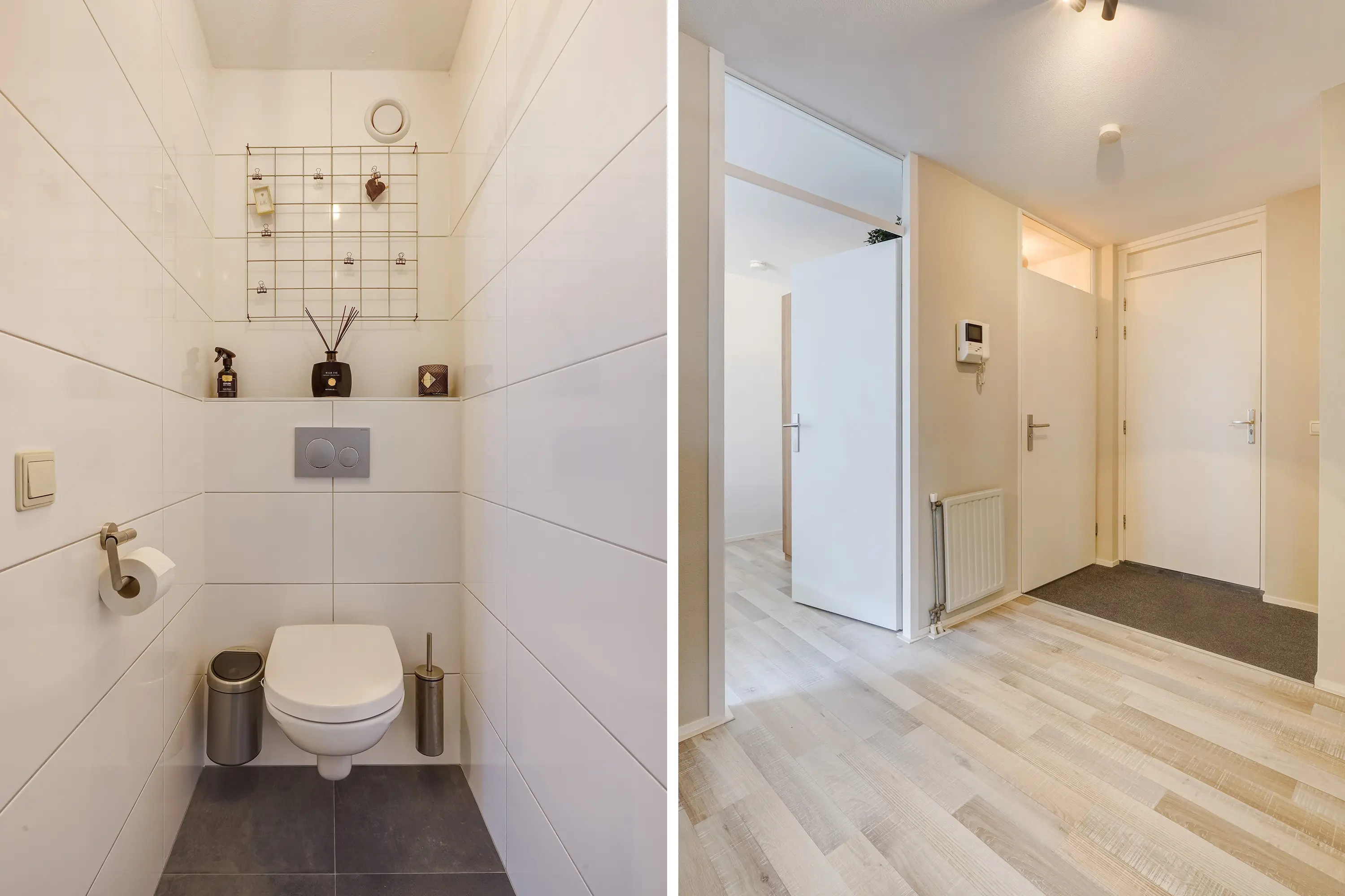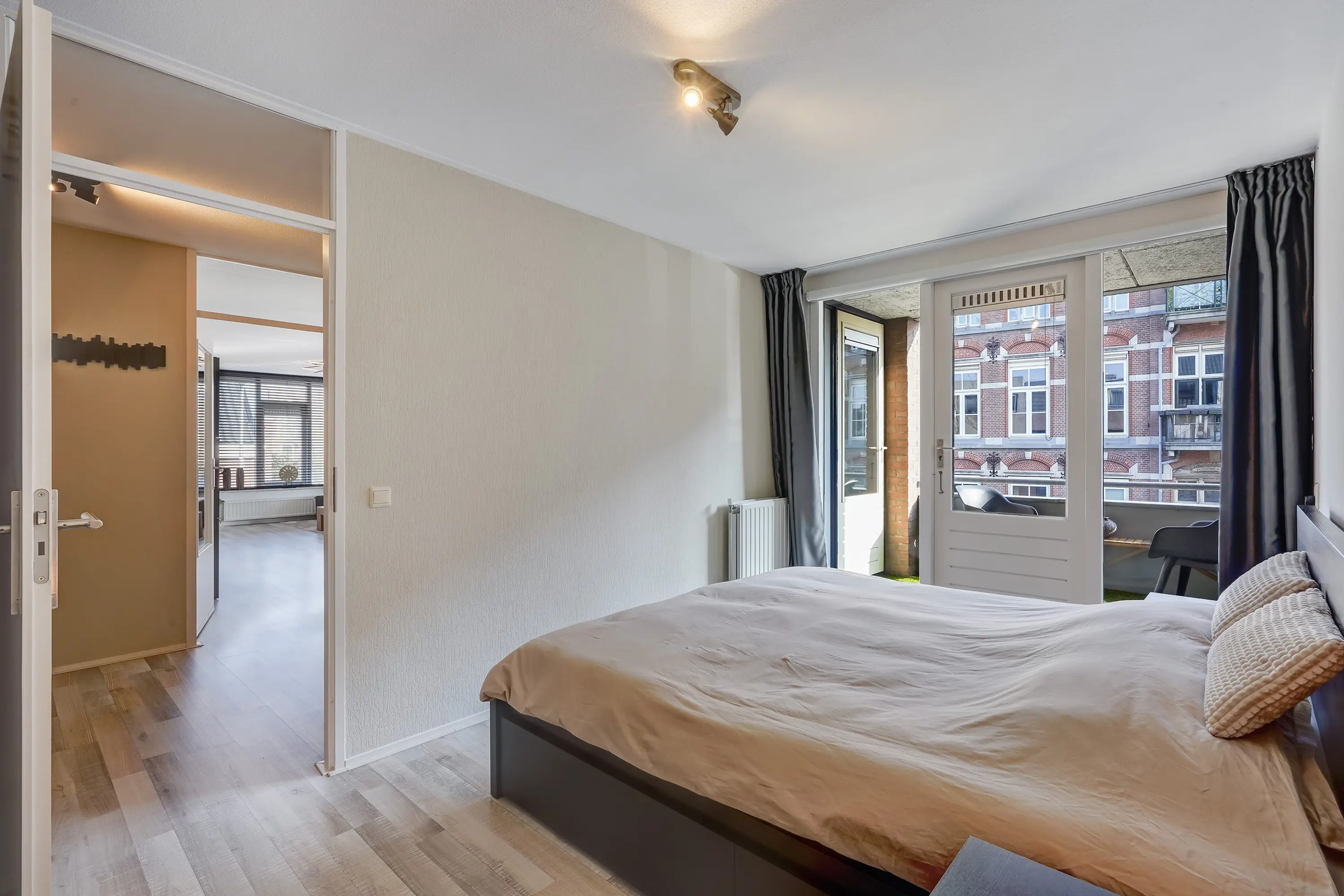 Aan de rechterzijde van de hal bevindt zich de separate toiletruimte en de hoofdslaapkamer. Deze kamer heeft een prettige lichtinval en biedt directe toegang tot het balkon, een fijne plek om even buiten te zitten of de dag rustig te beginnen.