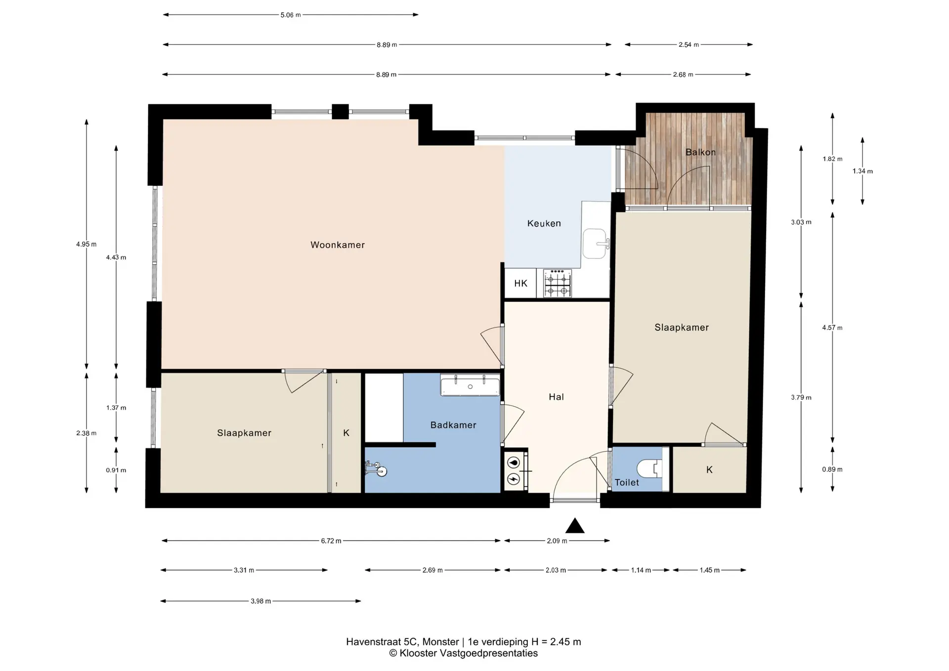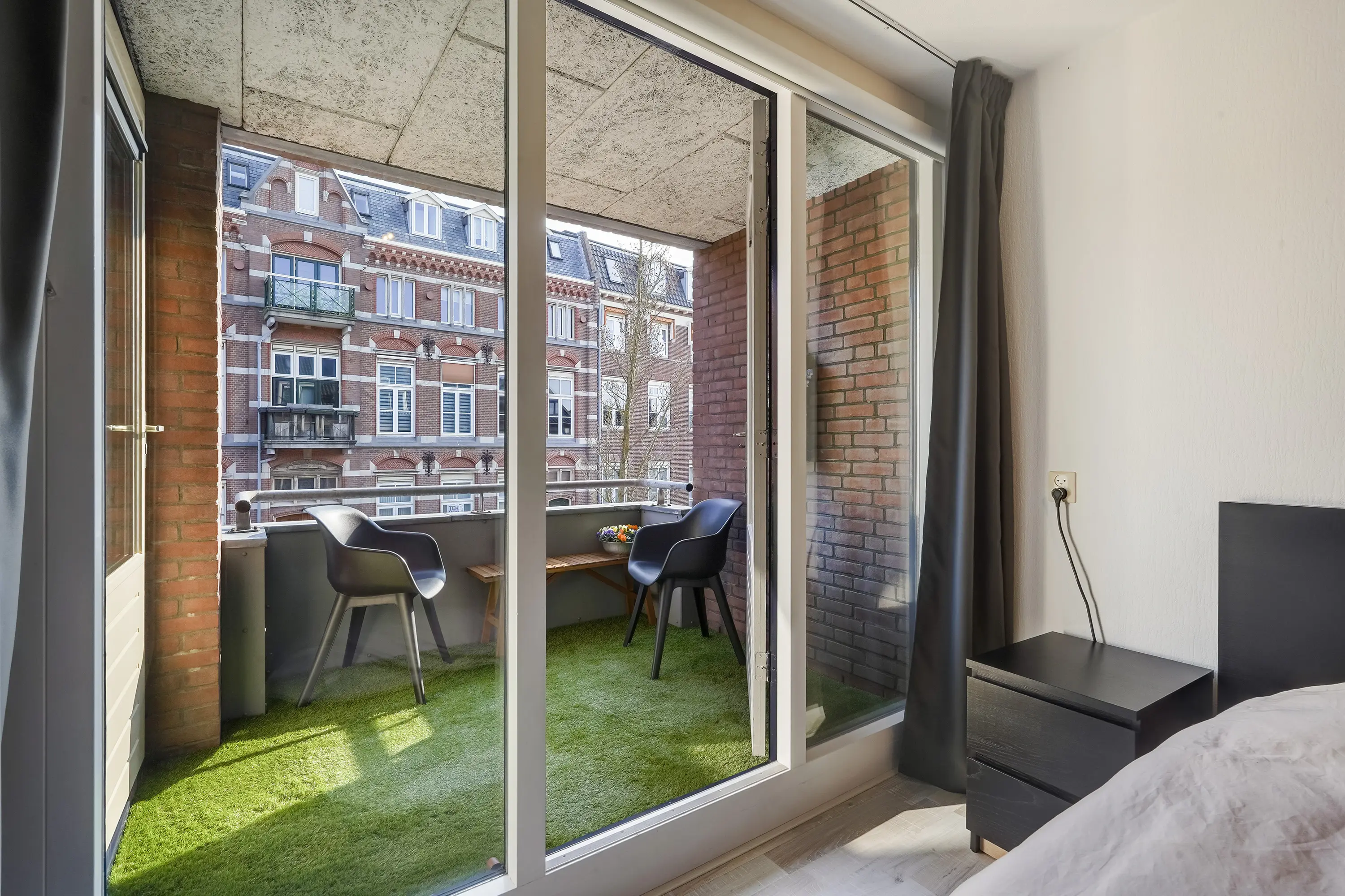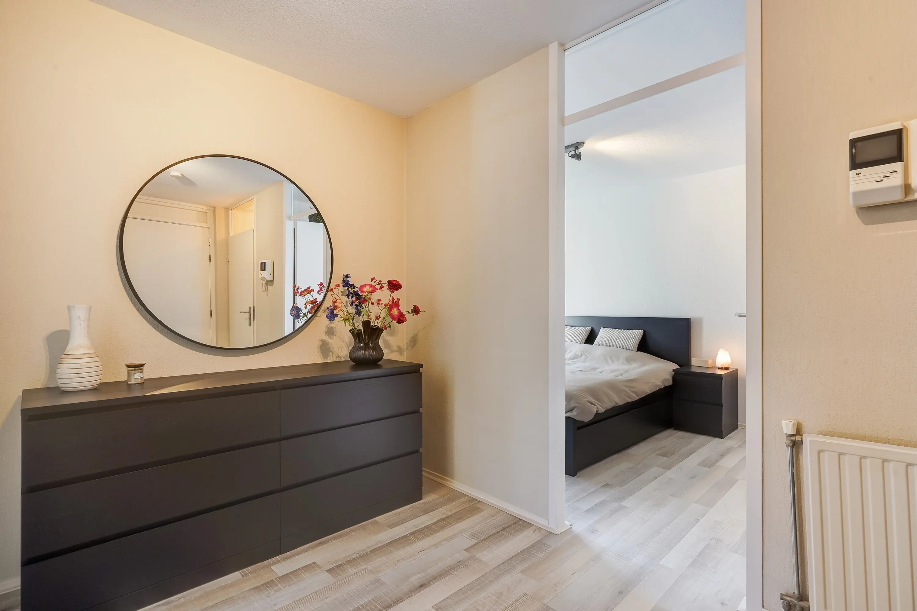 Aan de rechterzijde van de hal bevindt zich de separate toiletruimte en de hoofdslaapkamer. Deze kamer heeft een prettige lichtinval en biedt directe toegang tot het balkon, een fijne plek om even buiten te zitten of de dag rustig te beginnen.
