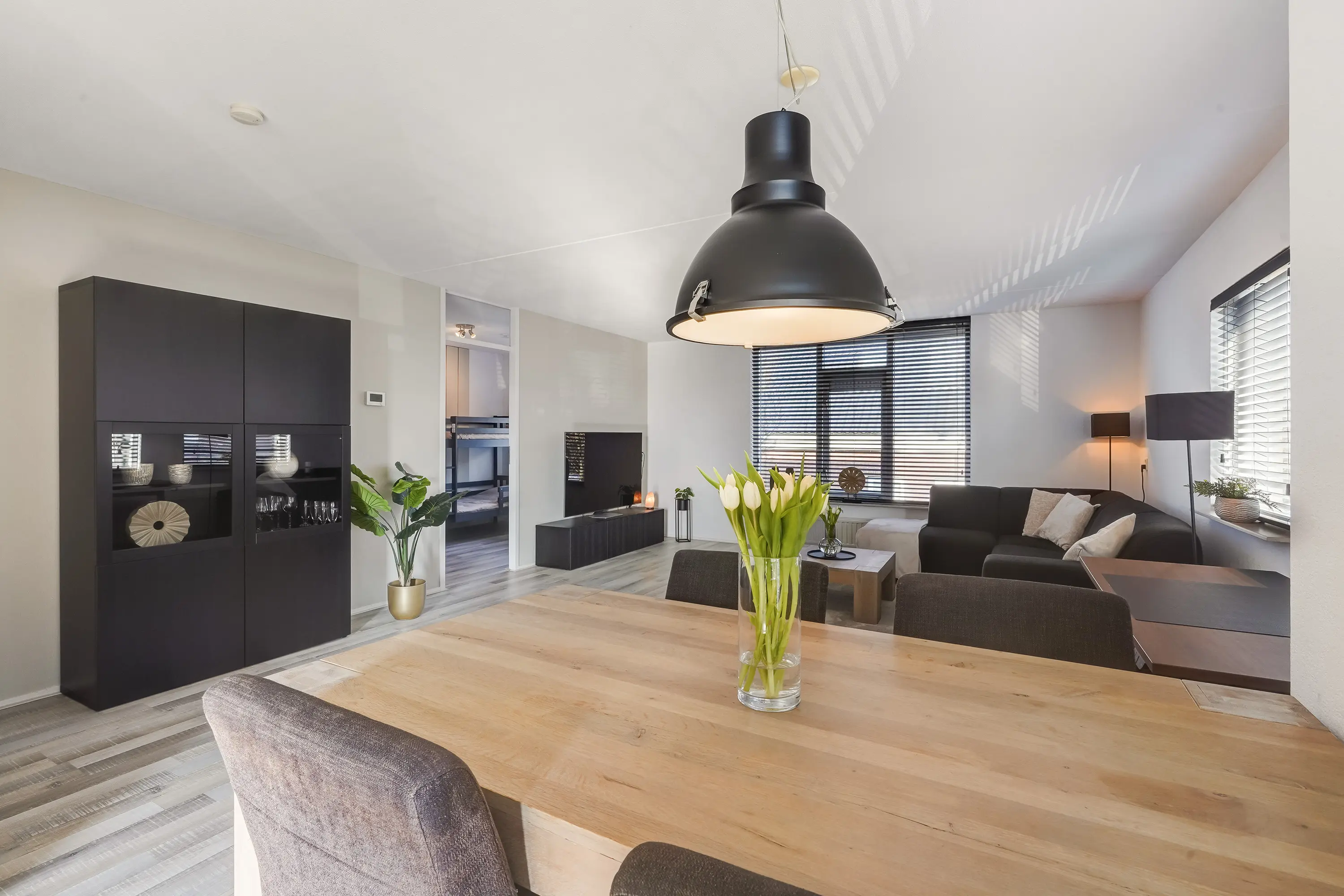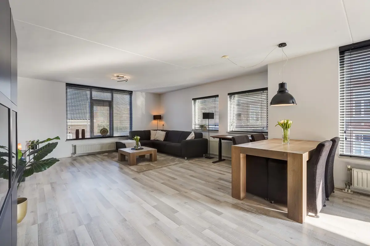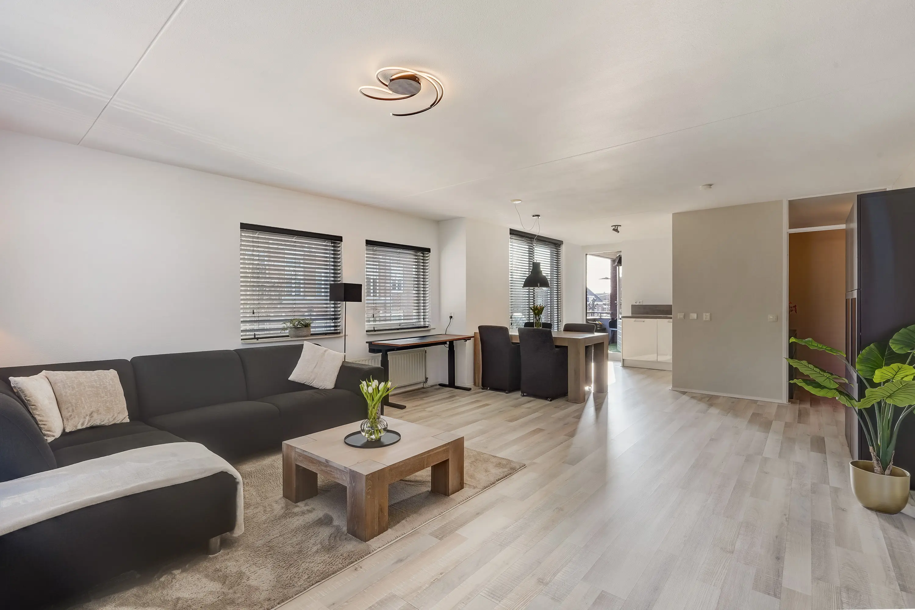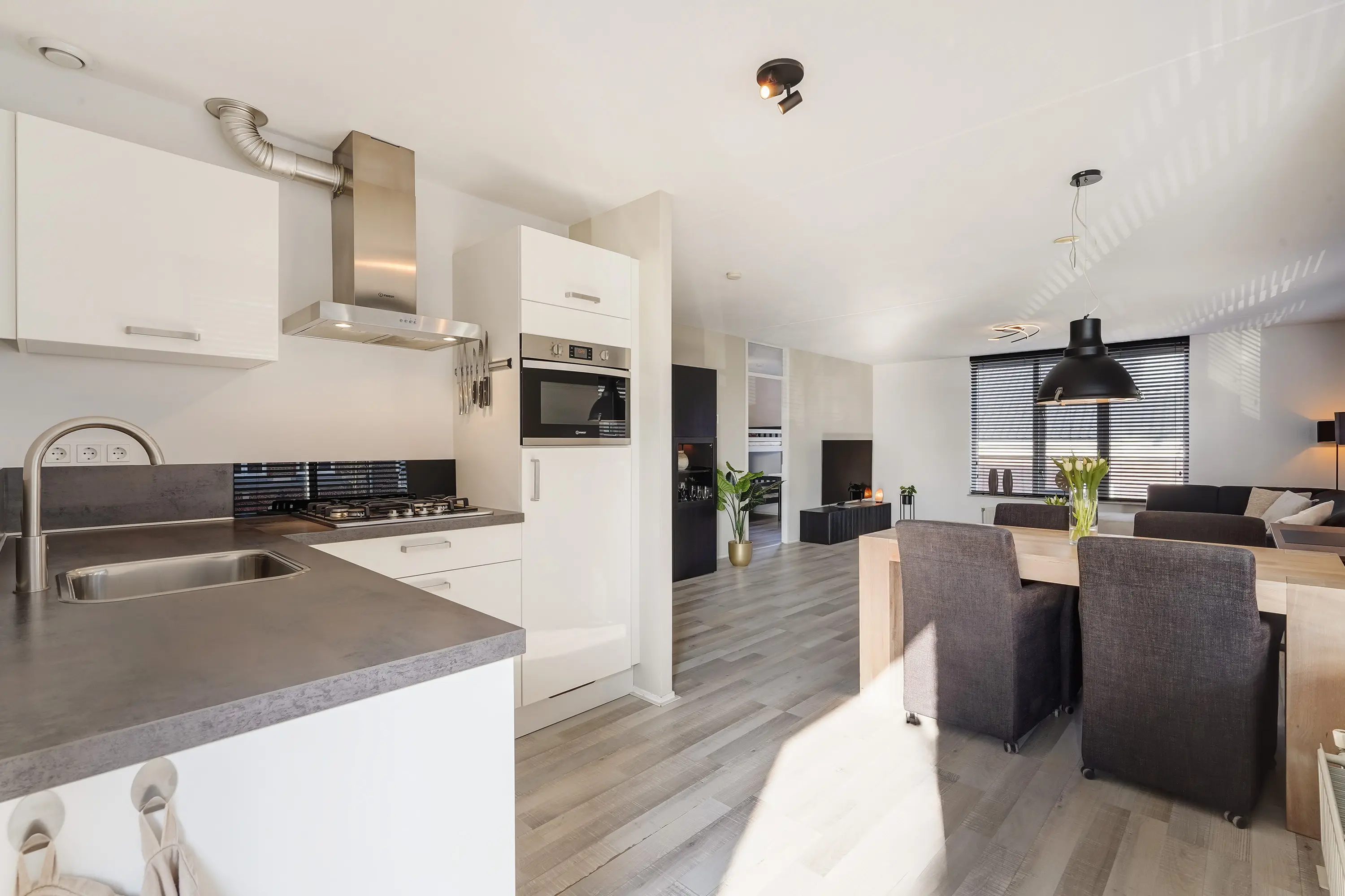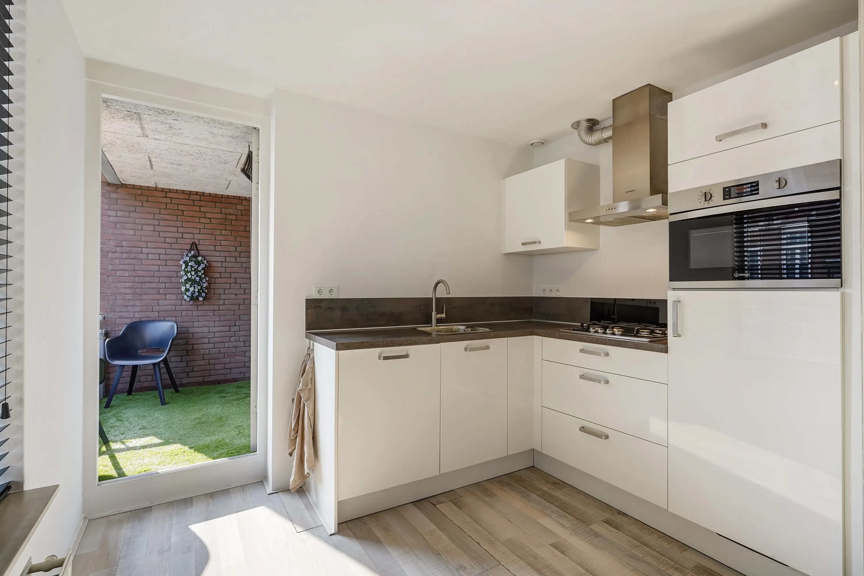 De woonkamer staat in open verbinding met de moderne keuken uit 2017. De keuken heeft een strakke en tijdloze uitstraling en is compleet uitgerust met diverse inbouwapparatuur, waaronder een vaatwasser, 4-pits gaskookplaat, combi-oven en een koel-vriescombinatie. Ook vanuit de woonkamer is het balkon bereikbaar, waardoor binnen en buiten mooi met elkaar verbonden zijn.
