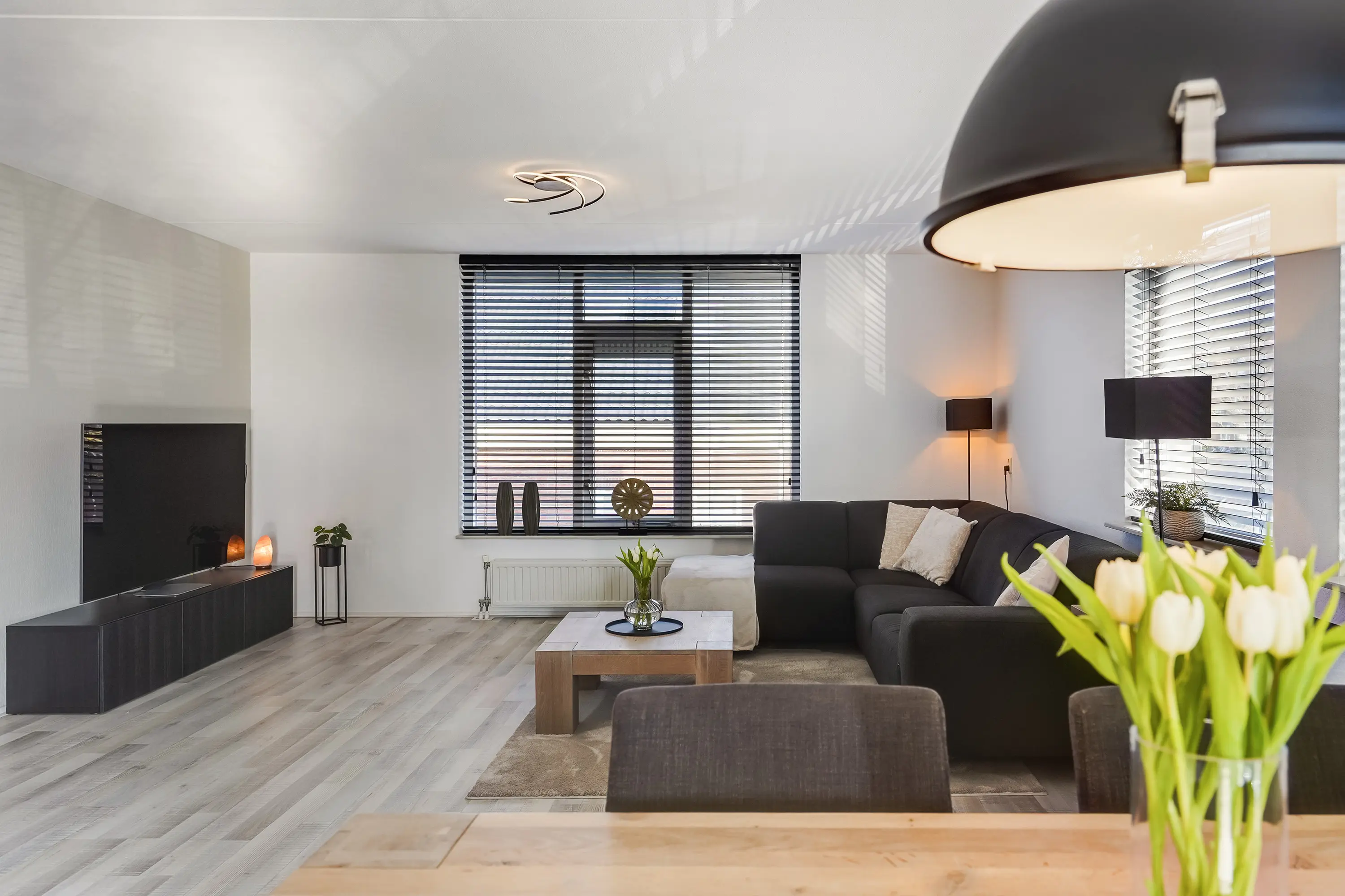 Aan de linkerzijde komt u in de woonkamer. Deze ruimte verrast direct door de royale opzet en de prettige lichtinval.