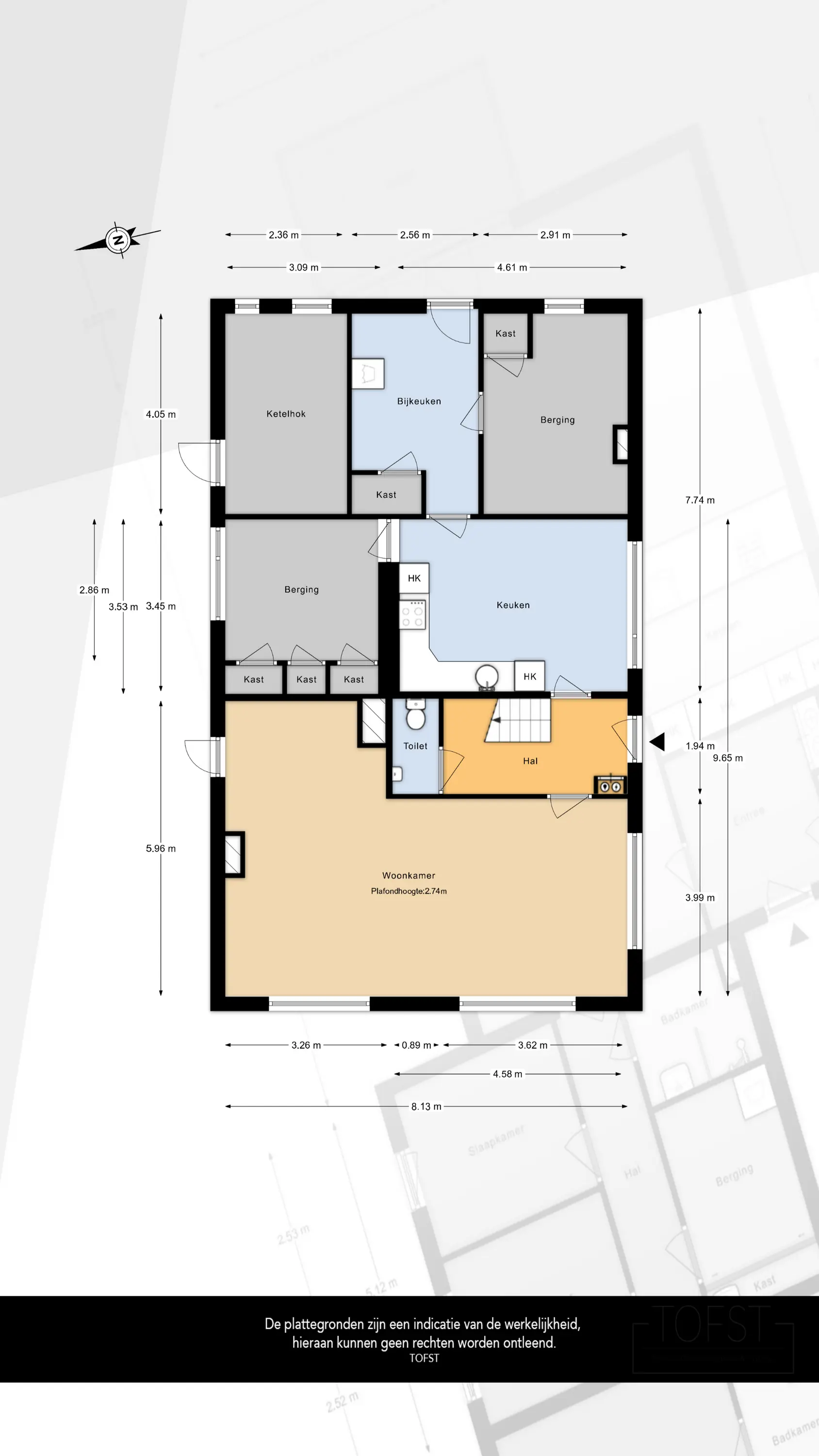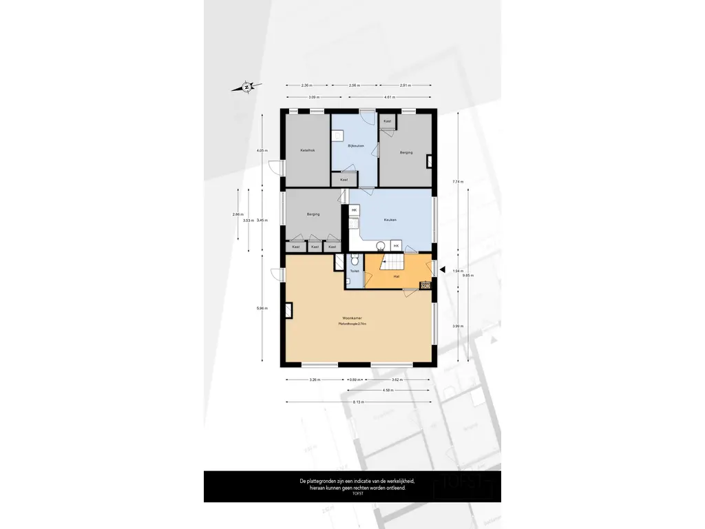 De begane grond van de huidige woning heeft een functionele, traditionele indeling. Aan de voorzijde bevindt zich de entree met hal, trapopgang en toilet. Vanuit de hal is er toegang tot de lichte woonkamer, gelegen aan de voorzijde. Verder beschikt de begane grond over een gesloten keuken en diverse aangrenzende ruimtes, waaronder een berging en bijkeuken. De leefruimten bieden een goed beeld van de huidige footprint van de woning.
