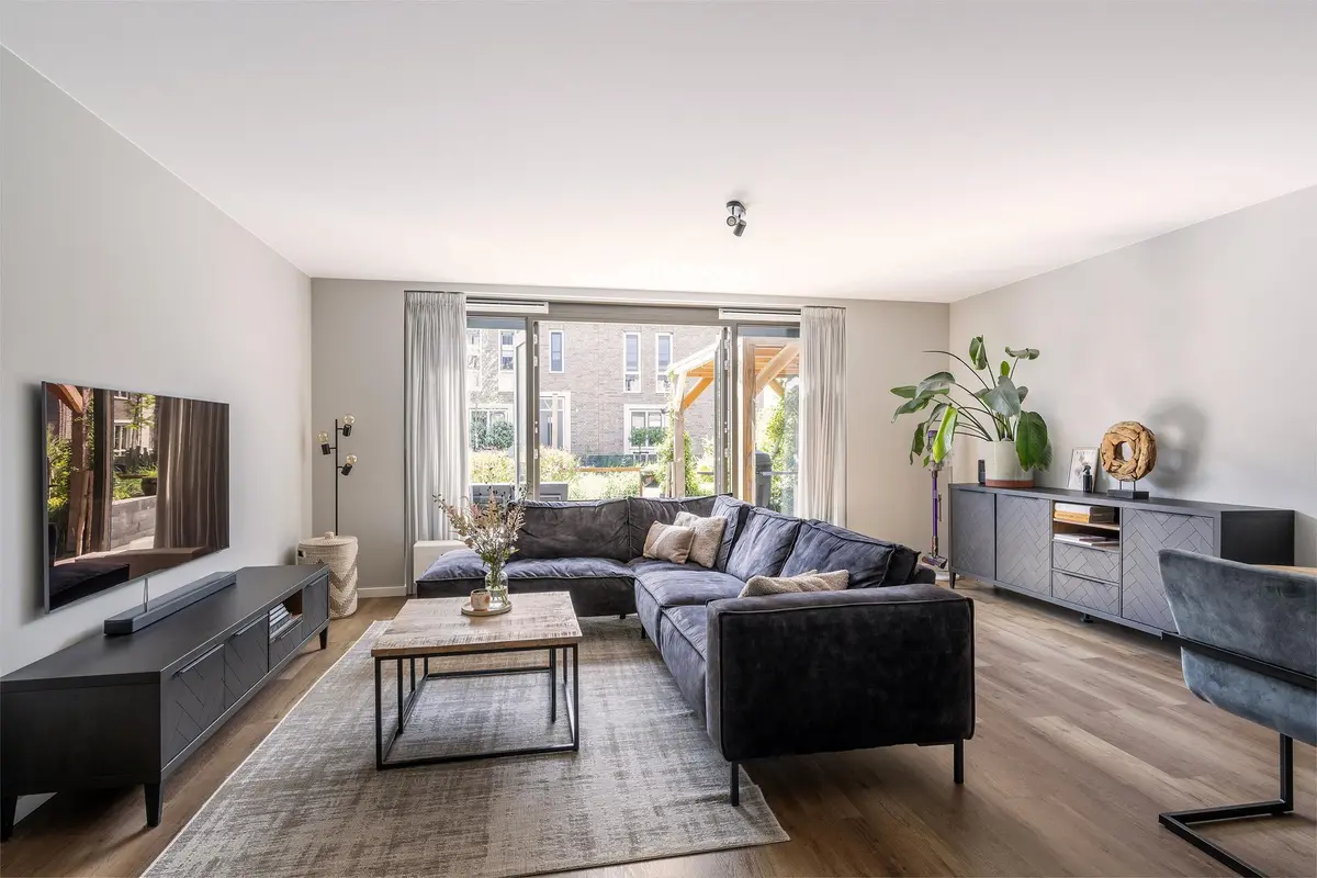 De woonkamer is tuingericht en biedt veel lichtinval via openslaande deuren naar de achtertuin. De afwerking is verzorgd, pvc-vloer in houtlook, glad gestuukt plafond en neutrale wandafwerking. De zonnige achtertuin is onderhoudsarm aangelegd, grotendeels bestraat en gelegen op het zuiden. Aan de achtergevel is een houten overkapping geplaatst.
