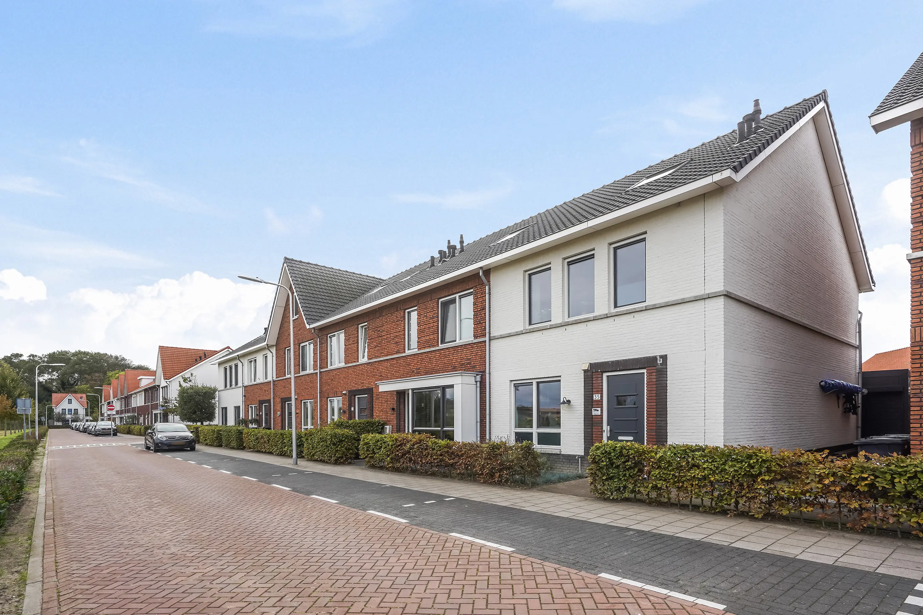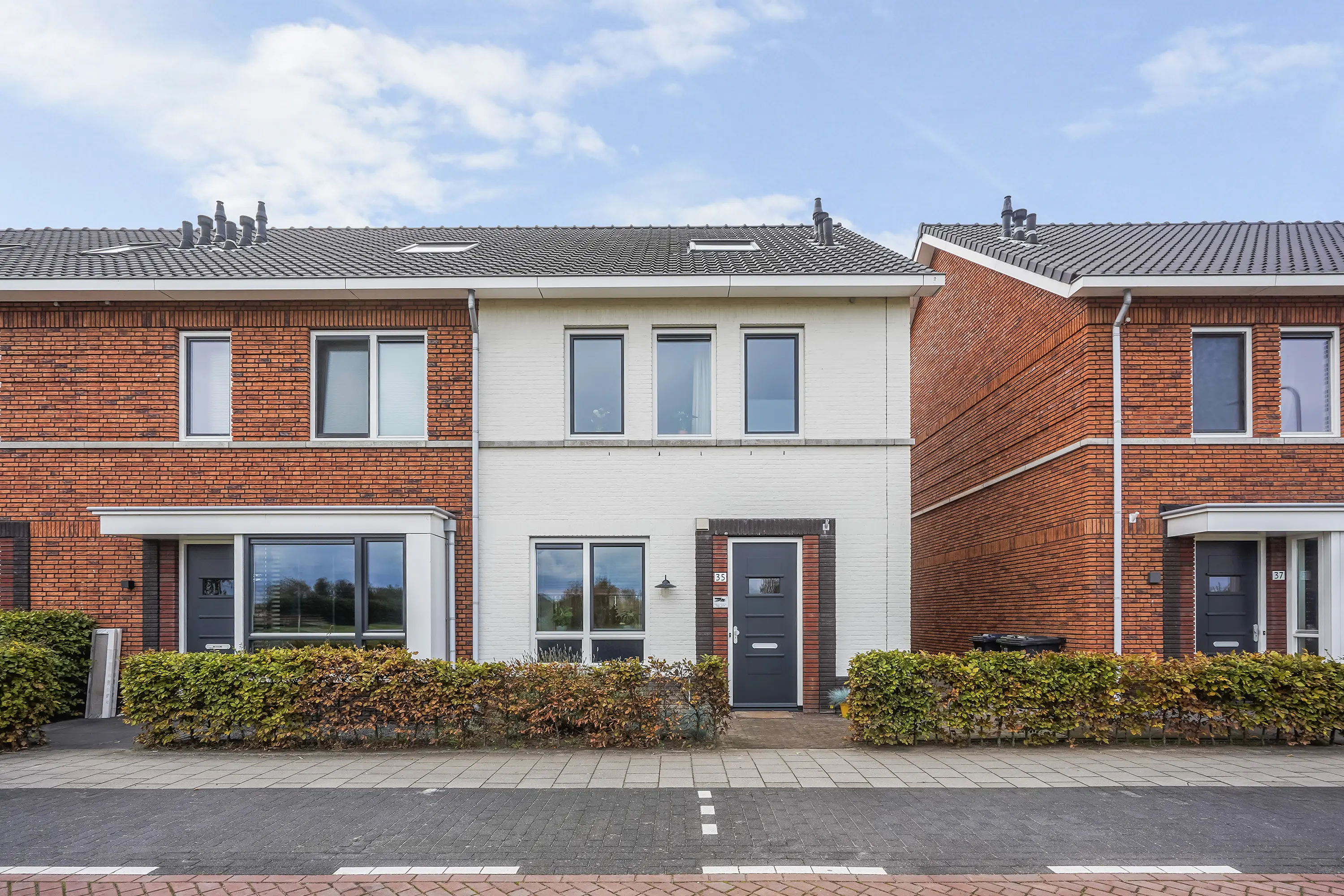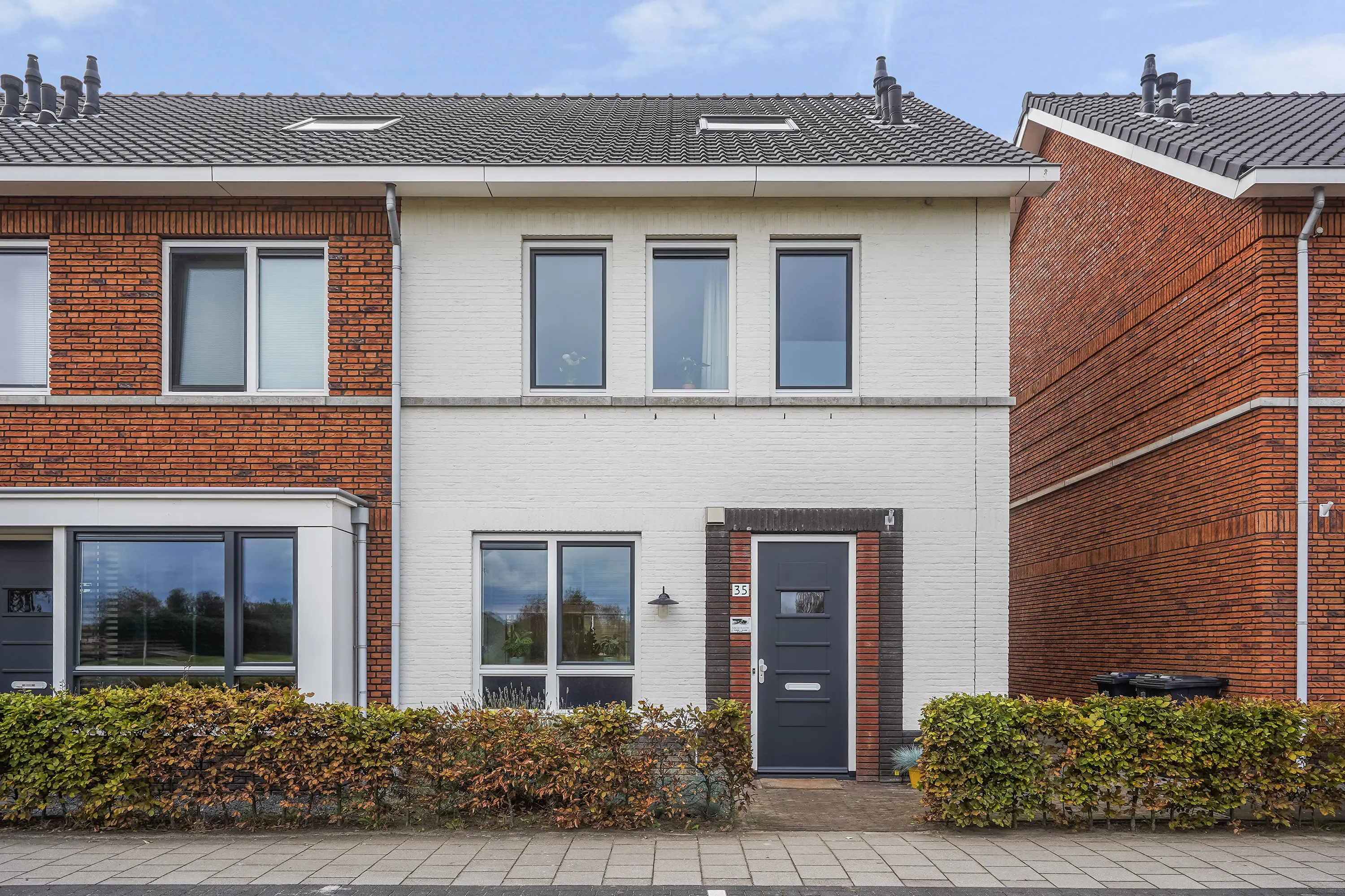 De verzorgde voortuin met lage heg en buitenkraan geeft direct een uitnodigende indruk. De witte gevel springt in het oog en benadrukt het moderne karakter van de woning. Aan de zijkant is een betegeld pad met toegang tot de achterom.