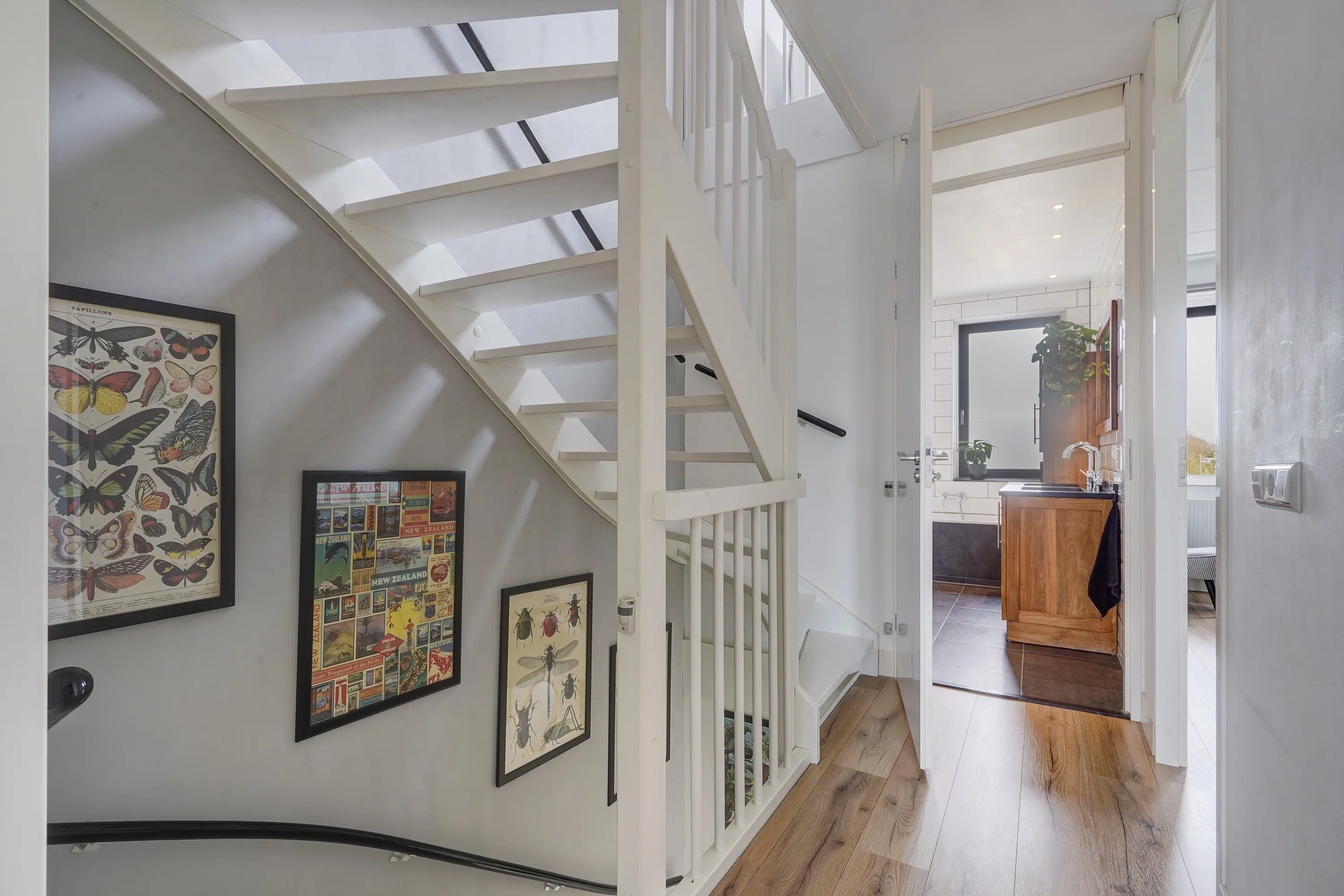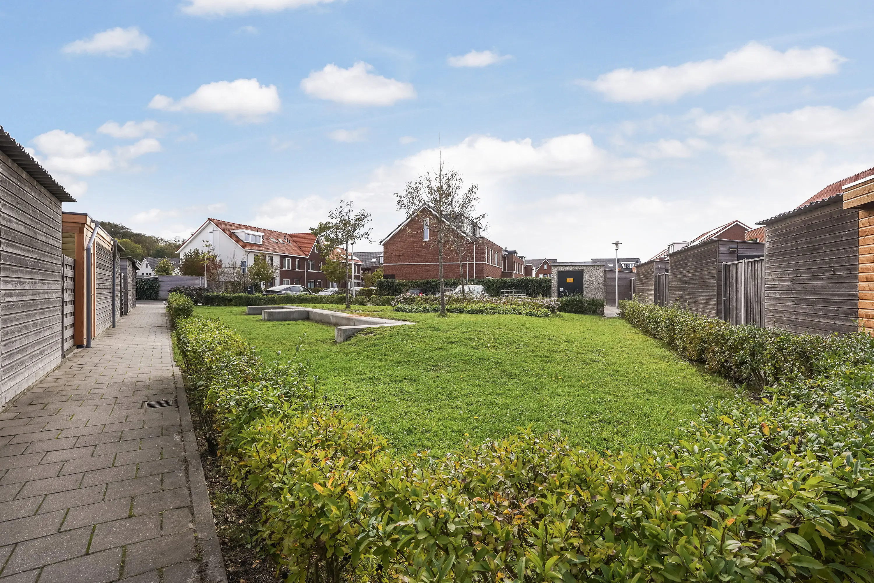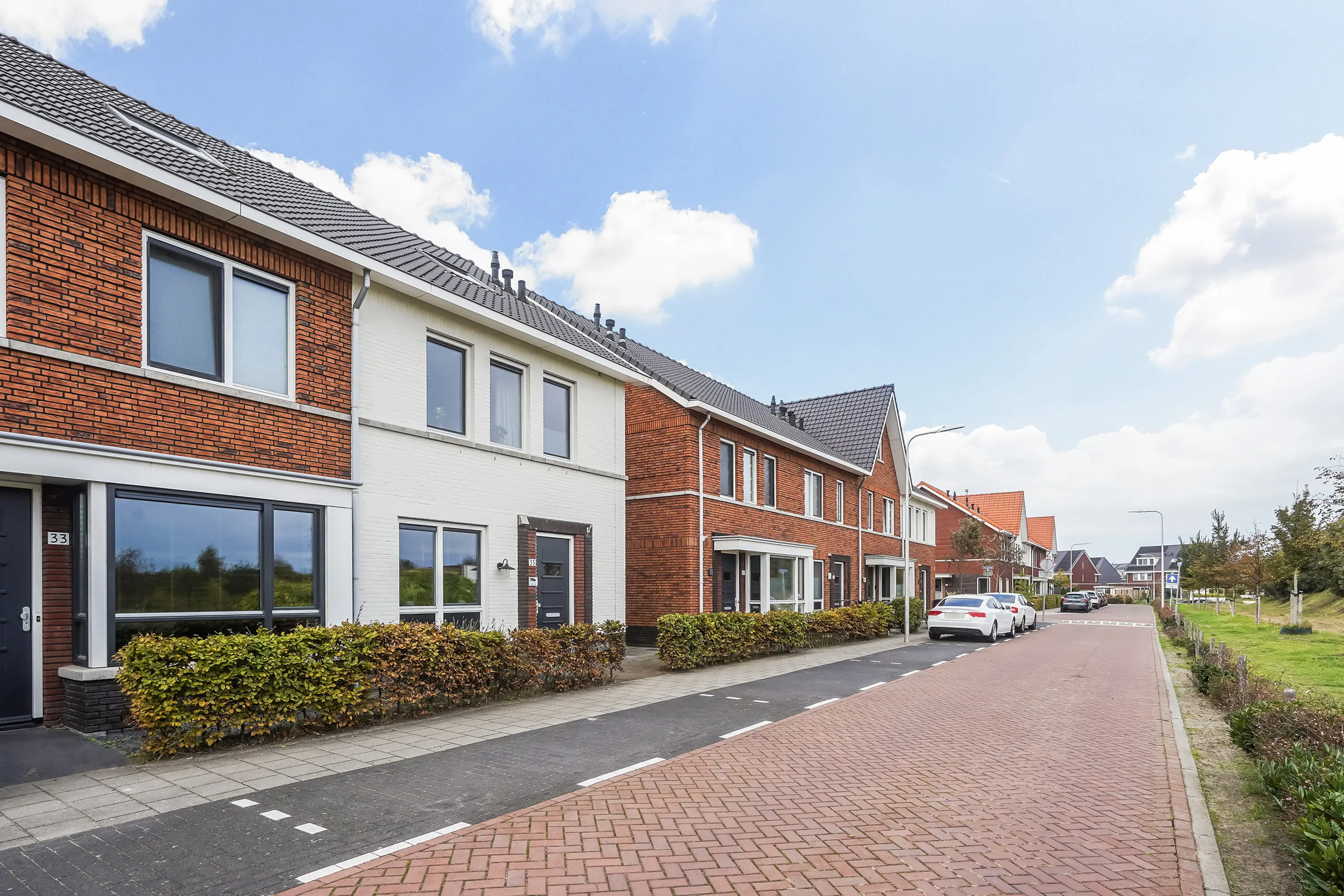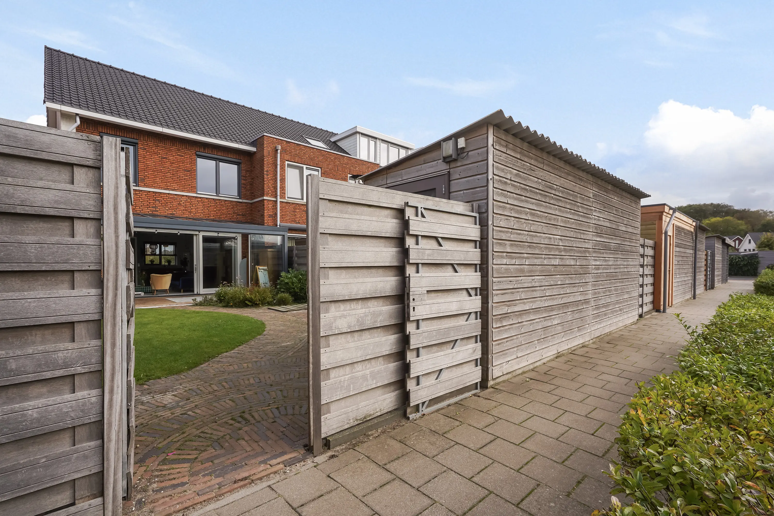 De verzorgde voortuin met lage heg en buitenkraan geeft direct een uitnodigende indruk. De witte gevel springt in het oog en benadrukt het moderne karakter van de woning. Aan de zijkant is een betegeld pad met toegang tot de achterom.