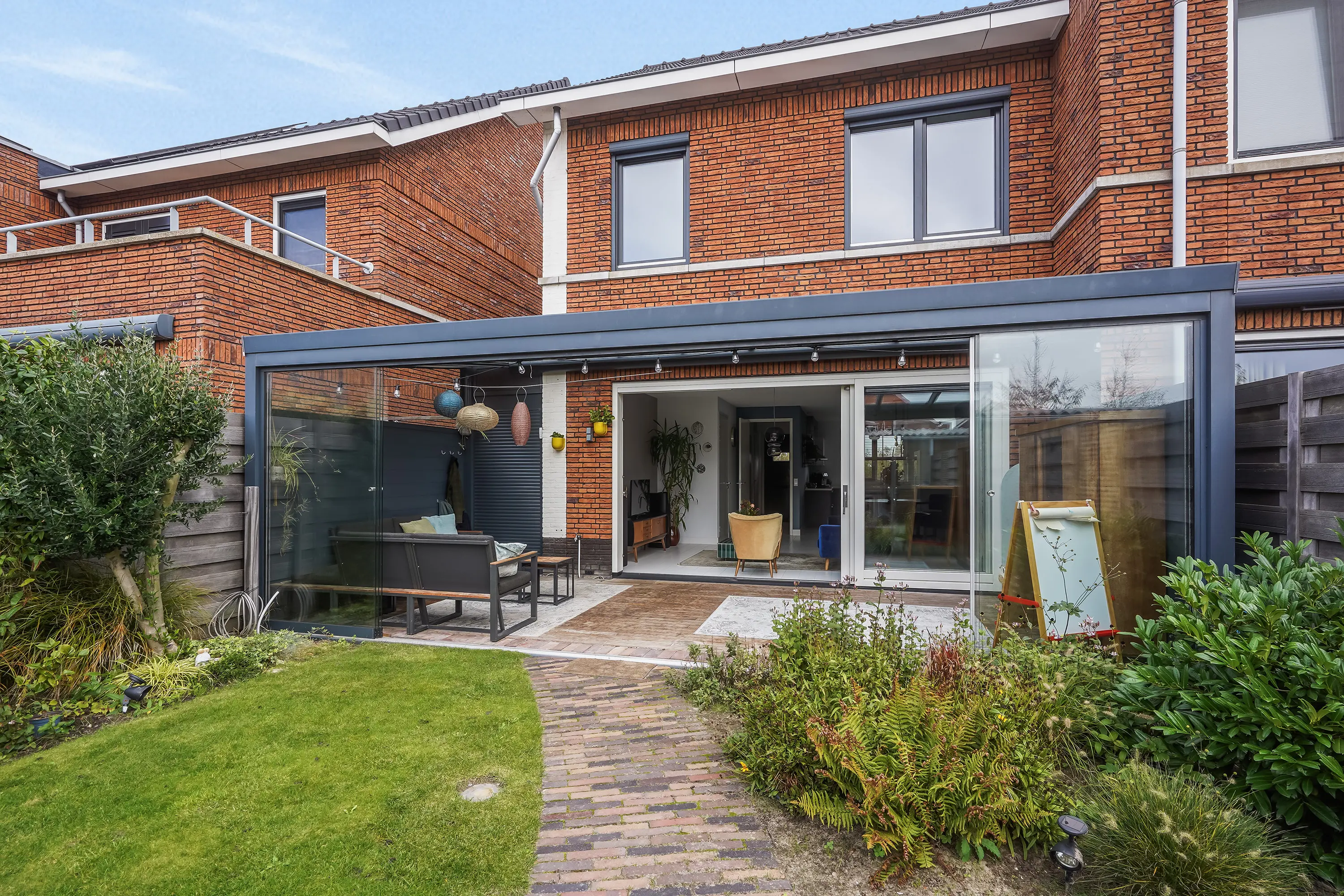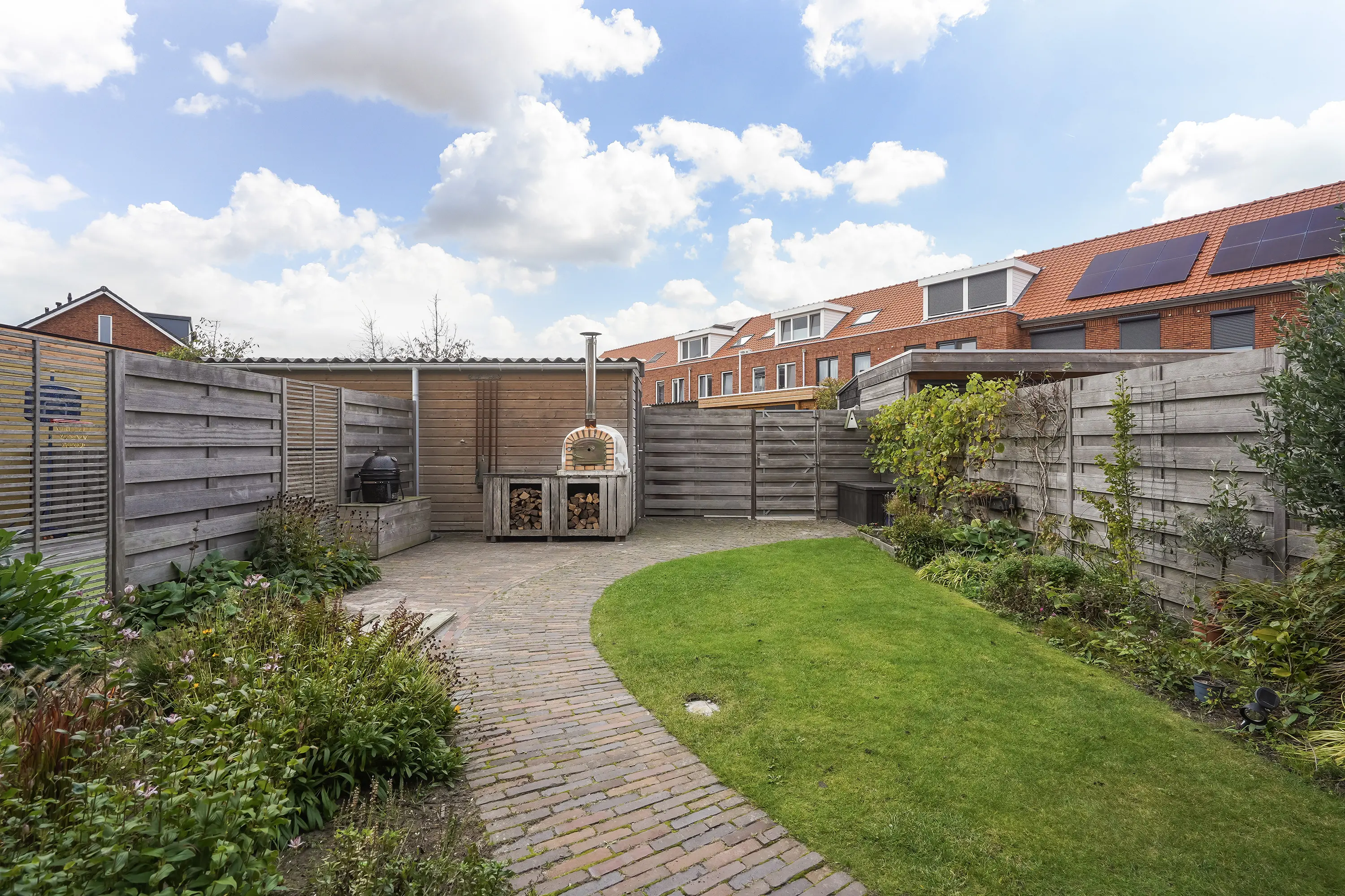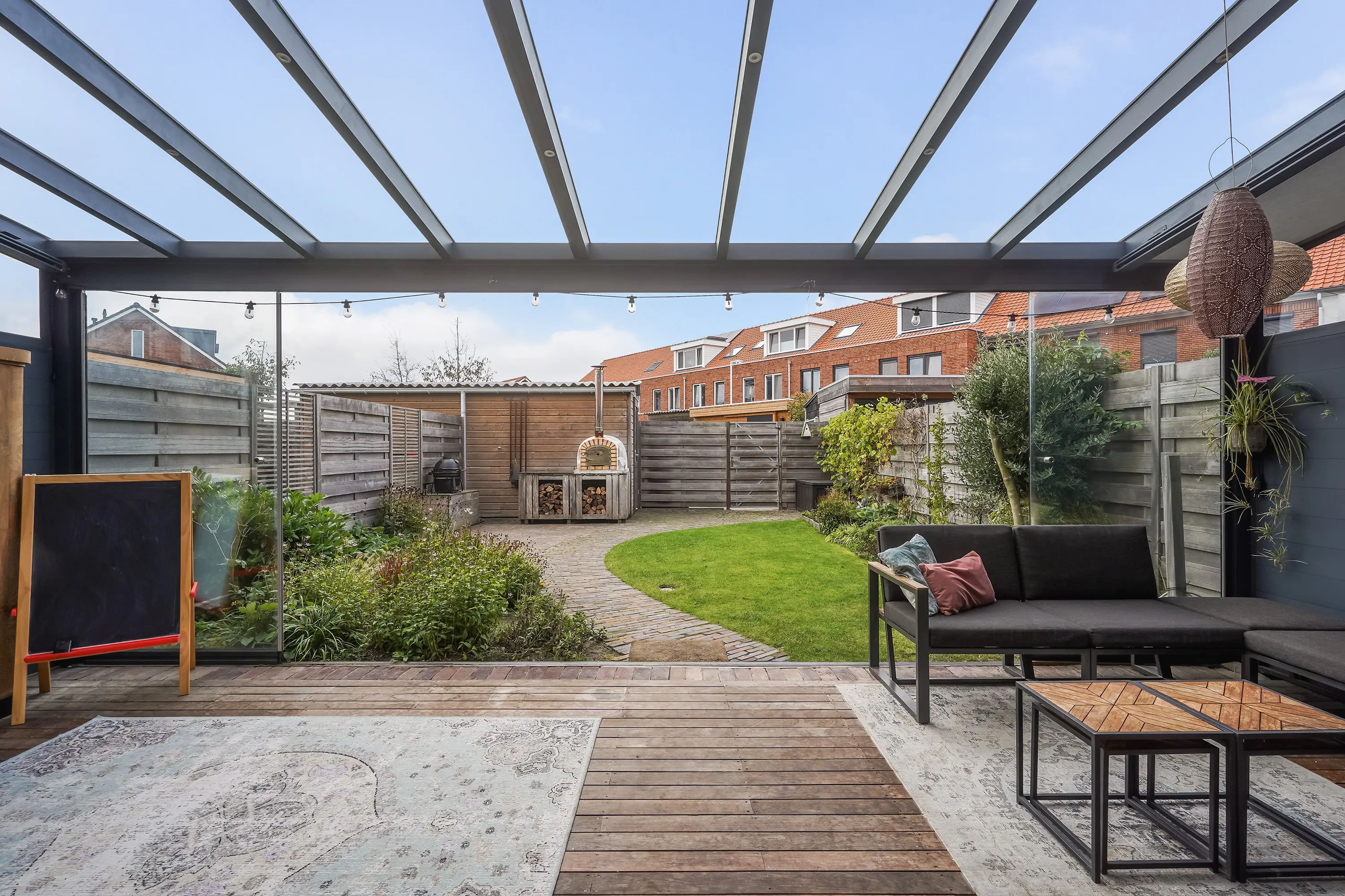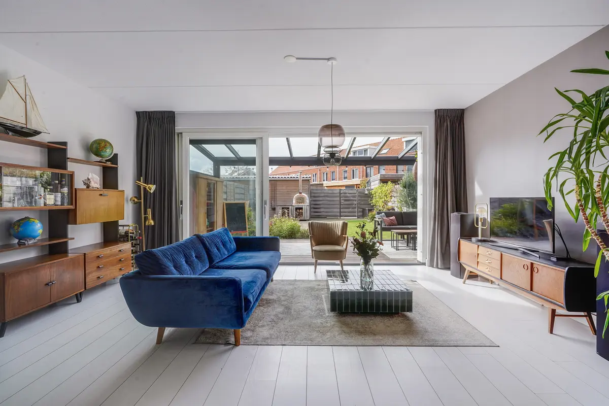 Via de schuifpui wordt buiten moeiteloos bij binnen betrokken. In 2022 is de prachtige tuinkamer gerealiseerd – een overkapping met verlichting, automatische zonwering en glazen schuifwanden, waardoor u in elk seizoen kunt genieten van het buitenleven. De tuin is gunstig gelegen op het zuidwesten, met een mix van gras, groen en sfeervolle gebakken klinkers, en heeft een lengte van maar liefst 12,44 meter (inclusief tuinkamer). Er is zowel een achterom richting het gezamenlijke parkje als een zij-uitgang naar de voortuin.